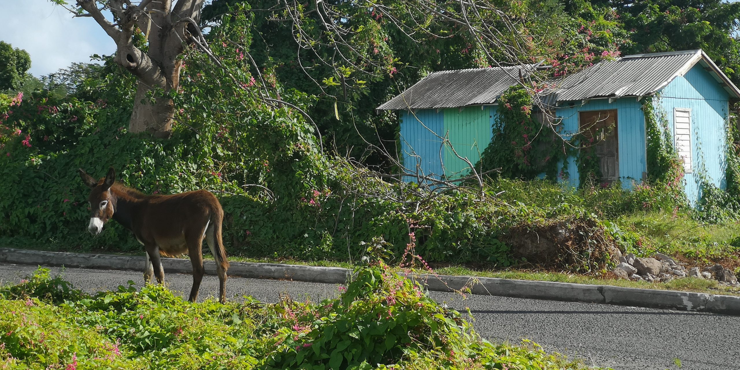 Selbst die Haushunde haben ihr karibisches Holzhaus. Viele wilde Esel gibt es auf Nevis. Früher wurden die Esel als Lasttiere genutzt.