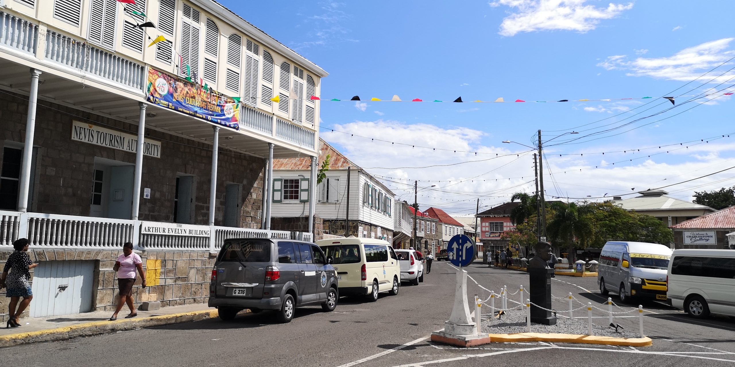 Wir liegen bei Nevis vor dessen Hauptort Charlestown. Entgegen zahlreichen anderen Berichten war das Einklarieren freundlich und zügig. Schwierig ist das Parken des Dinghys vor Charlestown. Der Dinghysteg ist zerstört. Am Pier schwellt es, so dass man entweder eine der Moorings aufpicken muss, um das Heck zu sichern oder einen Heckanker. Solange es weniger Schwell hat, kann man das Dinghy auch unter das Pier legen. Kraxelig ist das Aussteigen in beiden Fällen.