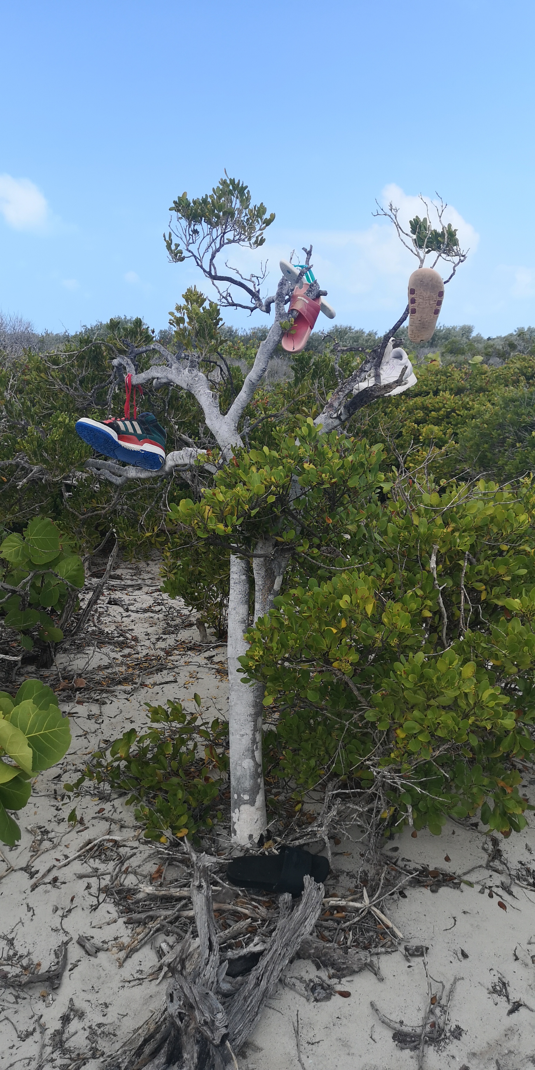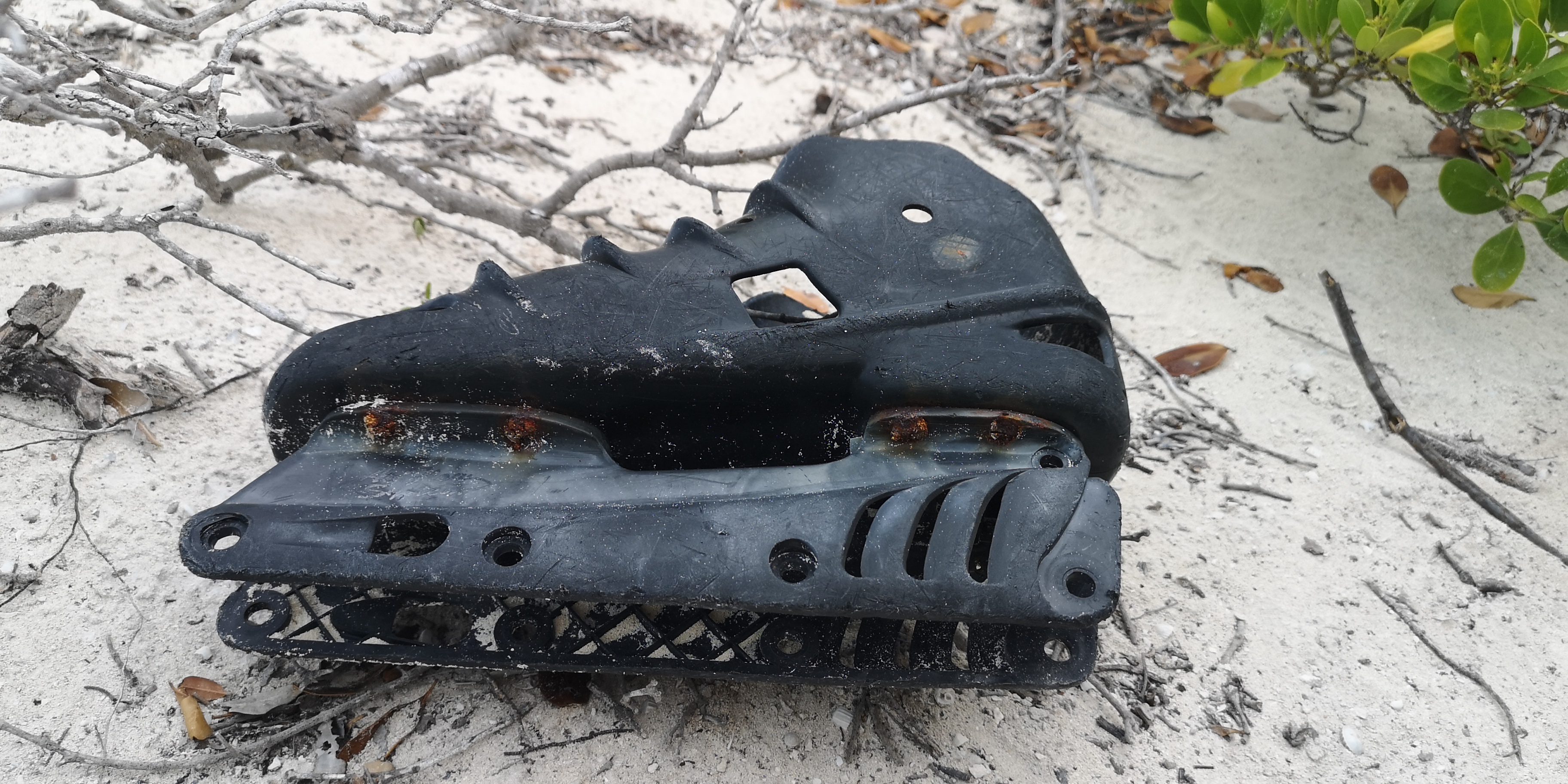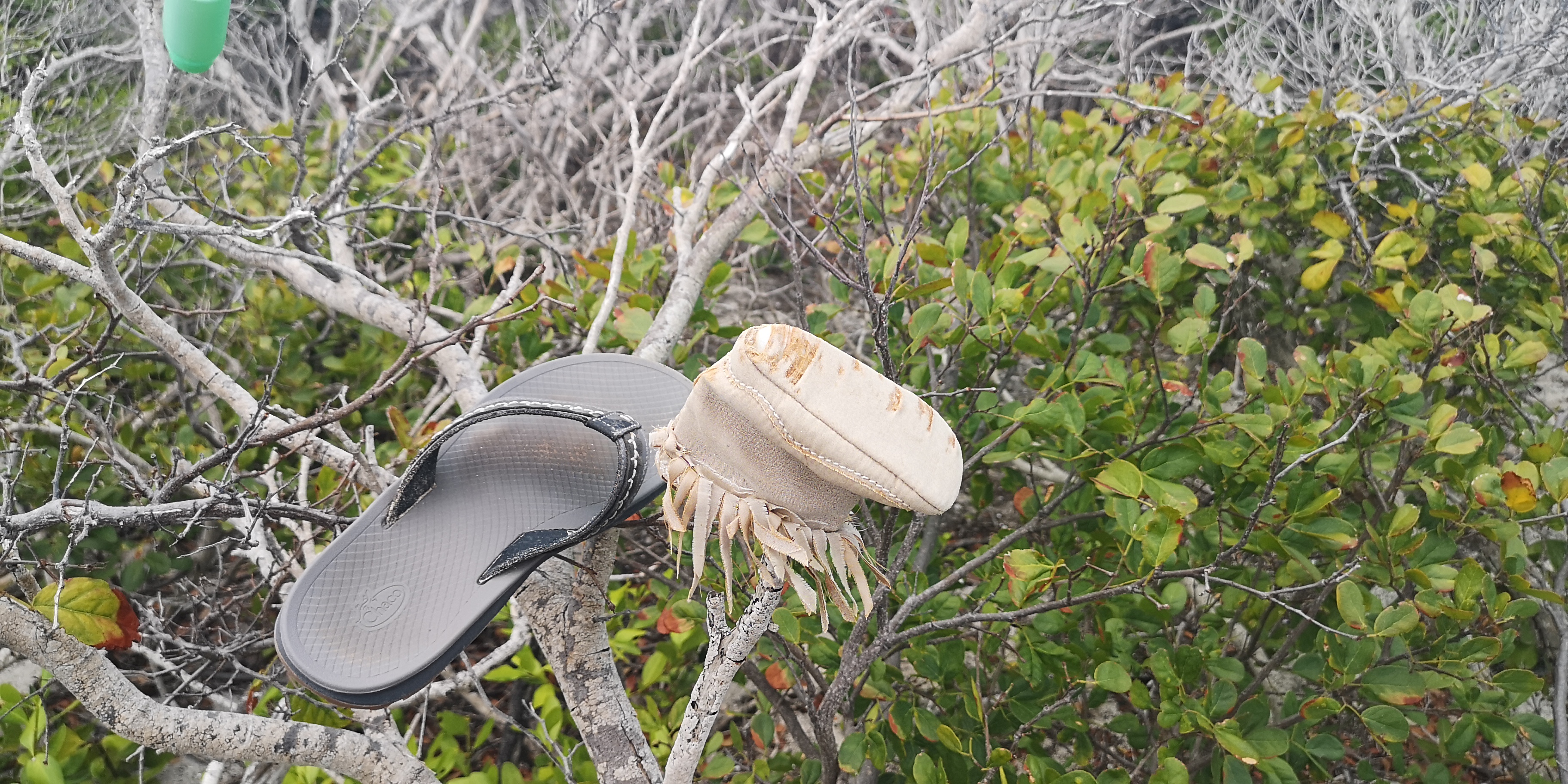 Nicht romatisch ist das Müllaufkommen an der Ostküste von Hog Cay. An die dem Wind ausgesetzten Strände spült das Meer den Zivilisationsmüll. Sogar Rollerblades, einzelne, finden wir. Definitiv nicht von den Bahamas. Und erstaunlich viele Bauarbeiterhelme.