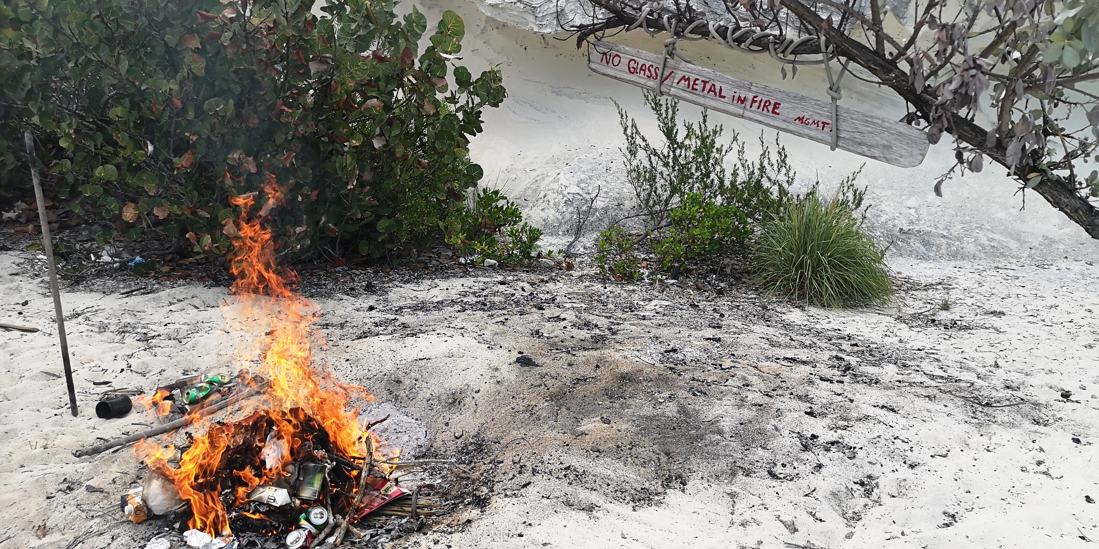 Als wir unseren Müll bei Ankunft in Great Inagua entsorgten, war uns das noch nicht bewusst. Wir haben dazu gelernt. In Zukunft werden wir, wie die anderen Segler auch, organischen Müll auf offener See entsorgen und alles, was brennbar ist – selbst verbrennen. Eine entsprechende Stelle ist nahe des „Hog Cay Yacht Clubs“ vorhanden und ich schreite zur Tat: