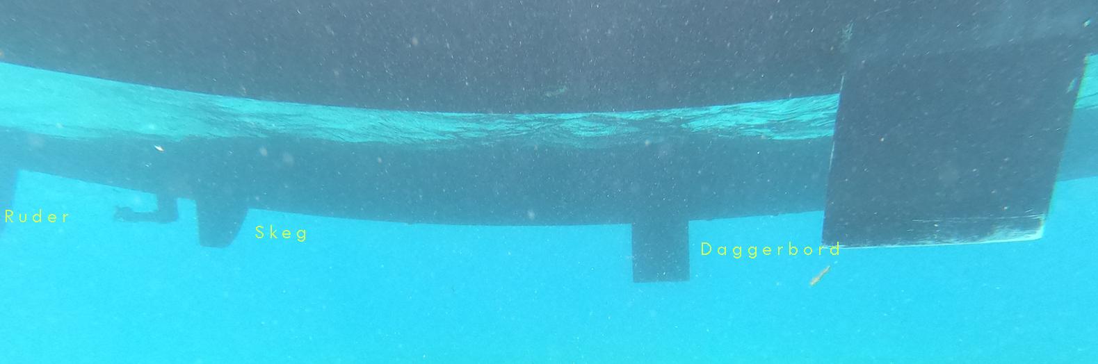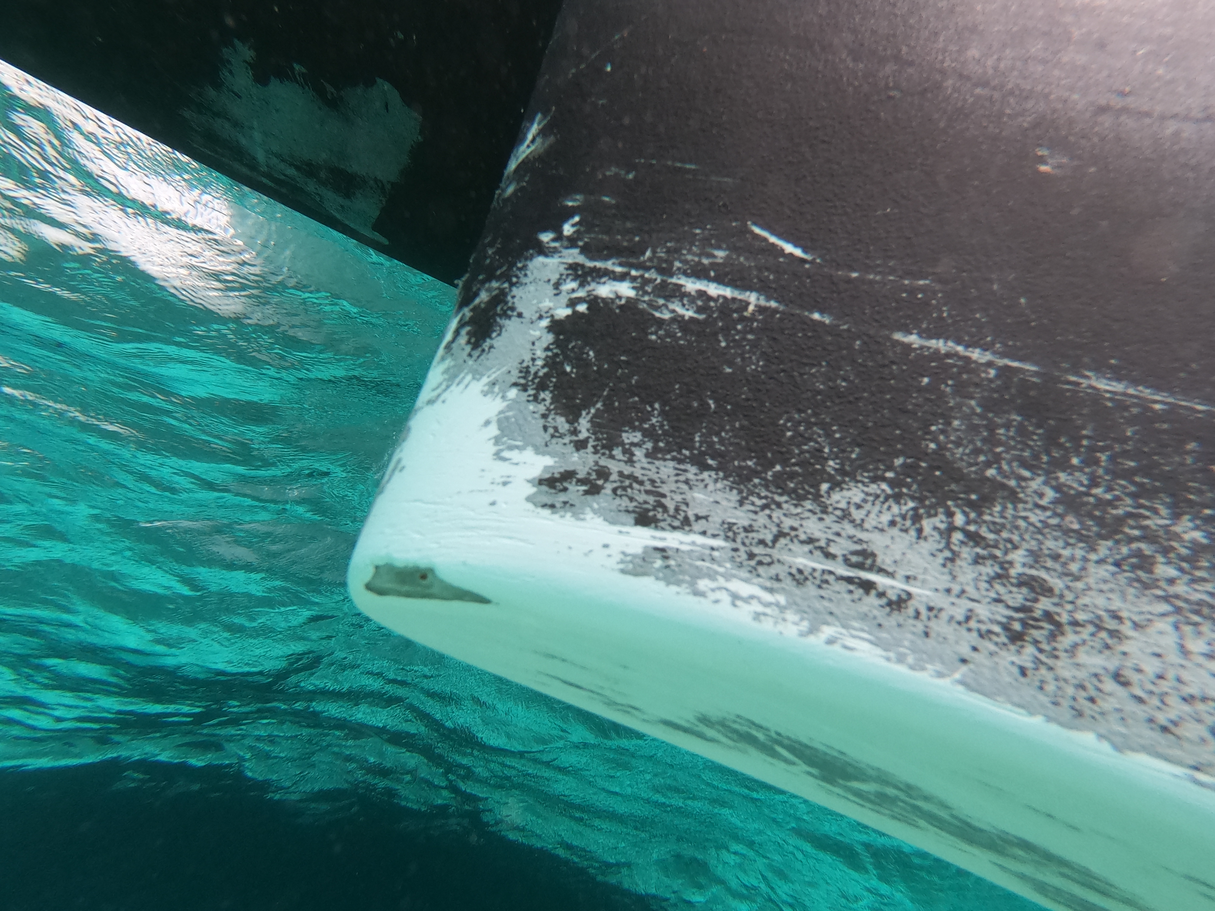 Glück gehabt: Die Ruder sind völlig unberührt, nur die beiden Daggerbords haben deutliche Schleifspuren am Boden. Da ist kein Antifouling mehr, stellenweise ist das Gelcoat ab und das GfK Laminat sichtbar. No problem! Das sind Peanuts, die werden in Grenada behoben.