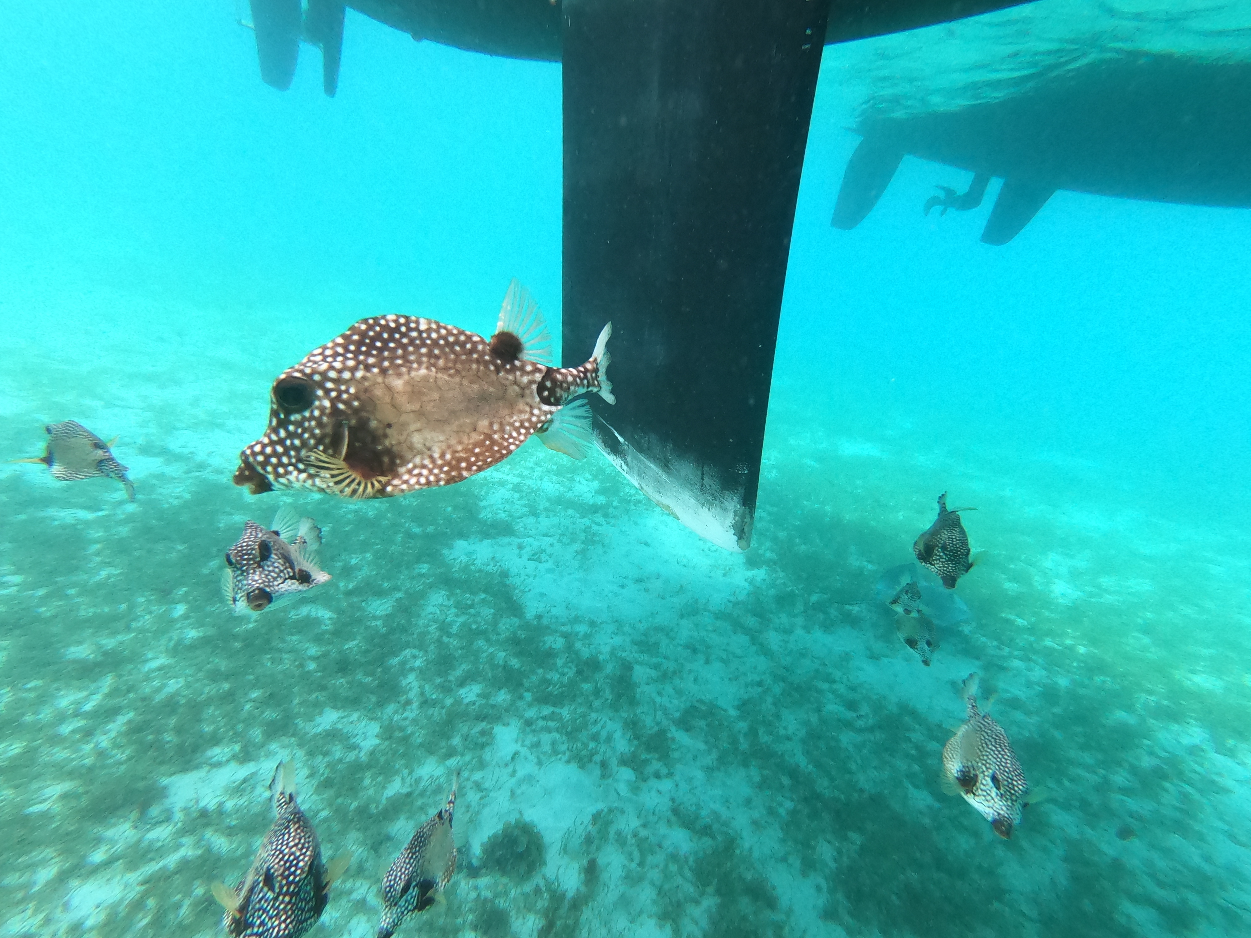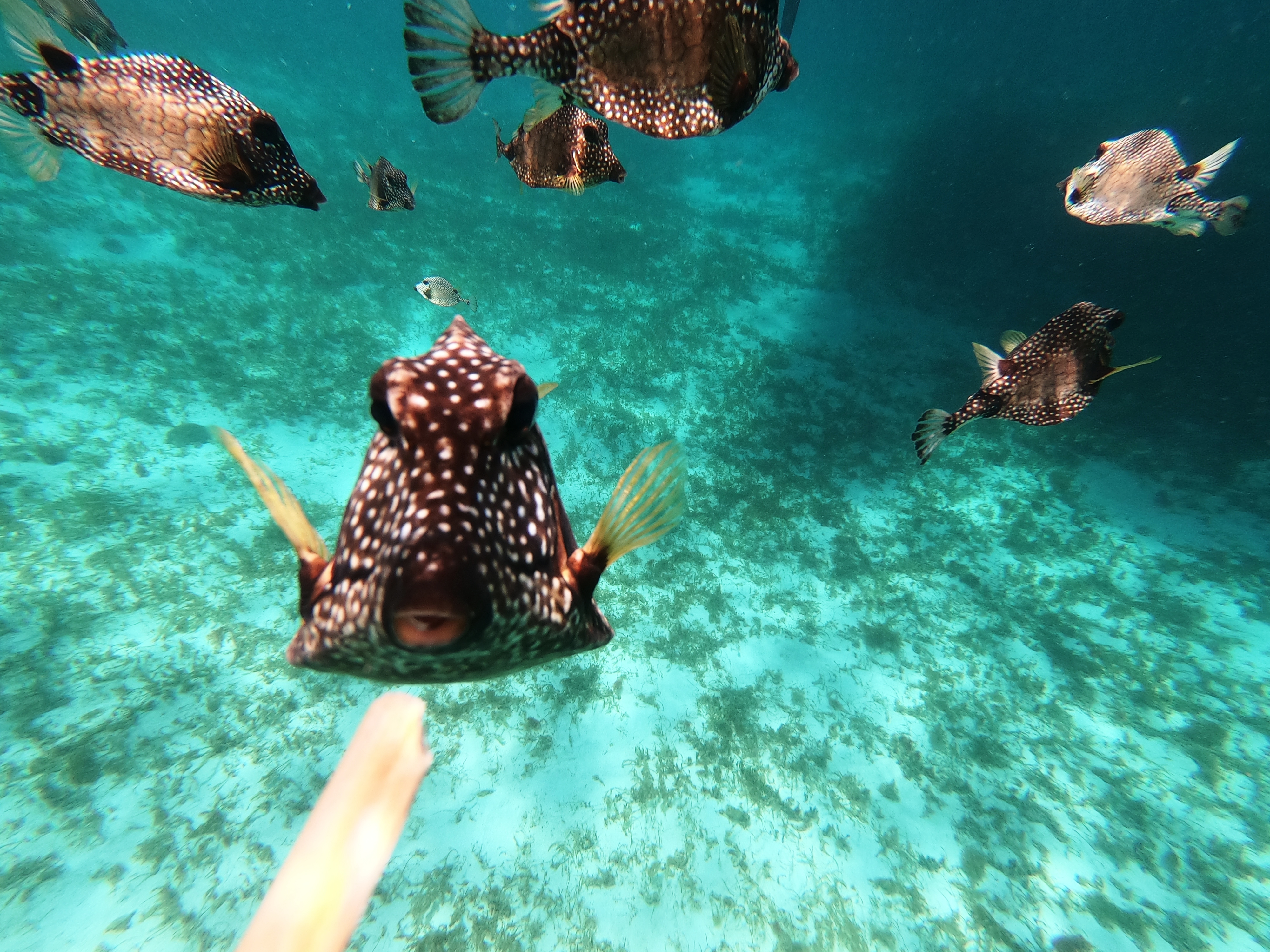 Das Daggerbord – und diverse Kofferfische, die von meiner GoPro magisch angzogen werden. Immer wieder schwimmen sie mir genau vor die Linse. Ein fieses Ablenkungsmanöver –  denn gleichzeitig beisst mich ein anderer in die Finger der anderen Hand. Mehrmals!