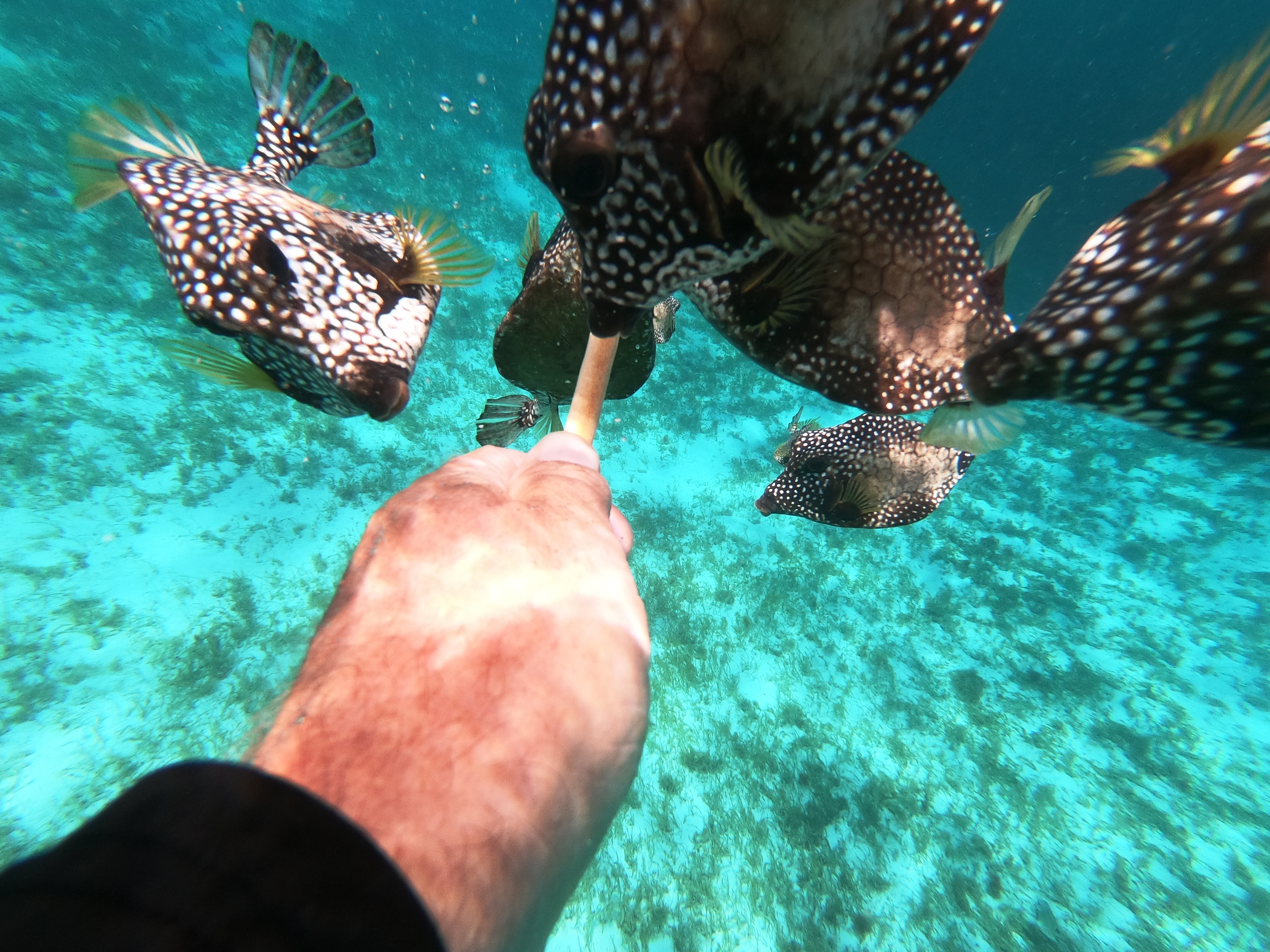 Später steige ich, mit ein paar Grissini-Stäben (ein italienisches Gebäck) und der GoPro bewaffnet, wieder ins Wasser. Sie knabbern begierig am Grissini – aber nicht nur. Der eine oder andere beisst mich ungeniert in die Finger!