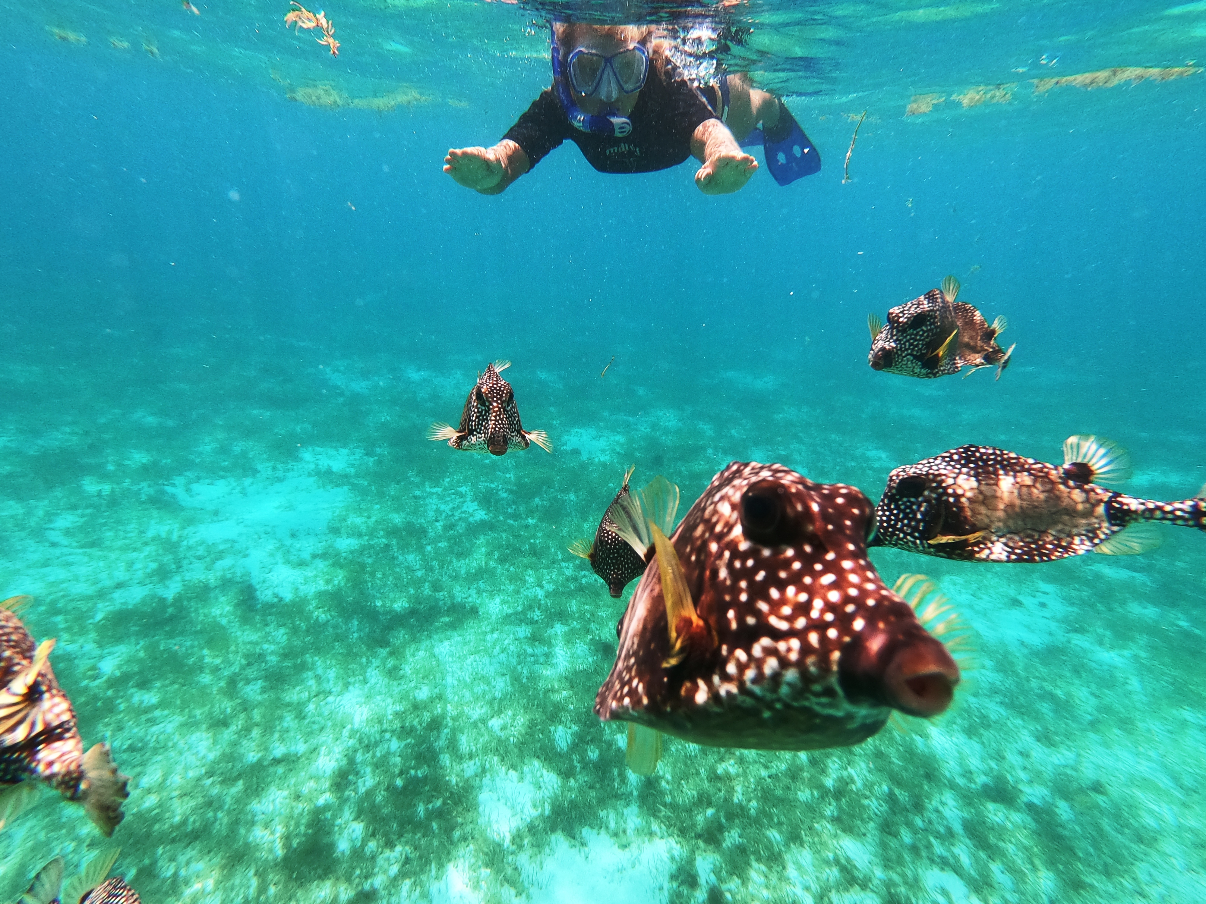 Als Belohnung für den Schrecken haben wir die Tobago Cays fast für uns allein. Kaum im Wasser, um das Unterwasserschiff zu inspizieren, werde ich von Kofferfischen umzingelt. Sie kommen mir so nahe und lassen sogar zu, dass ich sie berühre! Dabei erfahre ich „hautnah“, dass diese Fische keine Schuppen sondern einen richtig harten Panzer haben. Ich kann sie am Rücken richtig anfassen – unglaublich.