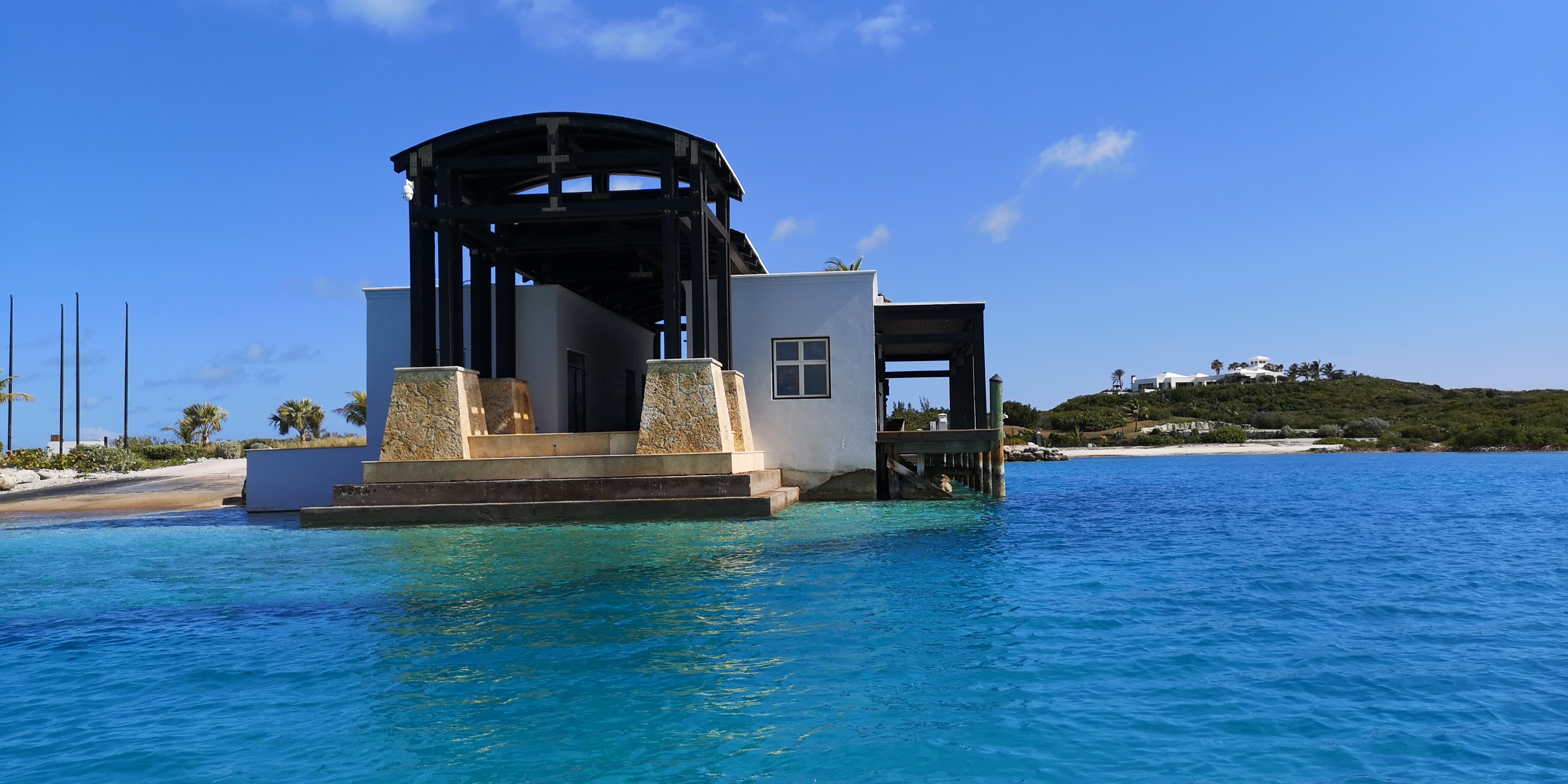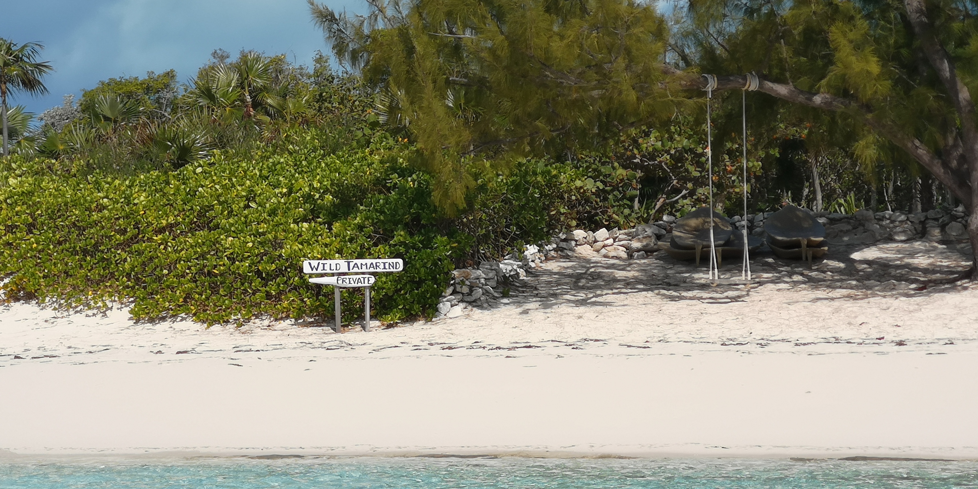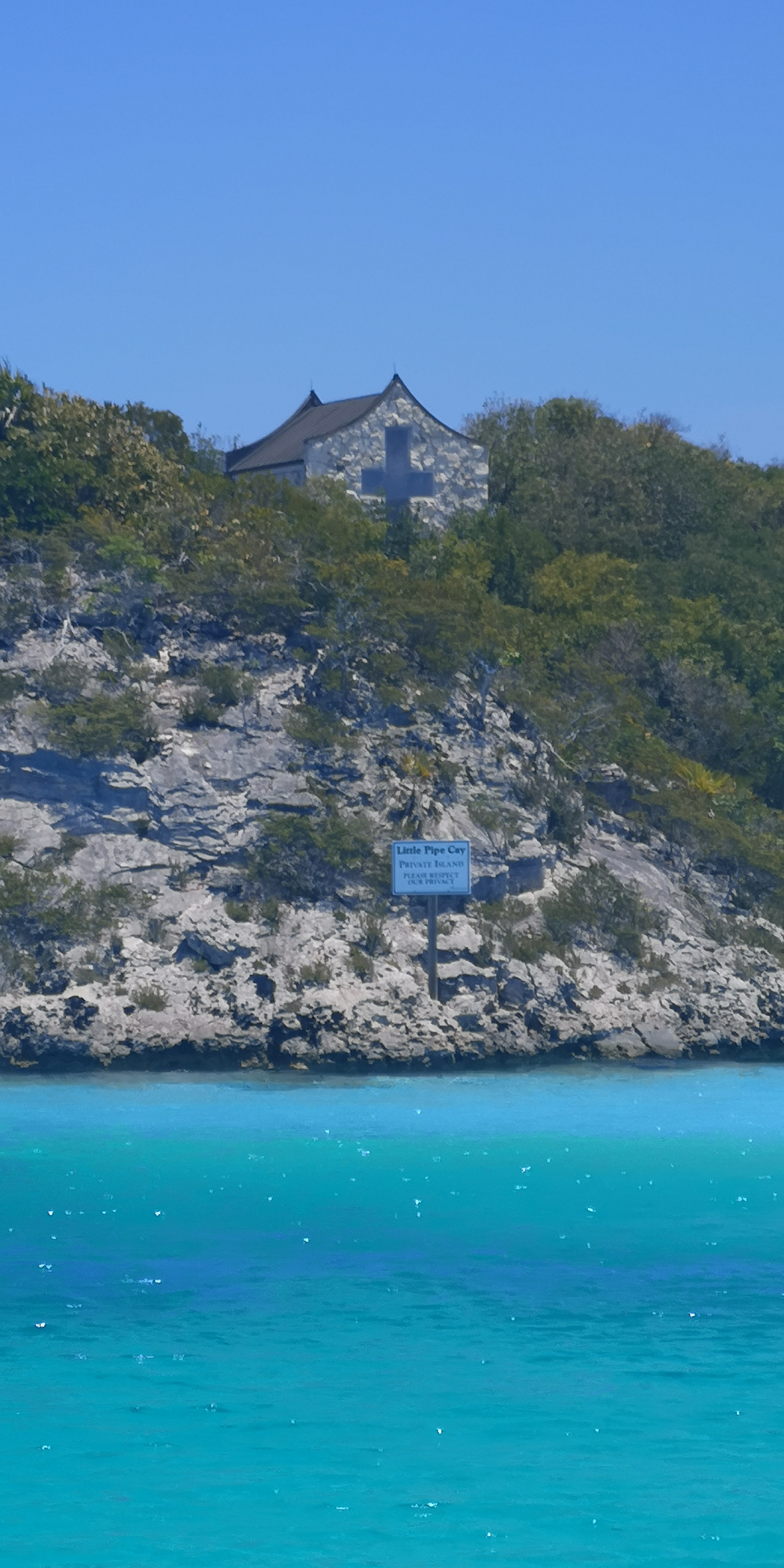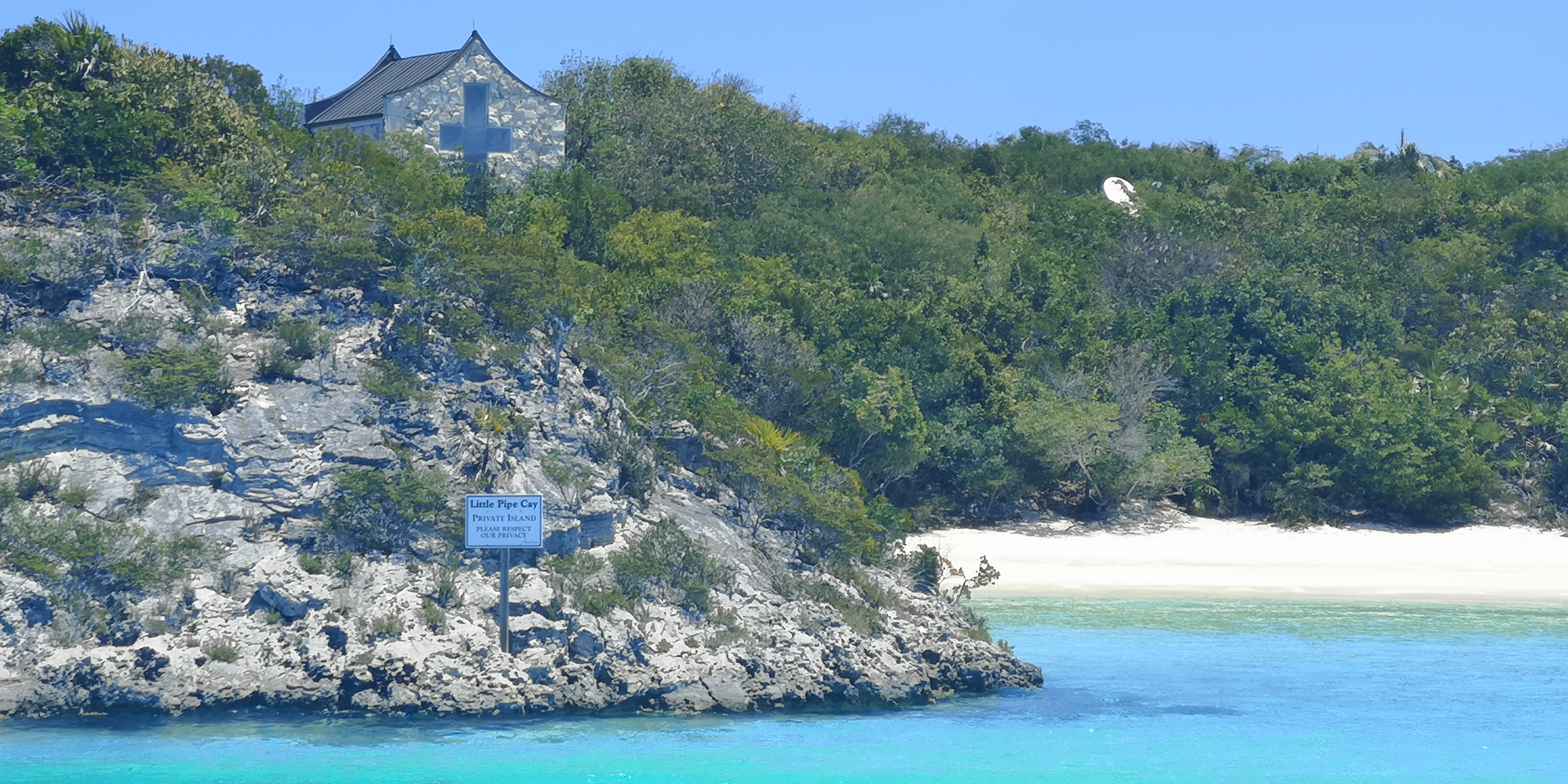 An Steuerbord ein Strand mit luxuriöser Villa und einer kleinen Kapelle. Sonnenliegen an einem Palmenstrand. Und ein Schild an diesem wie an den weiteren Stränden der Insel, wonach dies Privatgebiet ist und man bitte die Privatsphäre respektieren möchte.