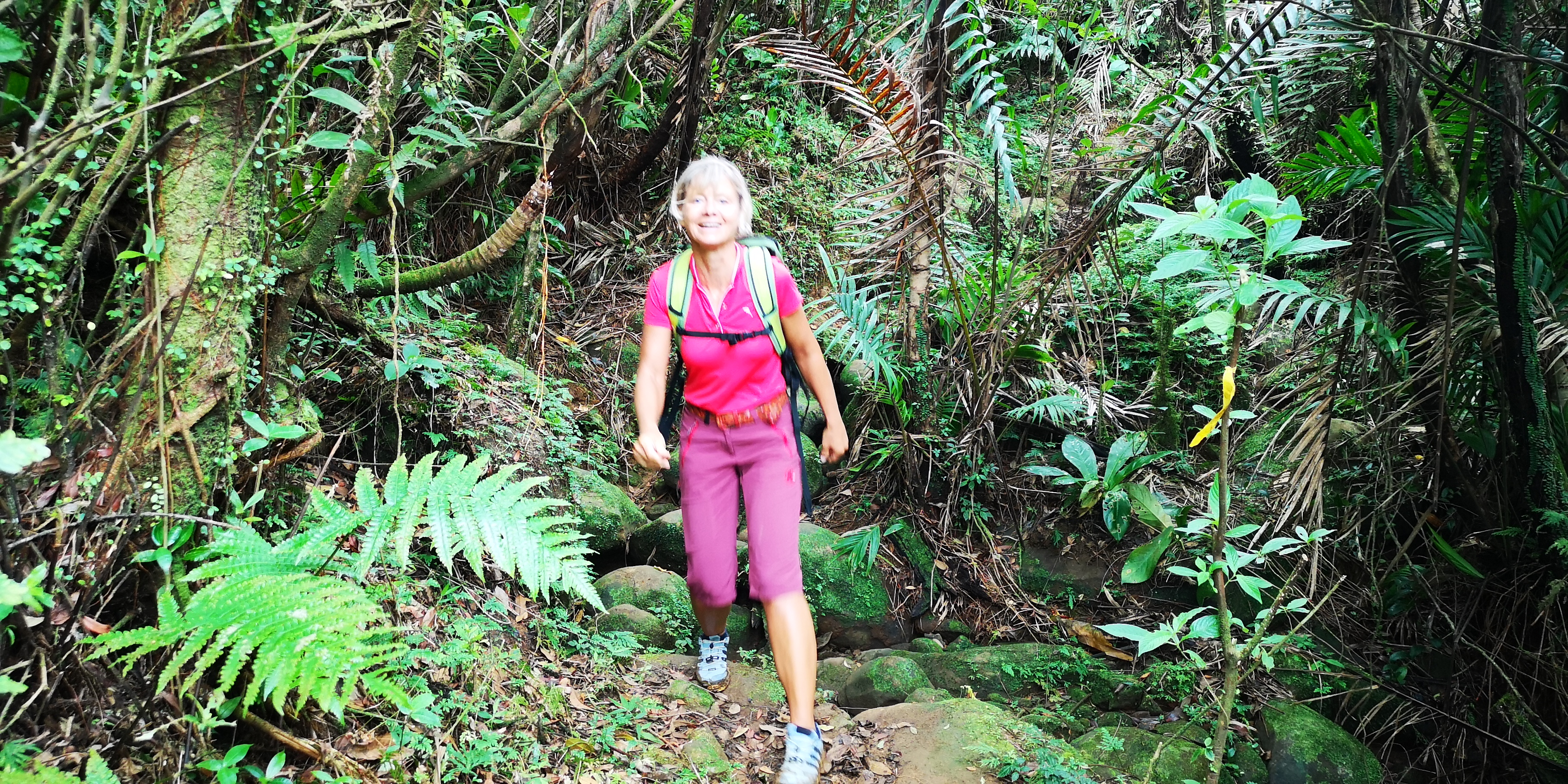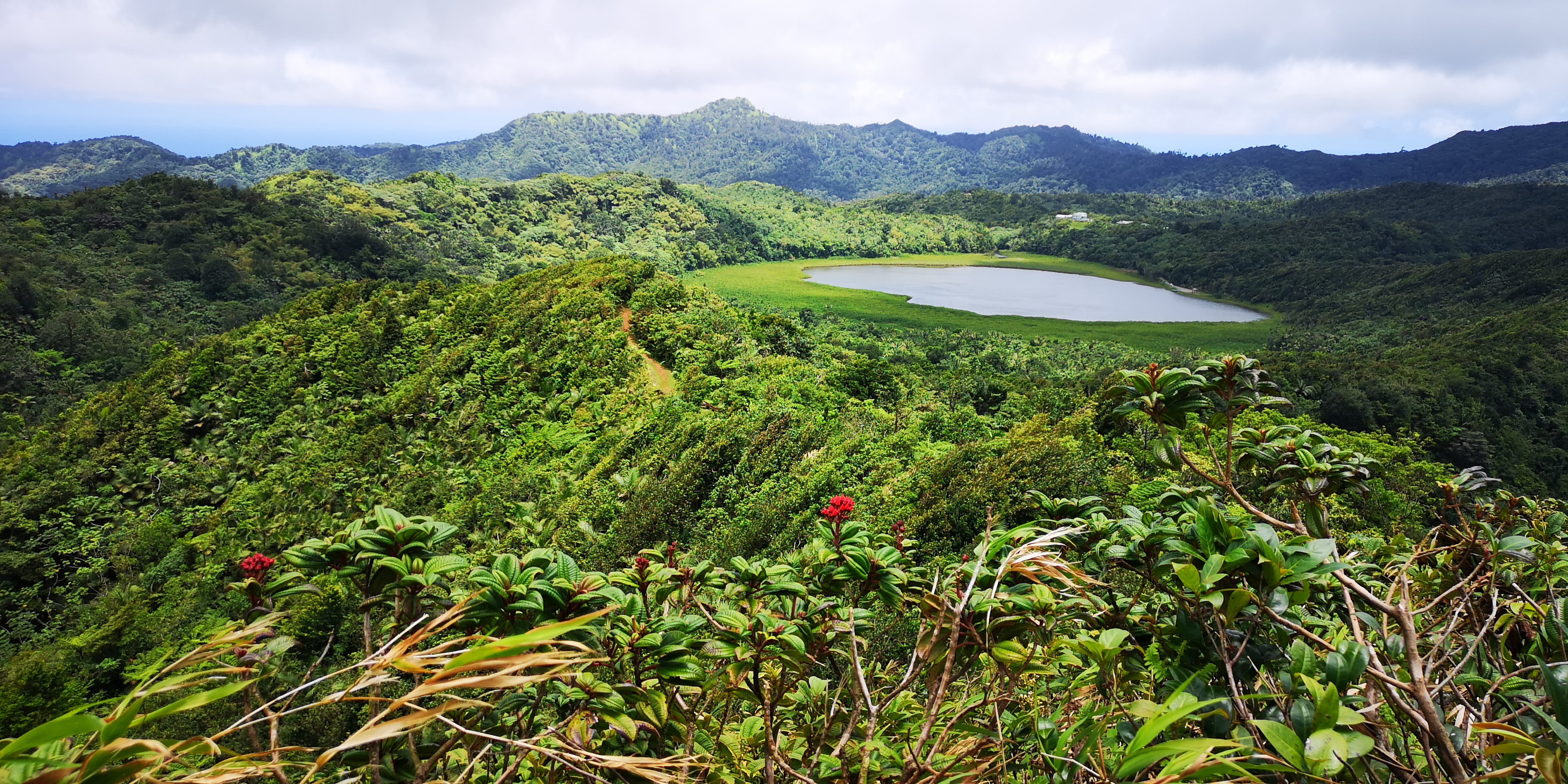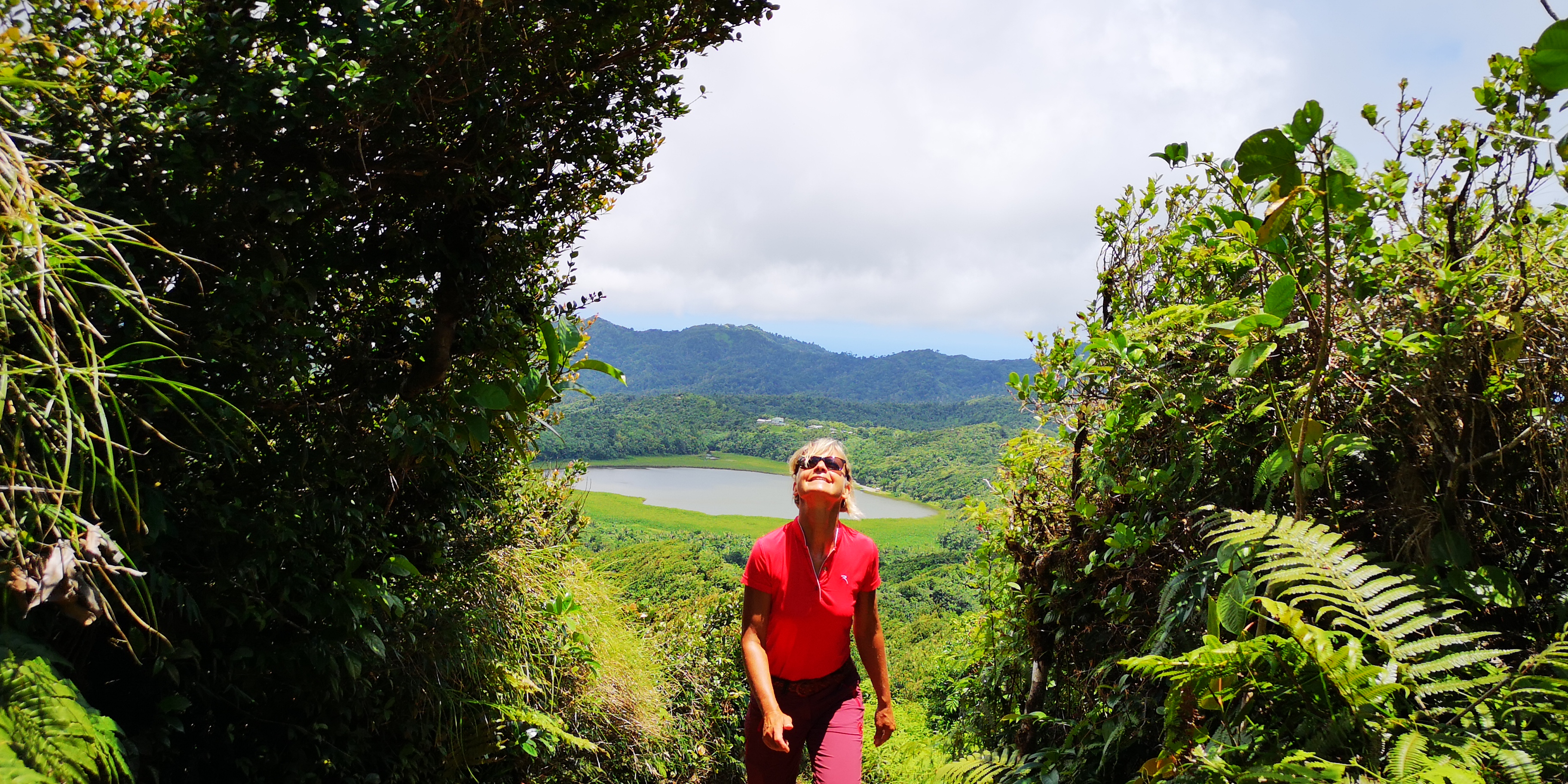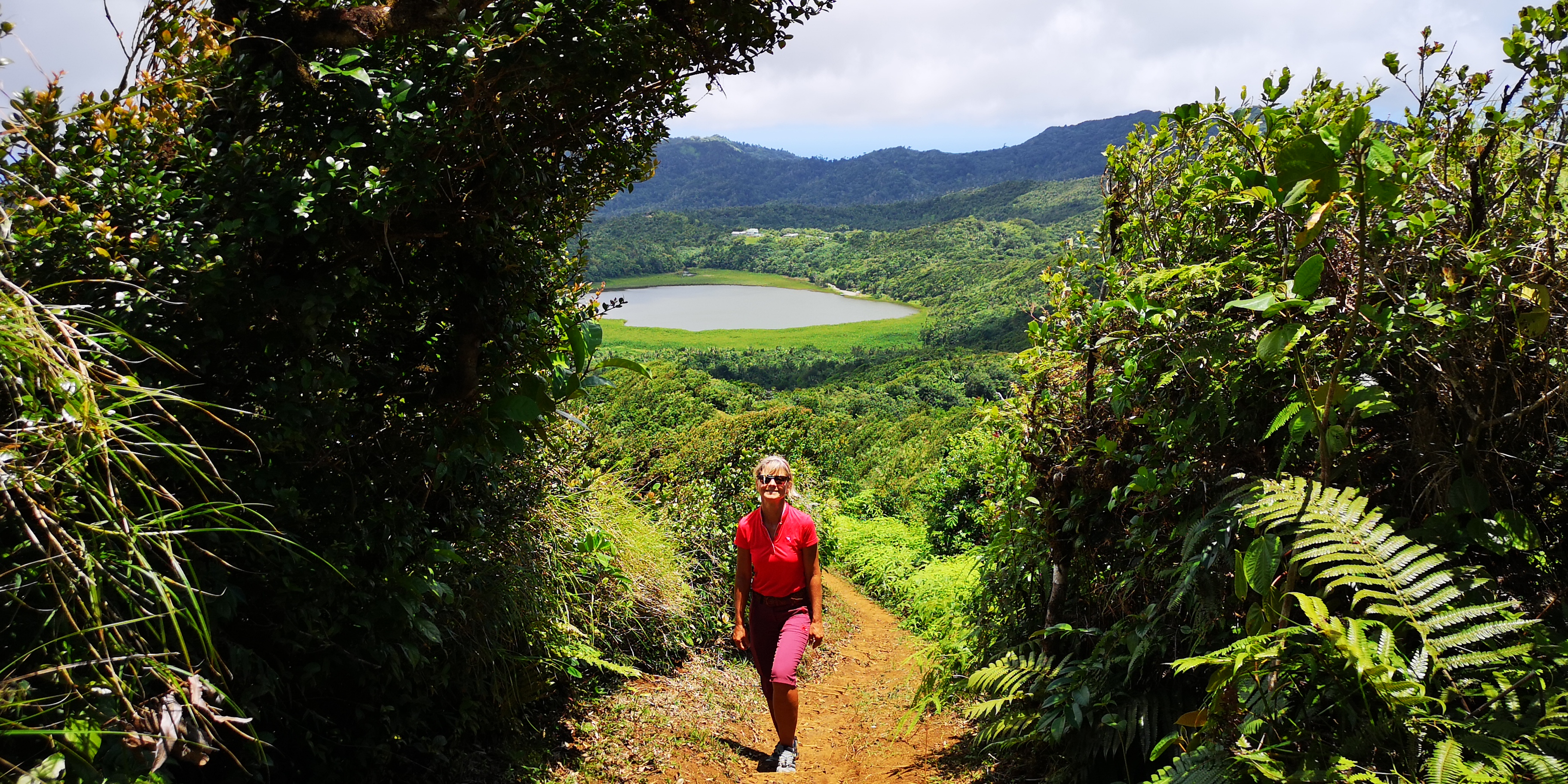 Mit dem Minibus erreichen wir auch den Grand Etang, den größten Süßwassersee auf Grenada. Der Zutritt kostet und führt zunächst zu touristischer Infrastruktur, die man sich an Tagen mit Cruiseship mit vielen Menschen teilt. Wer wie wir direkt zum See geht, lässt die Massen aber schnell hinter sich. Auf unserer Wanderung vom See auf den Mount Quaqua begegnet uns eine Wanderin. Die anschließende Wanderroute zu den Concord Falls haben wir für uns allein.