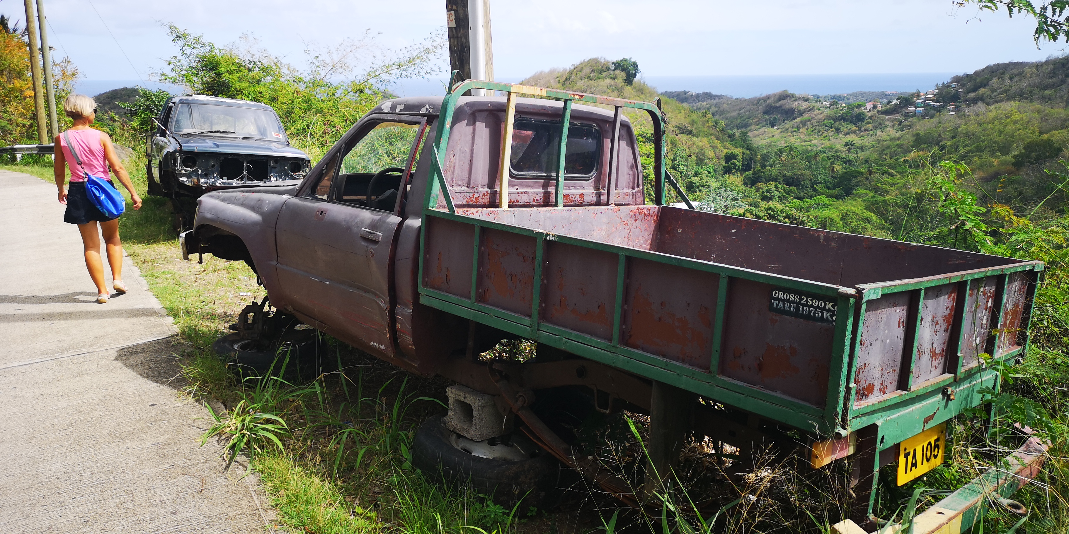 Wir bevorzugen die öffentlichen Minibusse, die von unserem Ankerplatz in der Prickly Bay gut erreichbar sind. Mit dem Dinghy geht es zur Budget Marina, von dort rechts raus an der Straße entlang bis zum Verkehrskreisel. Die Minibusse mit der Ziffer 1 fahren werktags alle Naselang dort vorbei, allerdings ohne festen Zeitplan. Einfach hinstellen, Hand raus, wenn der Bus kommt, und für 2.50 Eastcaribbean Dollars, das ist weniger als 1 Euro, auf nach St George ’s. Der Minibus fährt bis zum Busterminal. Routenpläne der Buslinien gibt es online oder auf Anfrage in der Touriinfo. Am Busterminal hängen Preislisten aus, die auf Nachfrage auch jeweils im Minibus erhältlich sind. Im Regelfall erspäht am Terminal ein hilfreicher Geist den ankommenden Touri und hilft, den passenden Anschluss zu finden. Warten, bis alle Plätze voll sind, dh zumeist in jeder Reihe vier Leute mit engem Körperkontakt und angezogenen Beinen (gut, dass meine nicht so lang sind), und los geht die Fahrt.