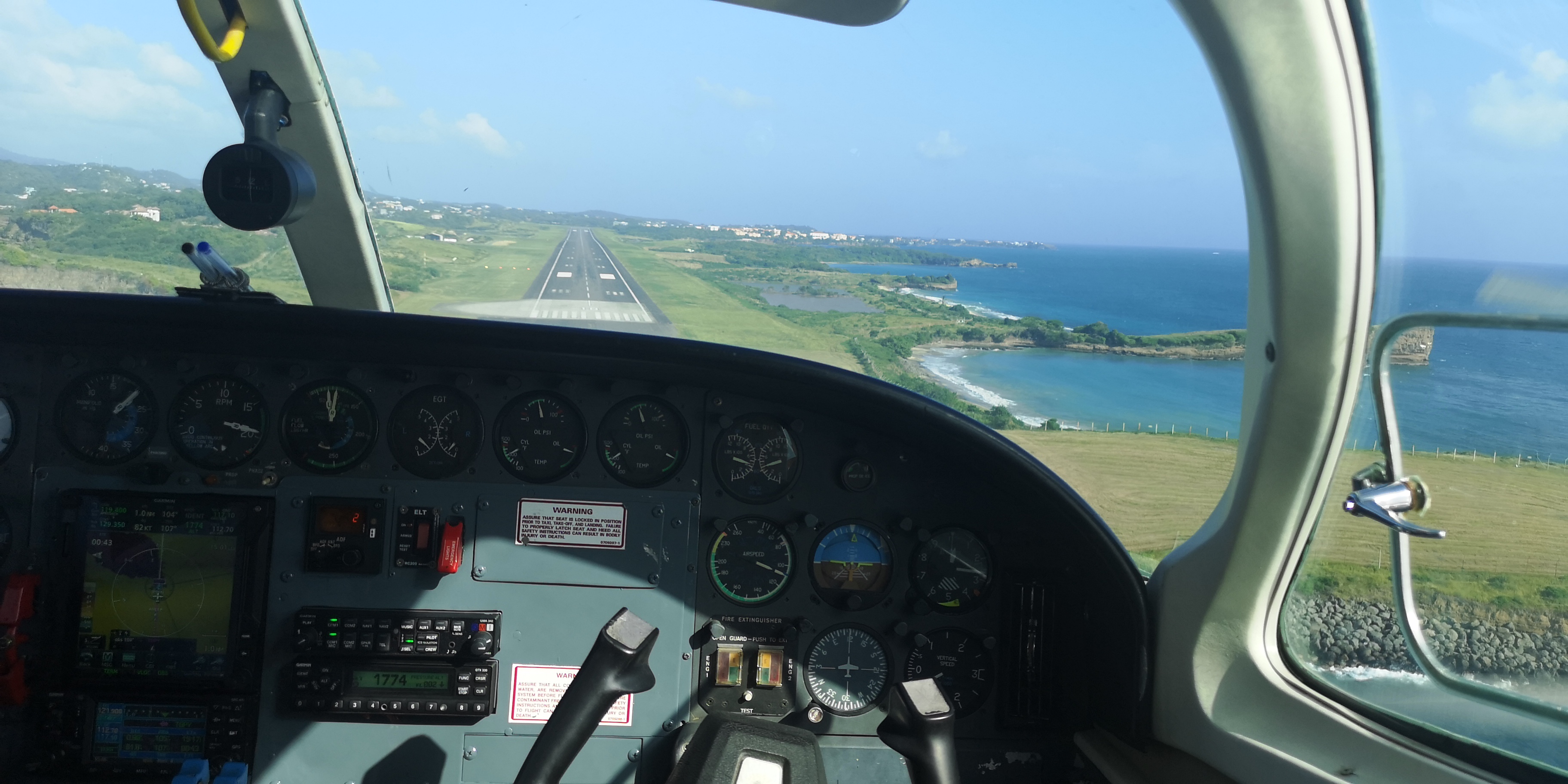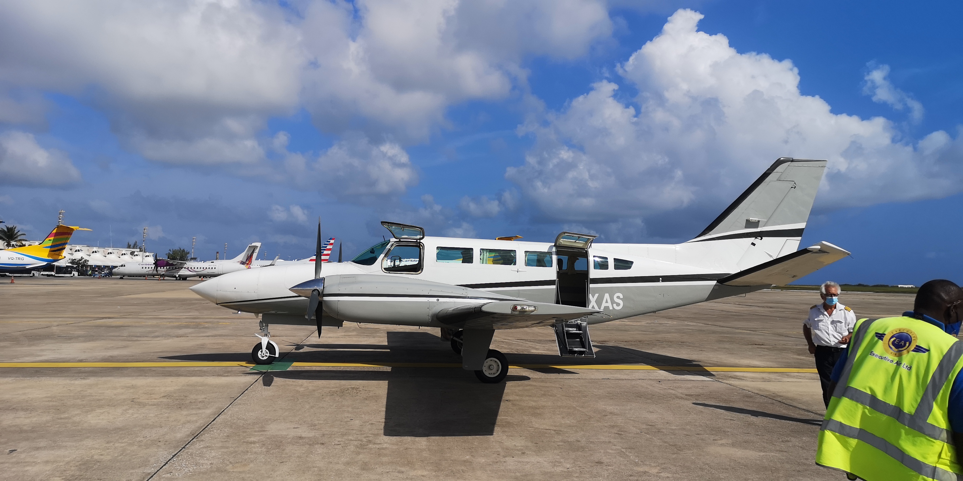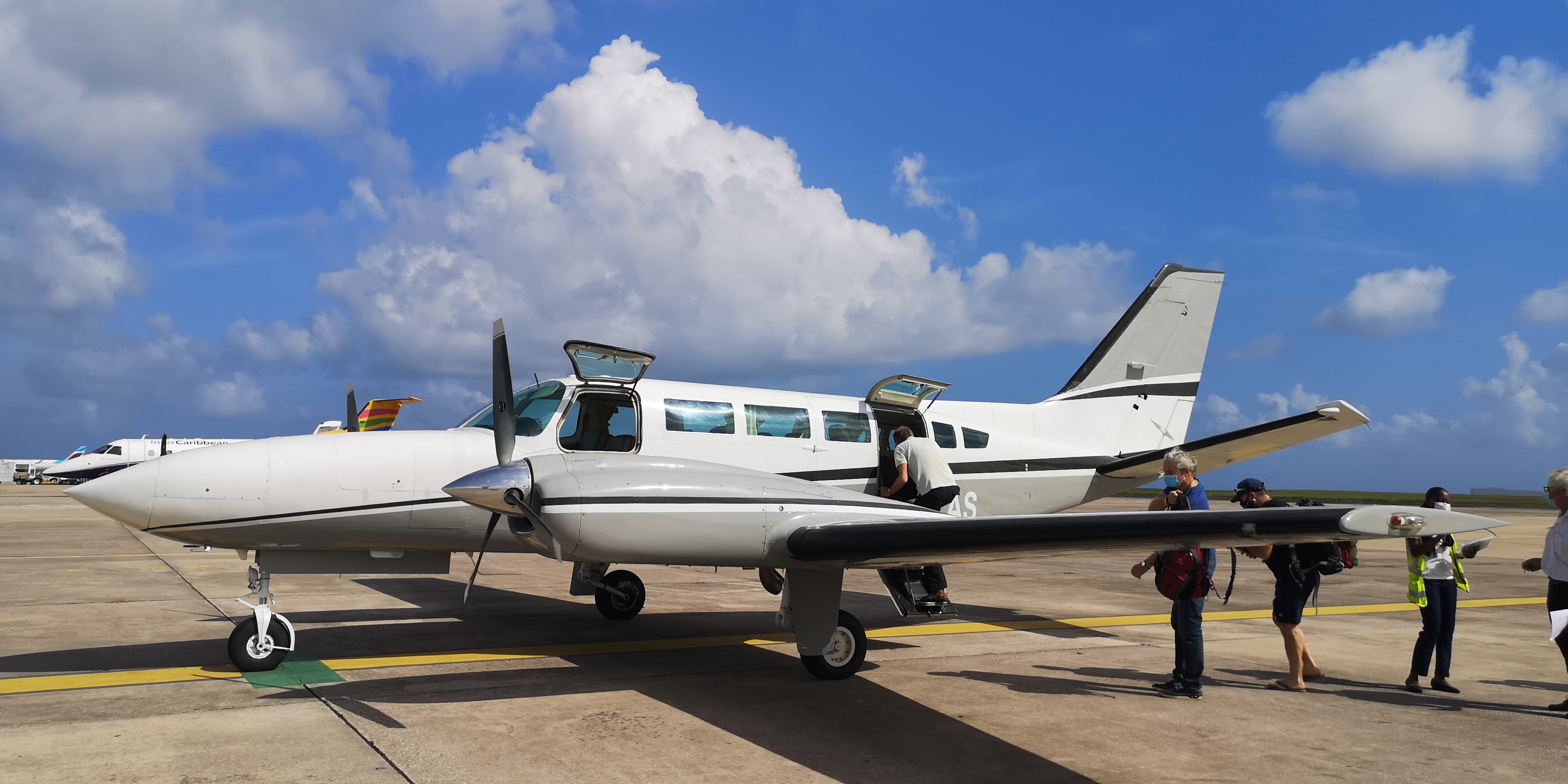 Am nächsten Tag, es ist Samstag, die gute Nachricht: Air Arawak aus Martinique hat Kapazitäten frei und kann uns, sofern wir zügig die Formalitäten erledigen, schon gegen Mittag raus holen. Eine 10-sitzige Cessna 404, die mit max. 7 Passagieren und Gepäck beladen wird, stünde zu einem passablen Preis parat.