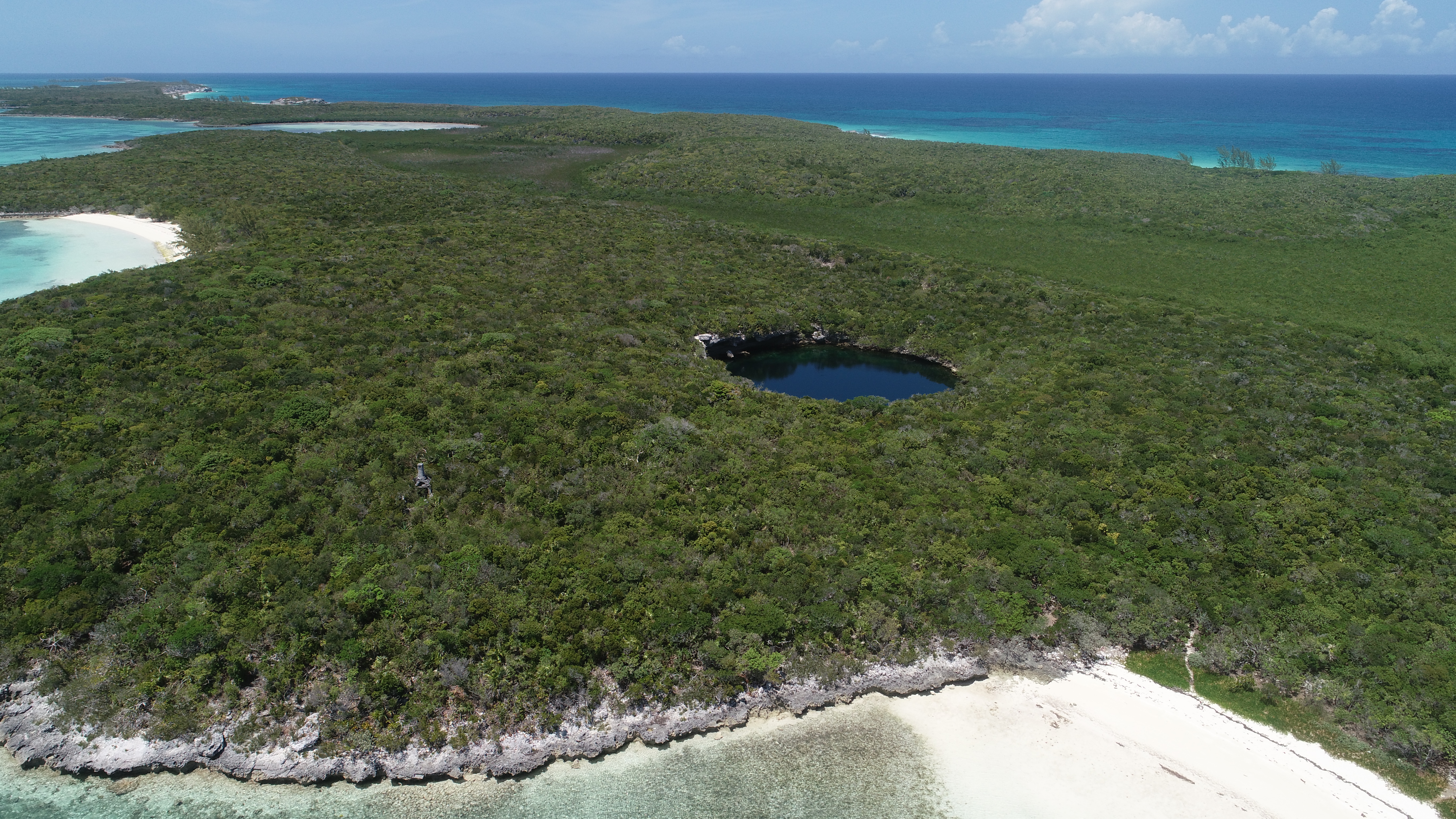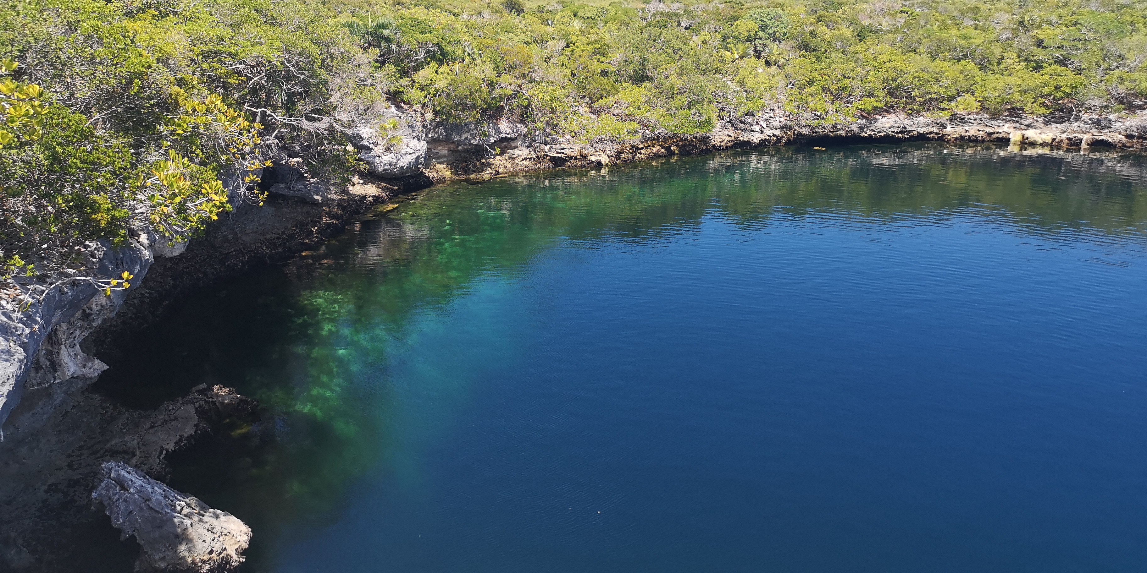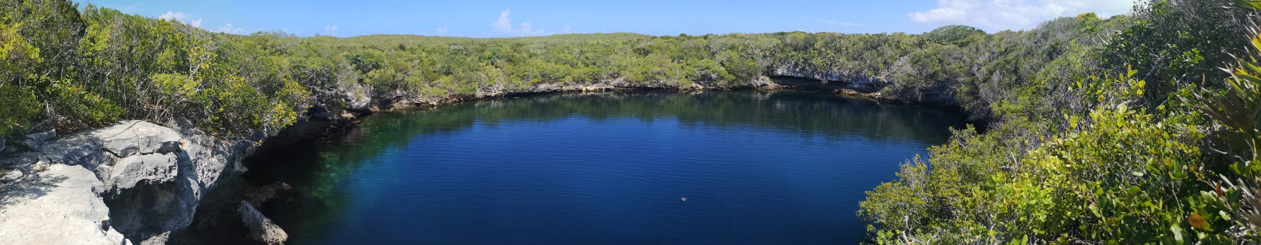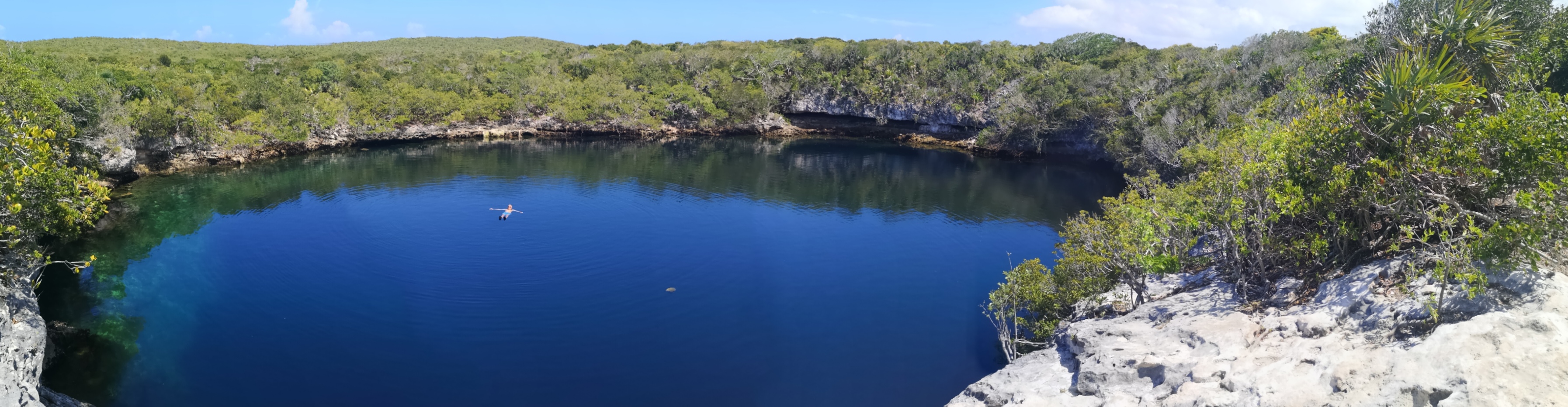 Die Bahamas sind übersät mit Blue Holes. Darüber habe ich schon in diversen BLOGs berichtet. Einige wenige Blue Holes sind nur von Land aus erreichbar – so auch das auf Hoffman’s Cay. Es ist sogar relativ weit im Inselinneren – und mit rund 180 m (laut Wikipedia), das sind 600 Fuß,  enorm tief.