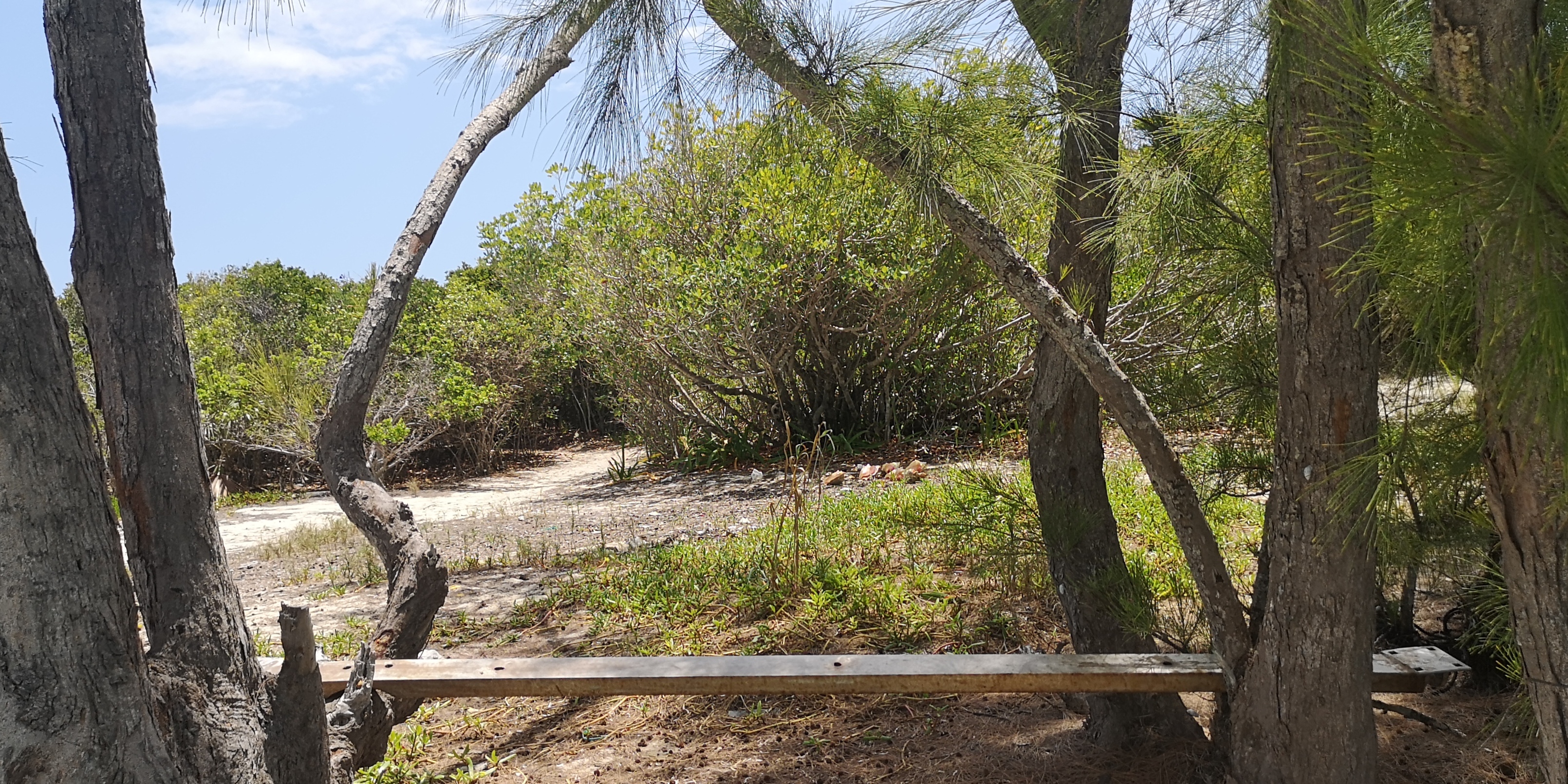 Hinter der Bank am 2.Strand liegt der Startpunkt für den zweiten Trail