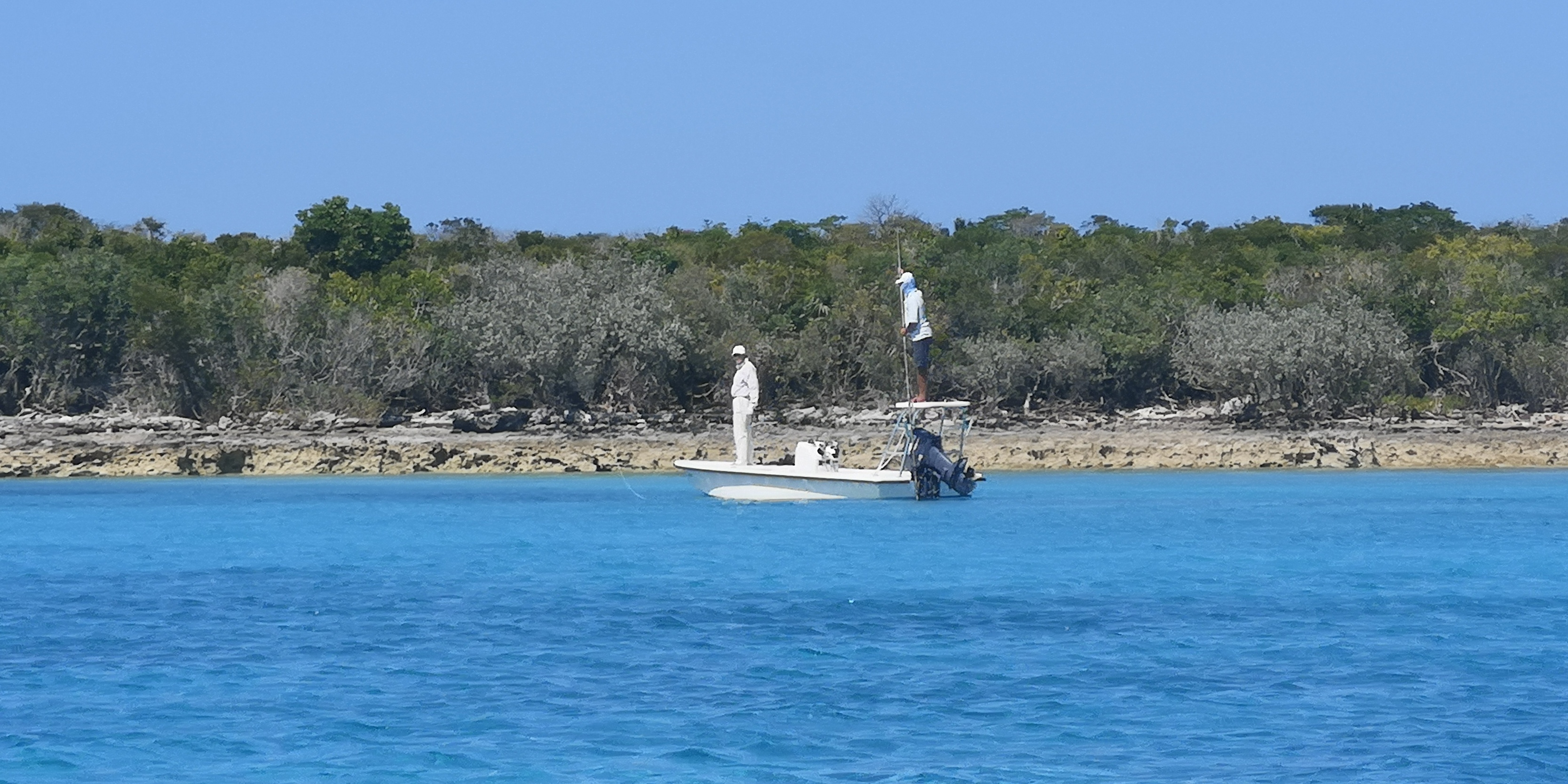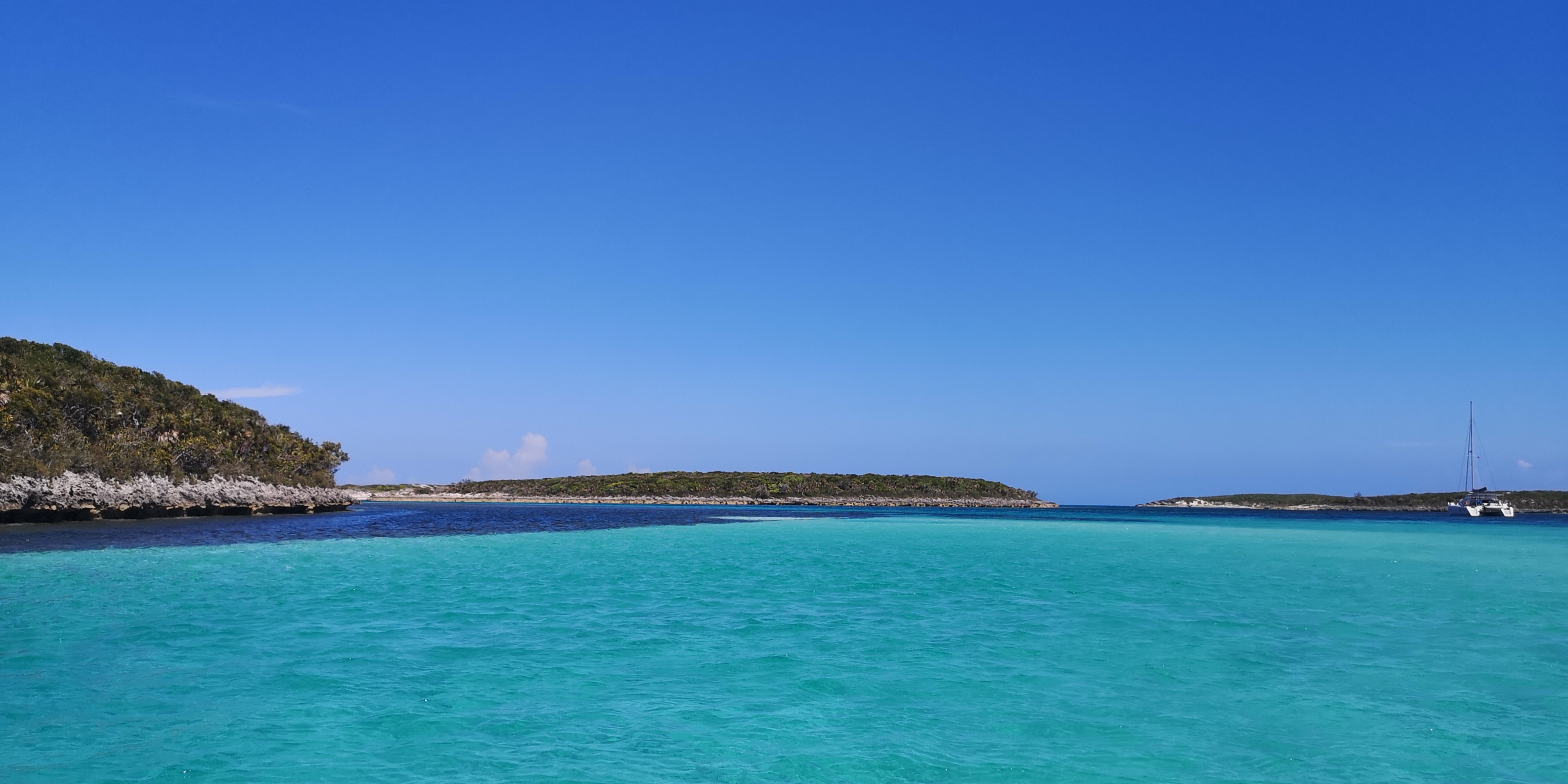 Nach der 1. Nacht gehen wir über die nördliche Ausfahrt raus aufs offene Meer, und beim Devils Cay Cut ans südliche Ende von Hoffmans Cay. Zwischen Saddleback Cay und Fowl Cay werfen wir den Anker. Das Wasser ist ruhig, teilweise spiegelglatt.