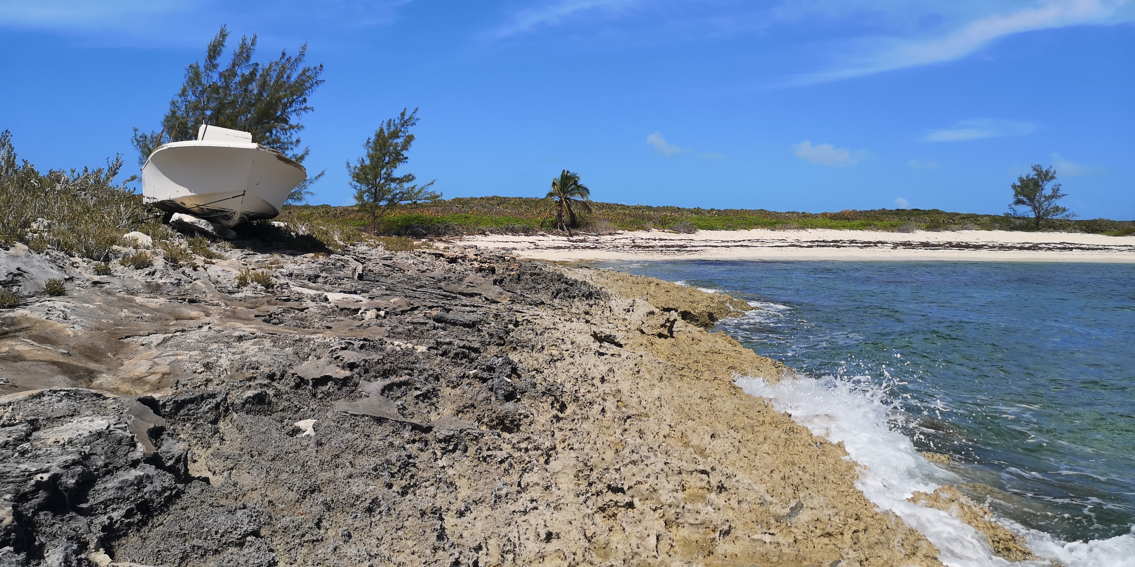 … erreicht man einen weiteren kleinen Strand, an dessen Felsküste ein Wrack trohnt. Alles Brauchbare ist ausgebaut.