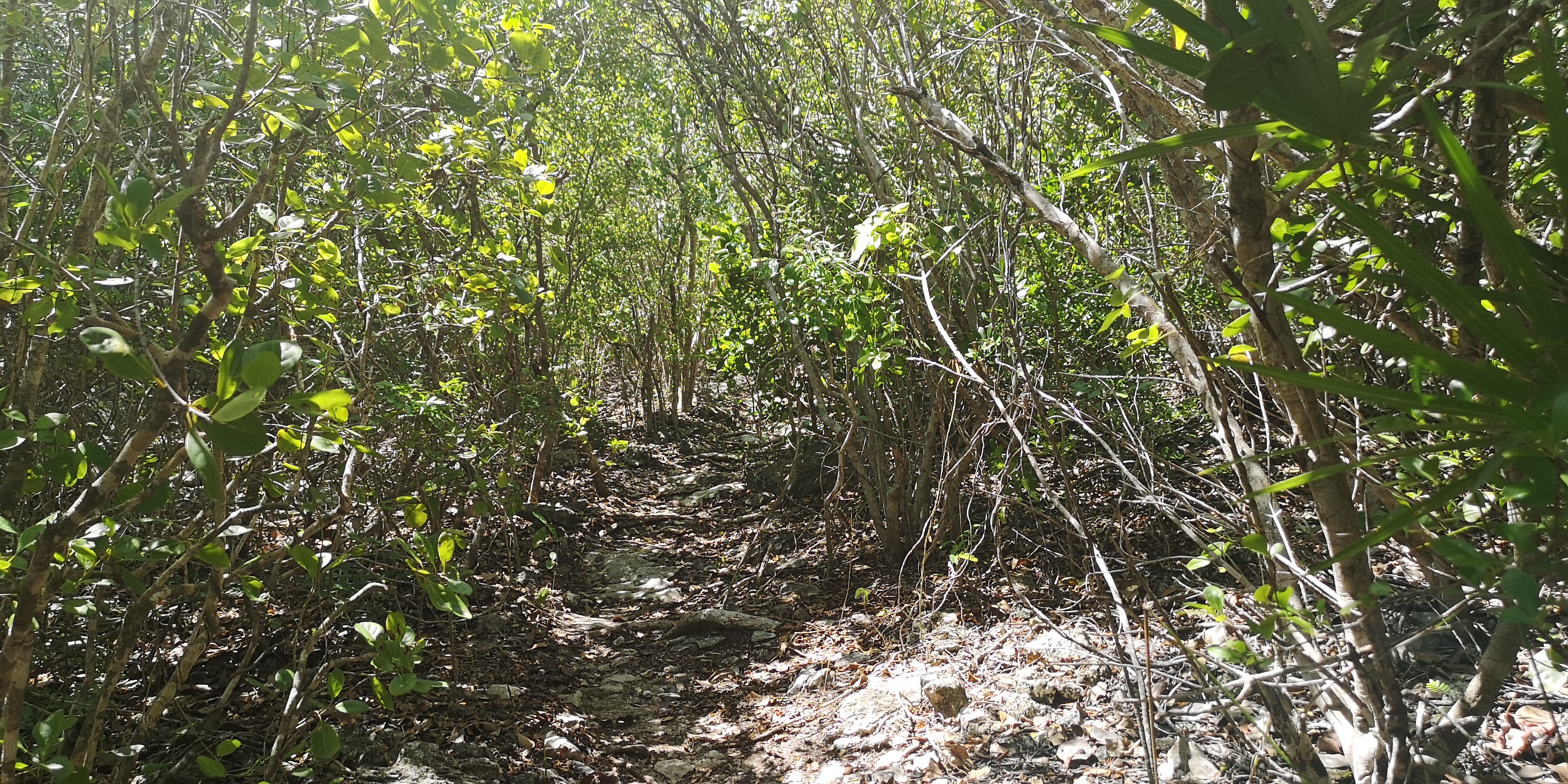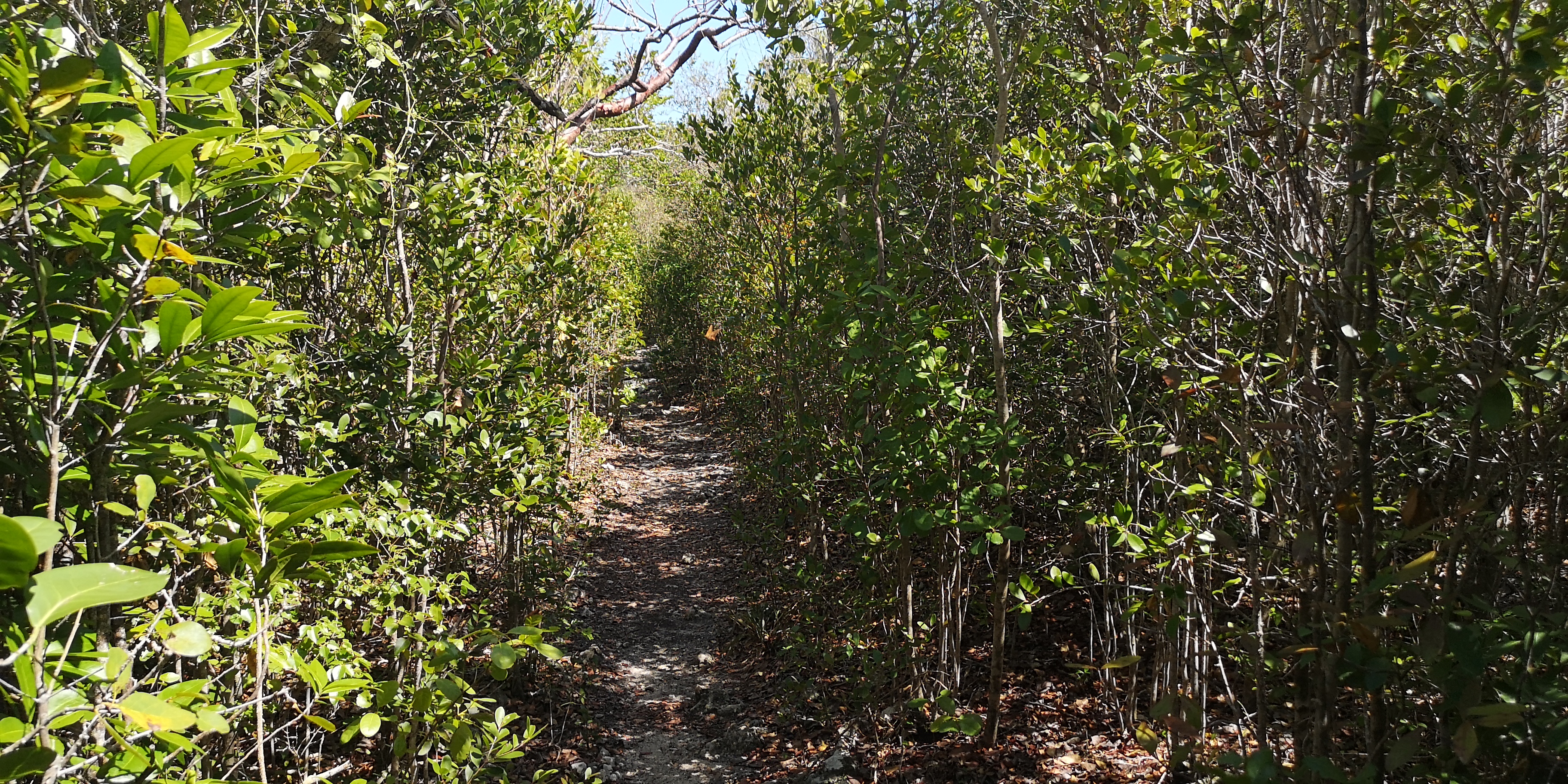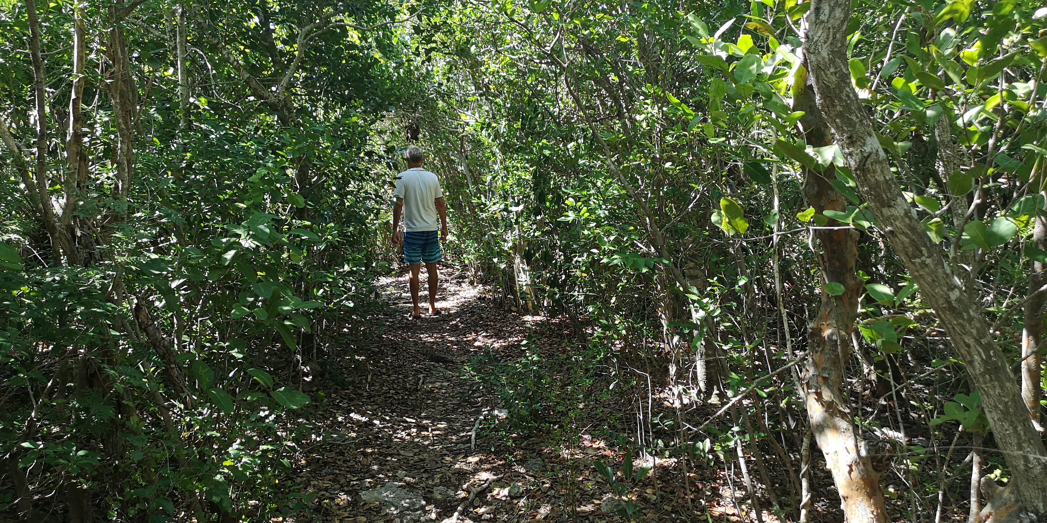 Es gibt zwei Wanderwege zum Blue Hole. Der eine startet am ersten Strand der Hoffman’s Cay (gesehen aus Richtung Saddleback Cay), der zweite am nächsten Strand. Der erste Trail ist etwas eingewachsener und daher schattiger als der zweite.