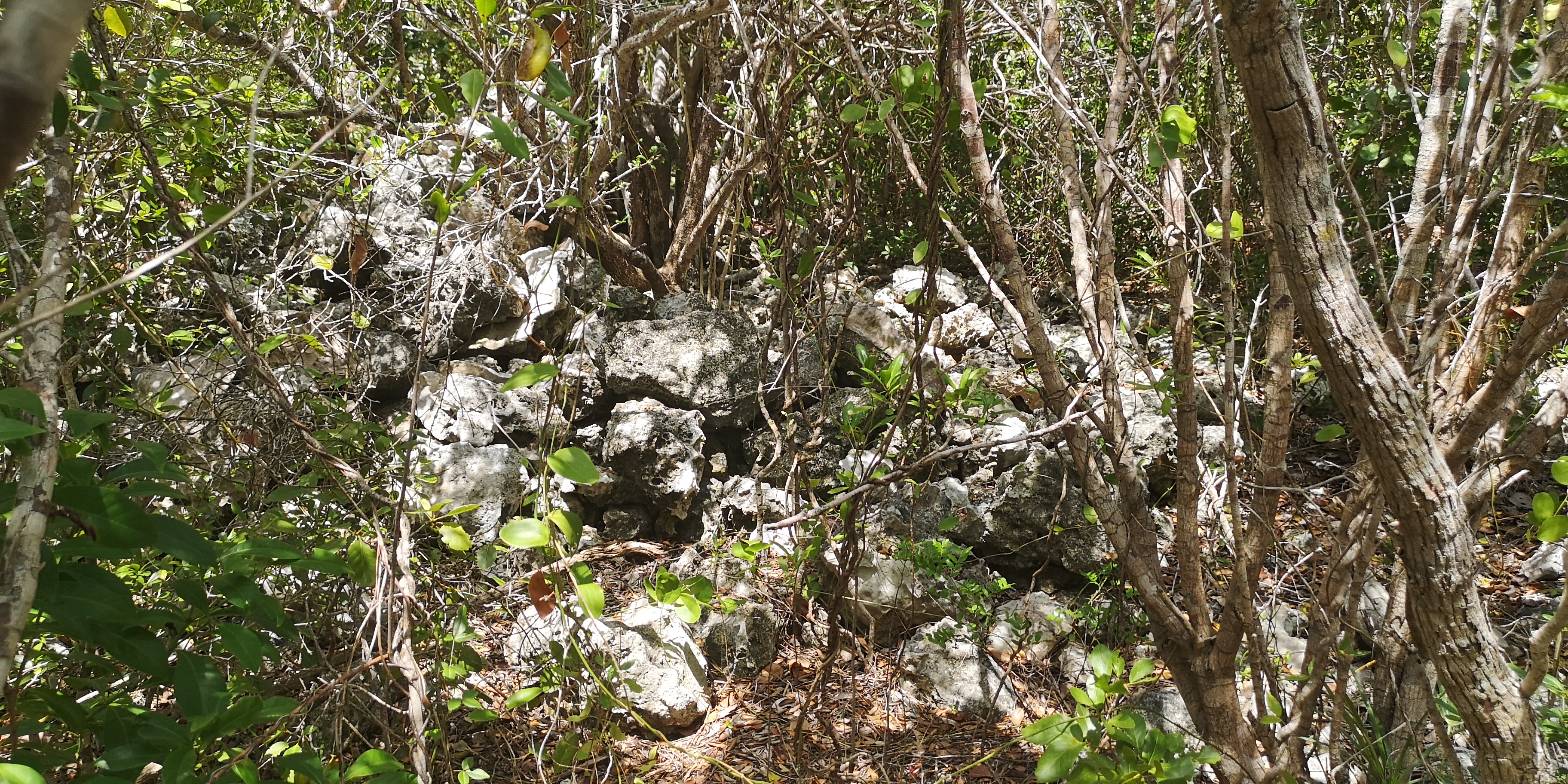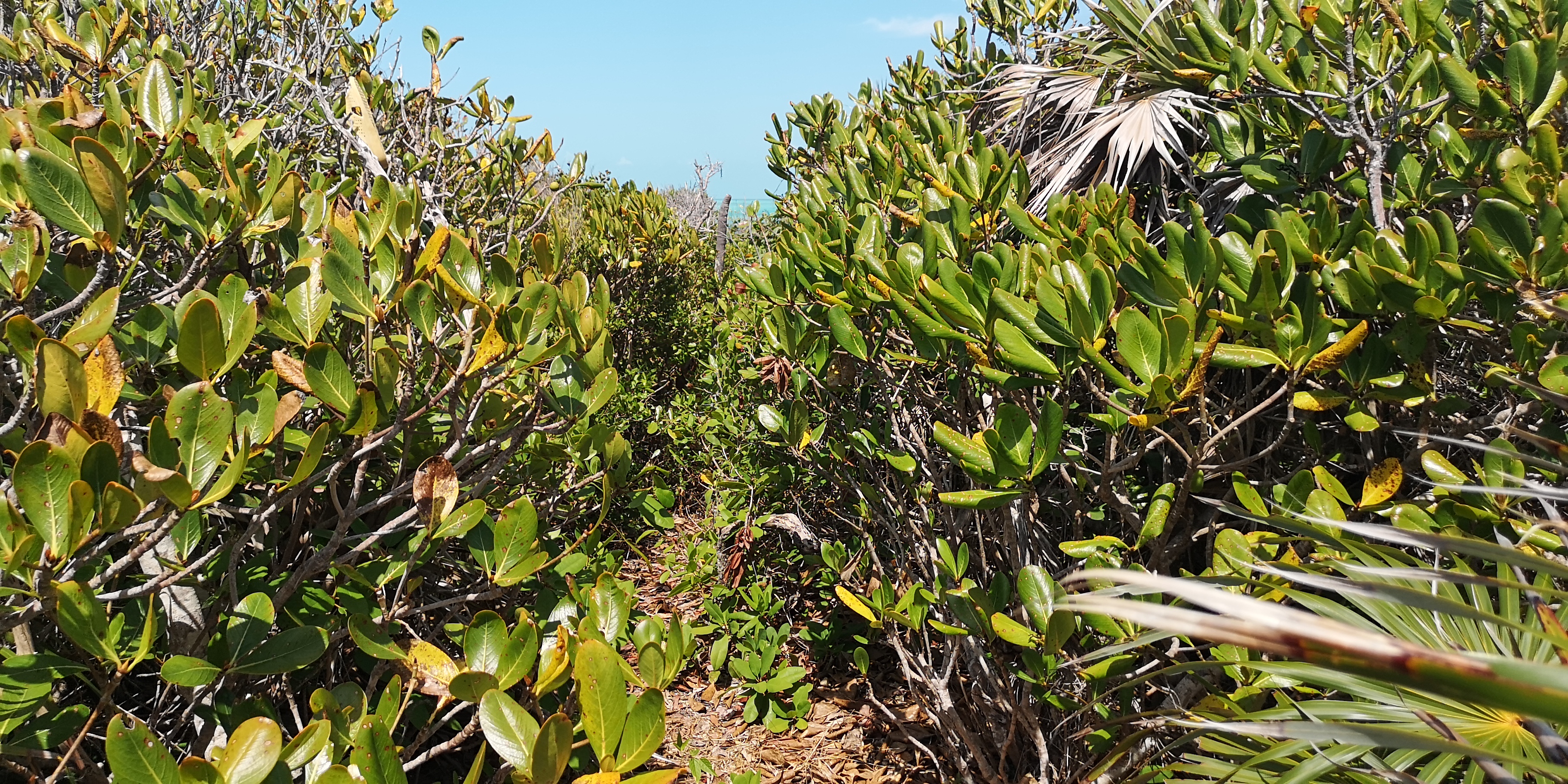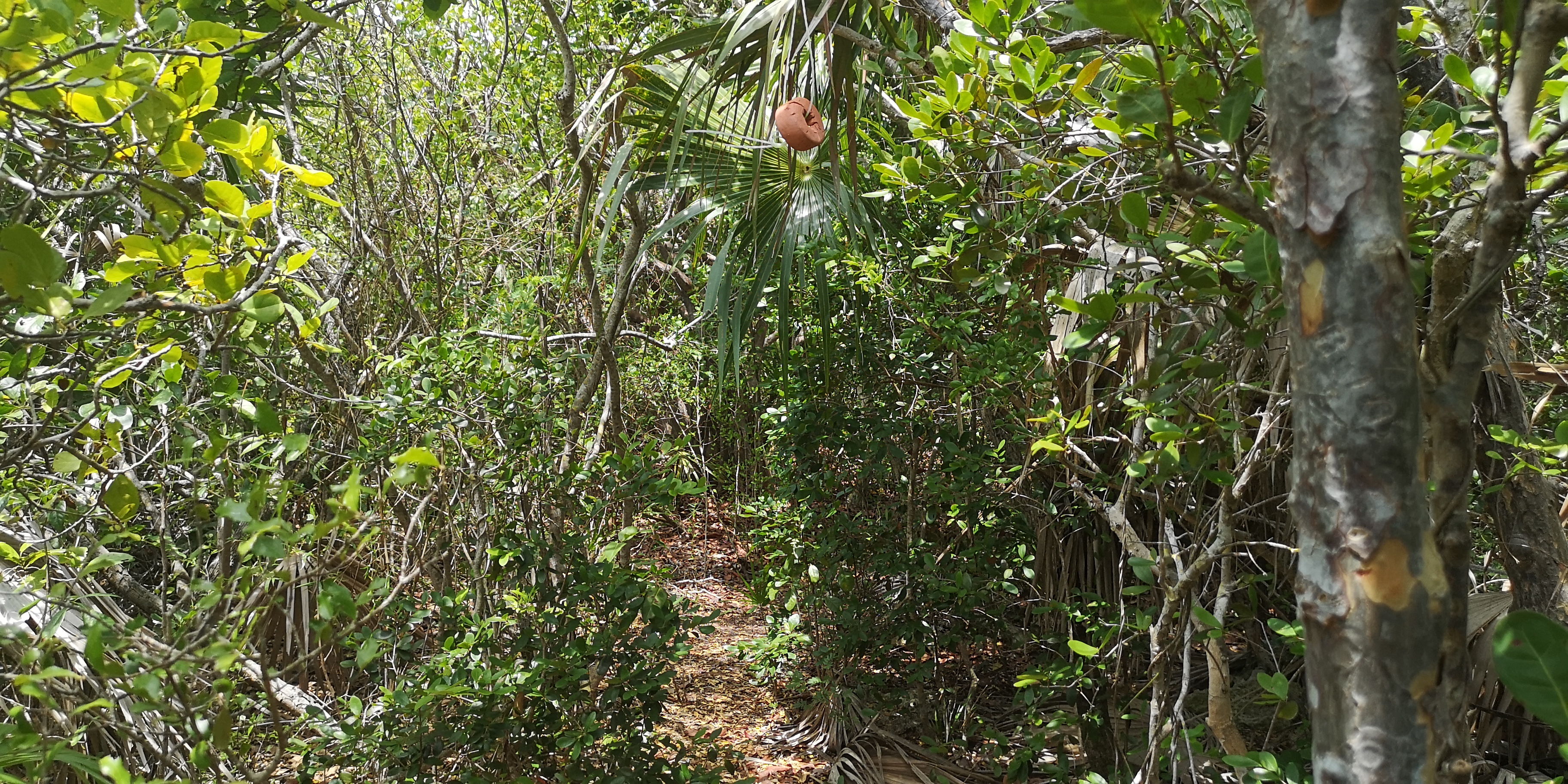 Es gibt zwei Wanderwege zum Blue Hole. Der eine startet am ersten Strand der Hoffman’s Cay (gesehen aus Richtung Saddleback Cay), der zweite am nächsten Strand. Der erste Trail ist etwas eingewachsener und daher schattiger als der zweite.