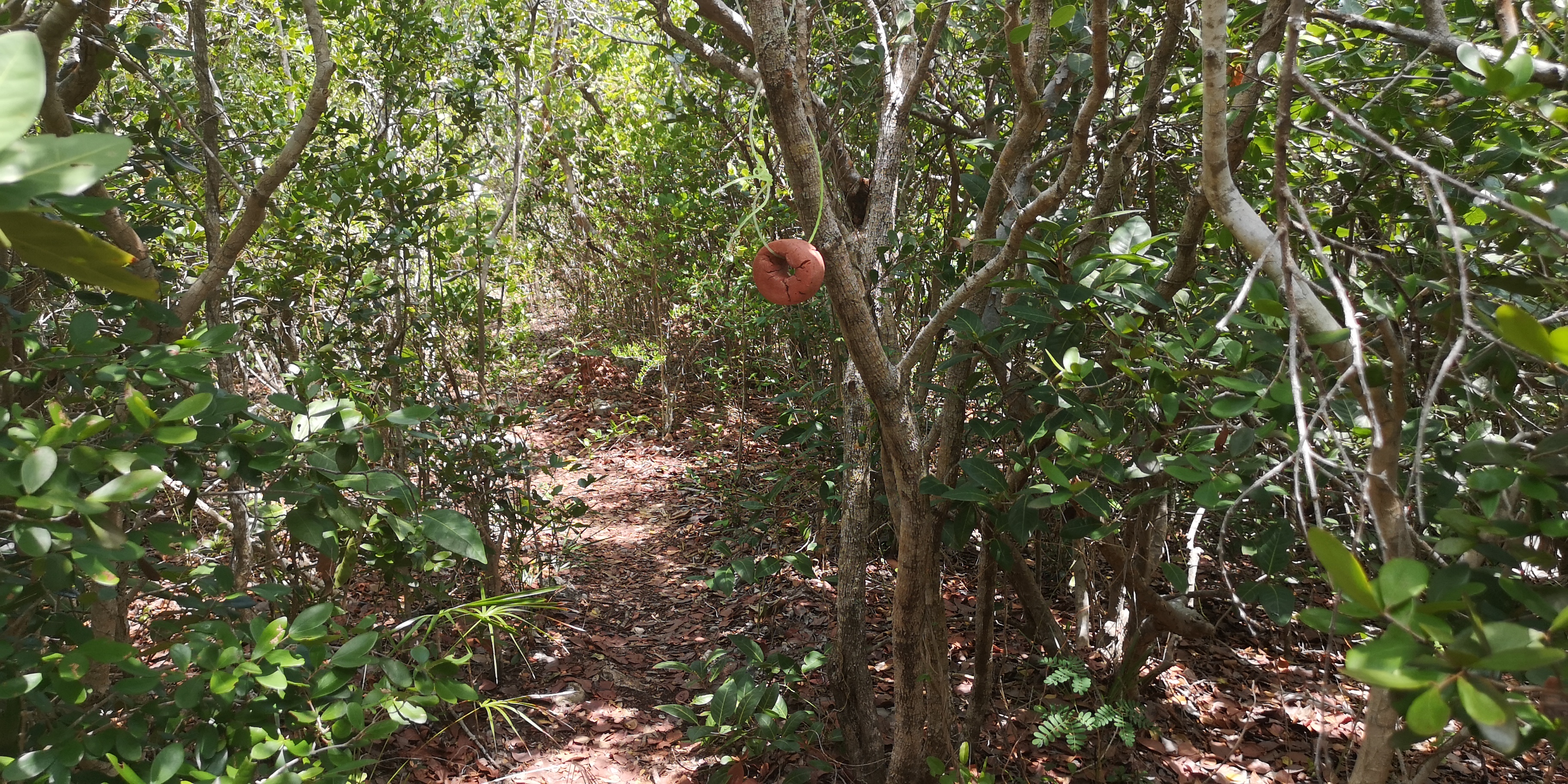 Wenn man dem ersten Trail folgt, findet man kurz vor Erreichen des Blue Holes einen orangen runden Marker in den Zweigen eines Busches auf der rechten Trailseite.