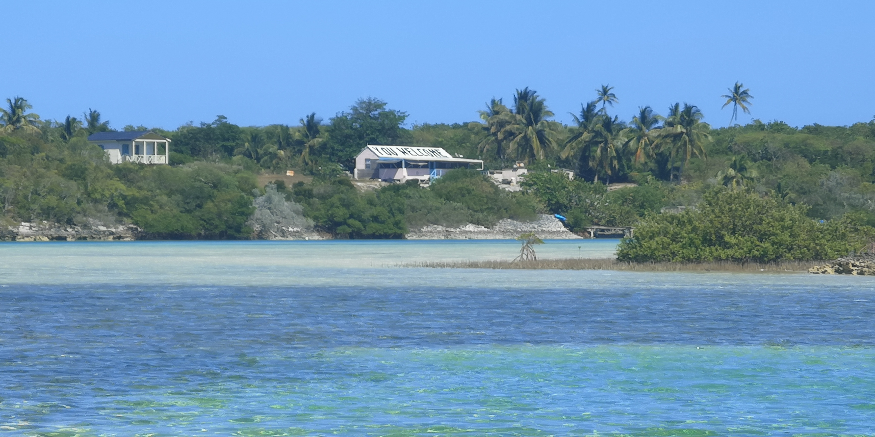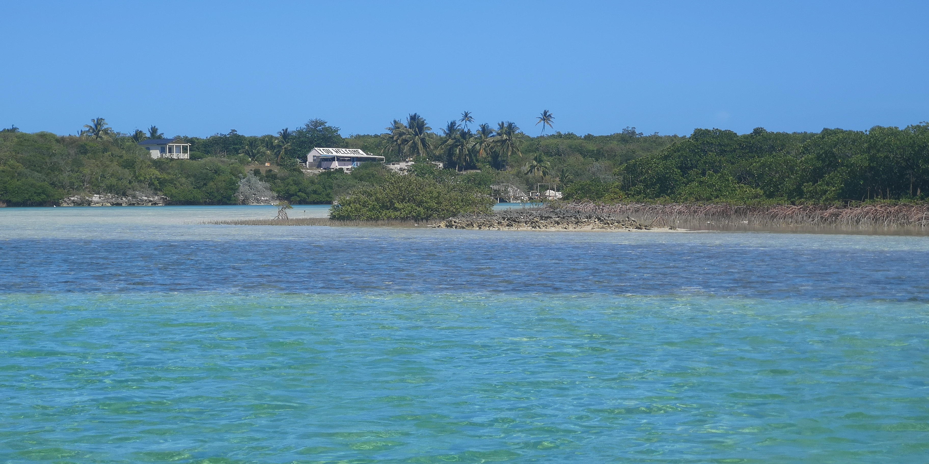Wir können bisher den Besitzer der einzigen Bar weit und breit auch nicht fragen. Denn selbst für unserDinghy war die Strecke bei mittlerem Wasserstand zu flach. Wir hätten noch weiter fahren und uns von Cabbage Cay aus nähern müssen, lesen wir später. Der sehnsuchtsvolle Blick auf die verlockende Bar in der Ferne mit der Aufschrift „you welcome“ auf dem Dach muss zunächst mal reichen.