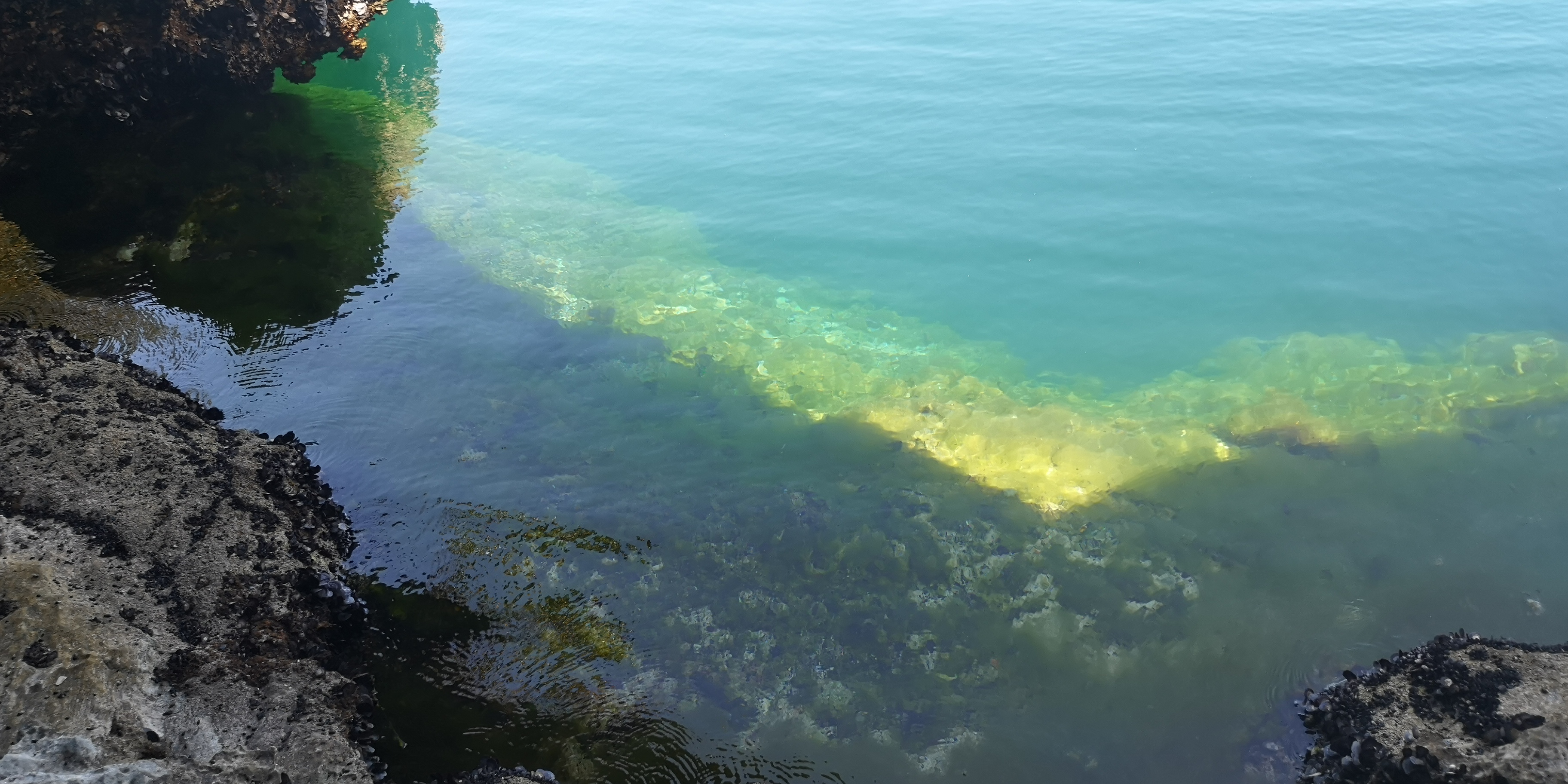 Ich lasse es mir nicht nehmen und springe von der unteren Felsküste hinein. Der kleine Fleck da in der Mitte bin ich (mehr in obigem Video):