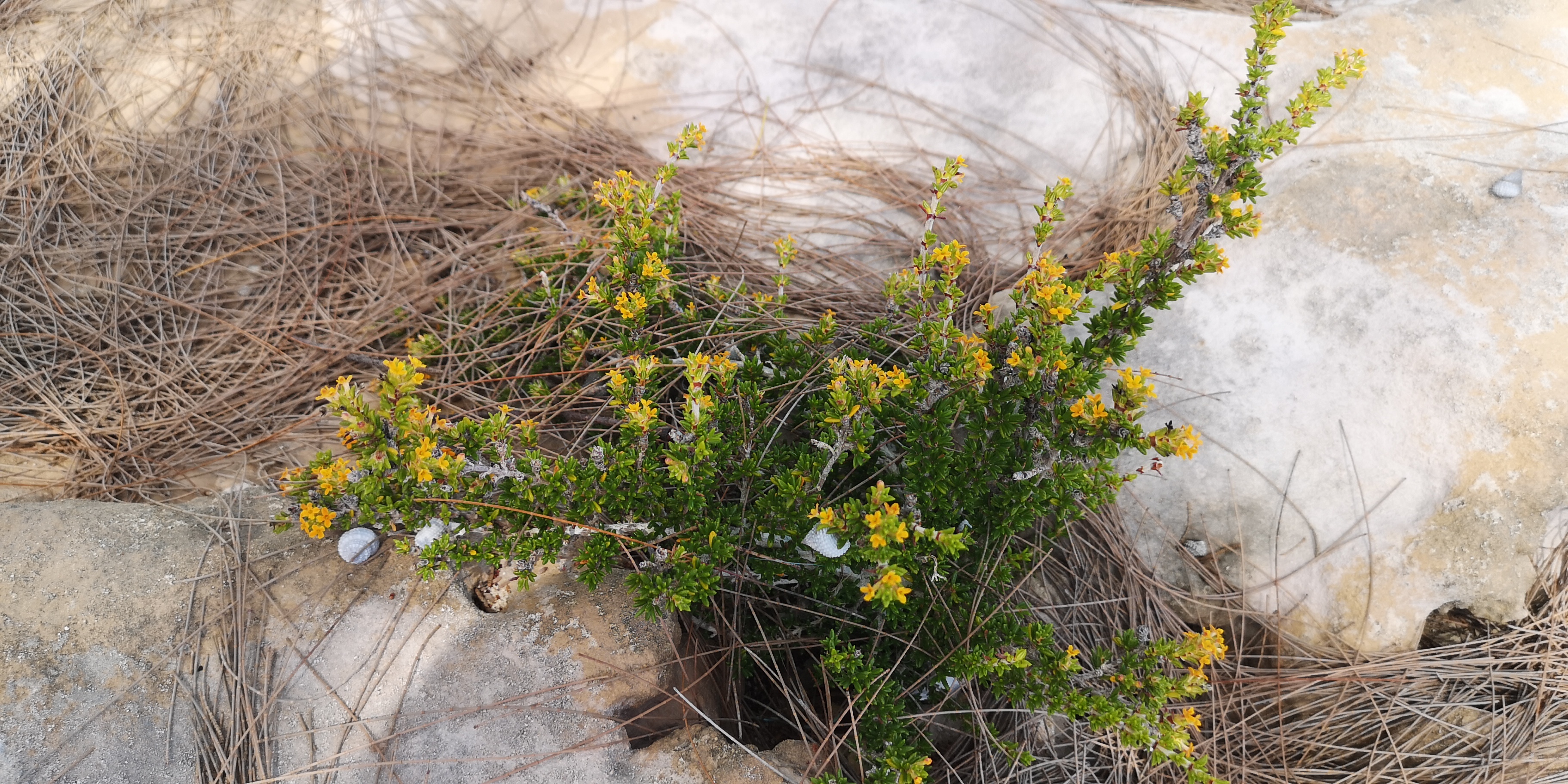 Blick über duftende Sträucher von den Dünen aufs offene Meer