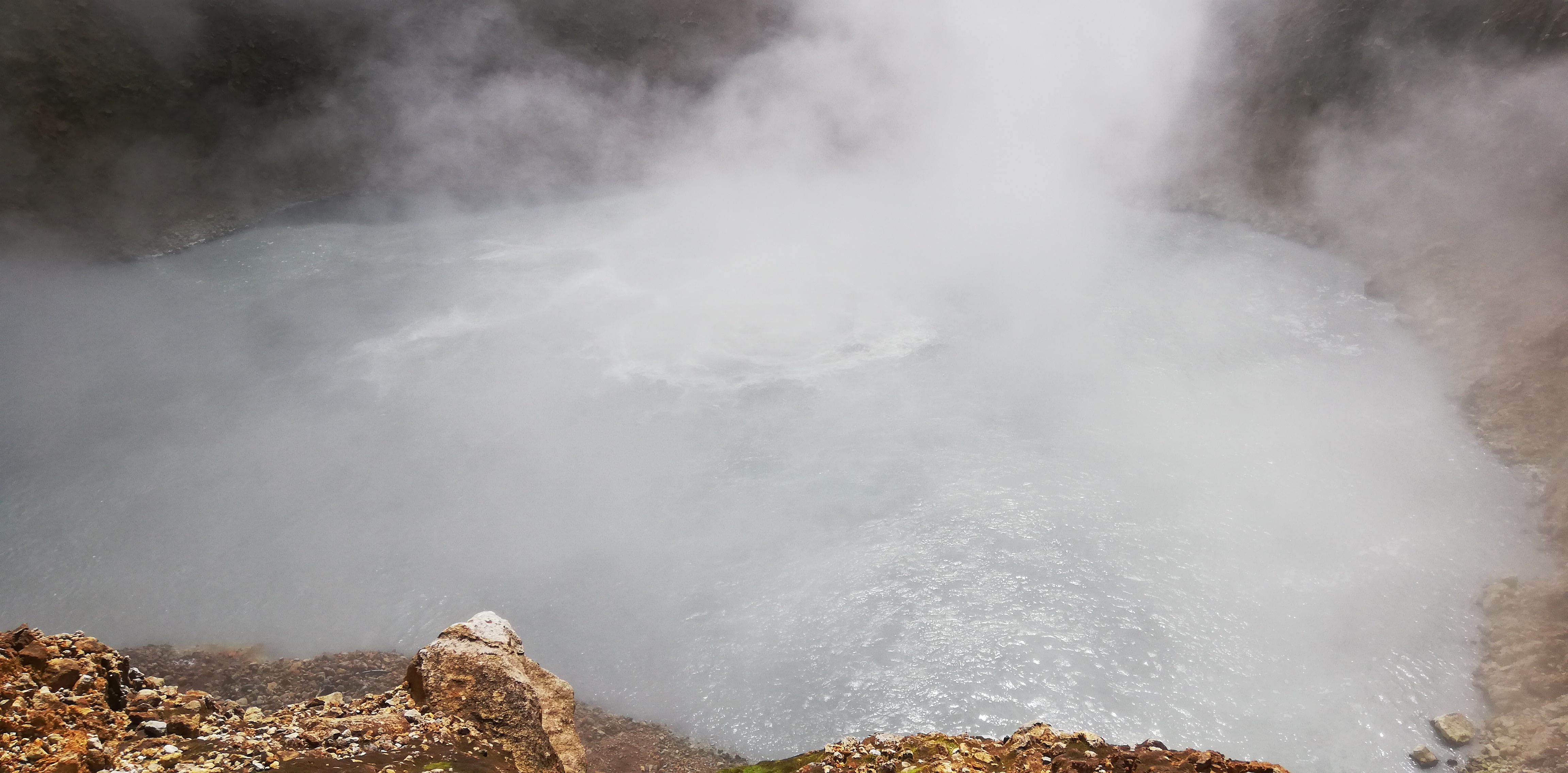Stimmt so. Grammatikalisch. Die Rede ist nämlich nicht von einer kochenden See. Was man vermuten könnte, nachdem ich unten über die Hurricane-Zeit berichtet hatte. Auch wenn unser Windmesser inzwischen Werte von über 700 Knoten anzeigt, ist die See relativ ruhig. Die Rede ist von einem kochenden See: Einem natürlichem See, der durch geothermische Energie tatsächlich zum Kochen gebracht wird.