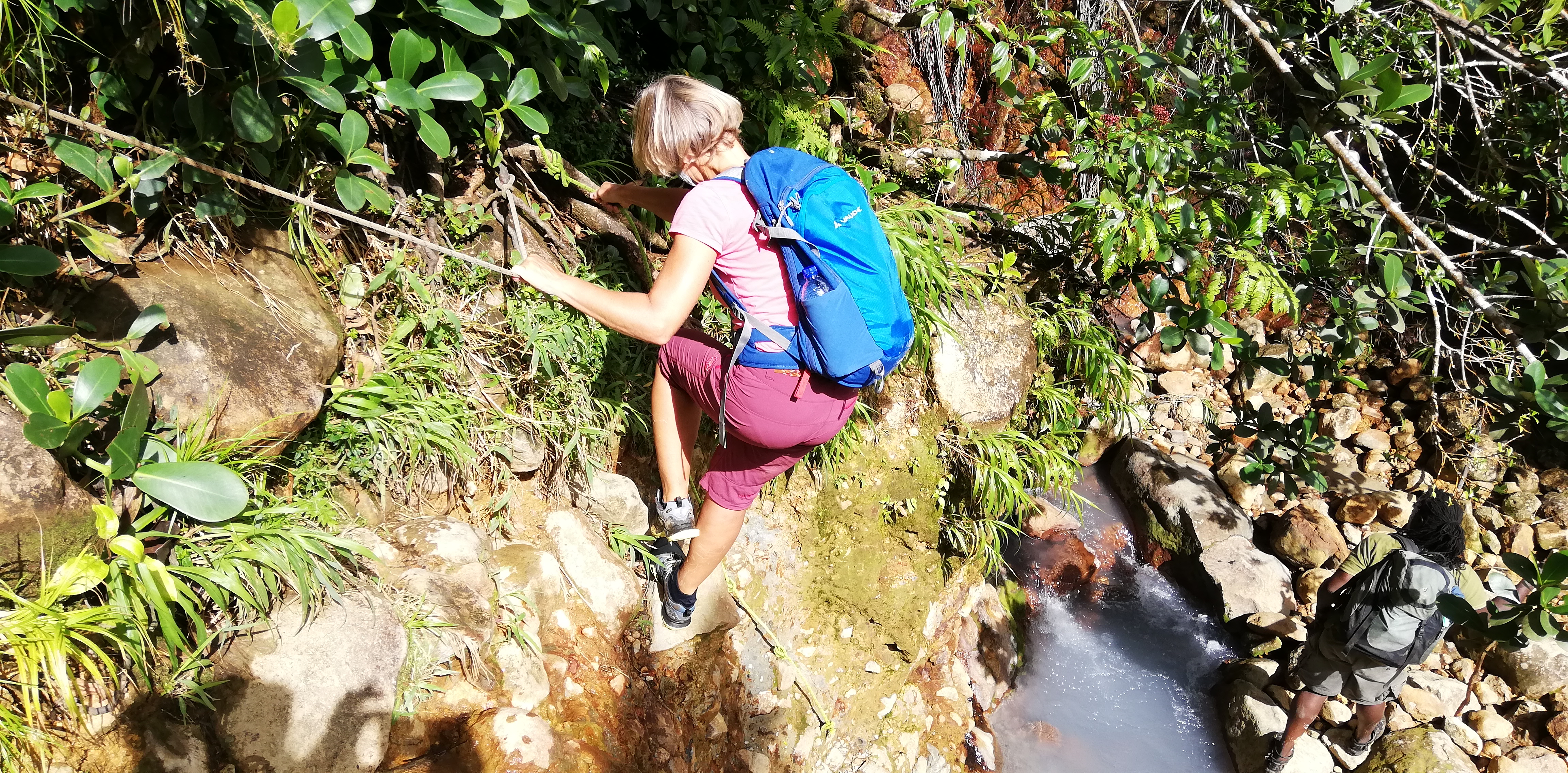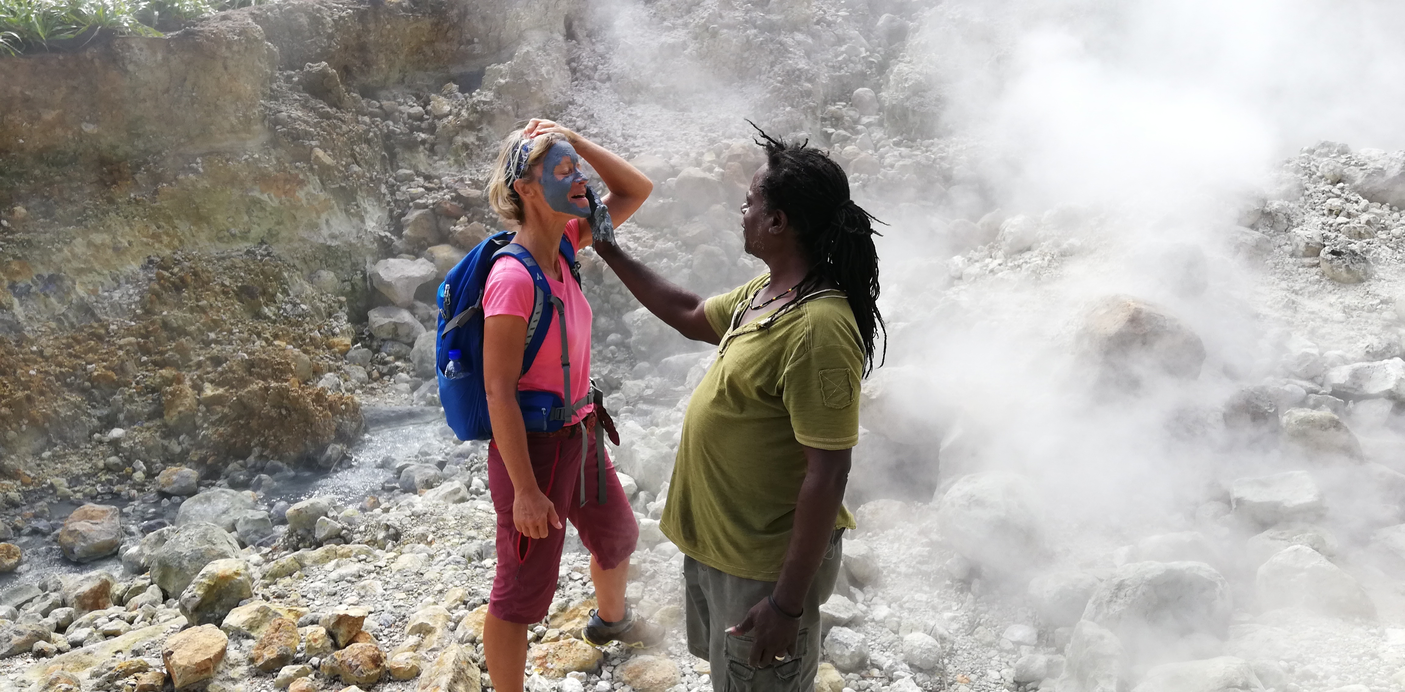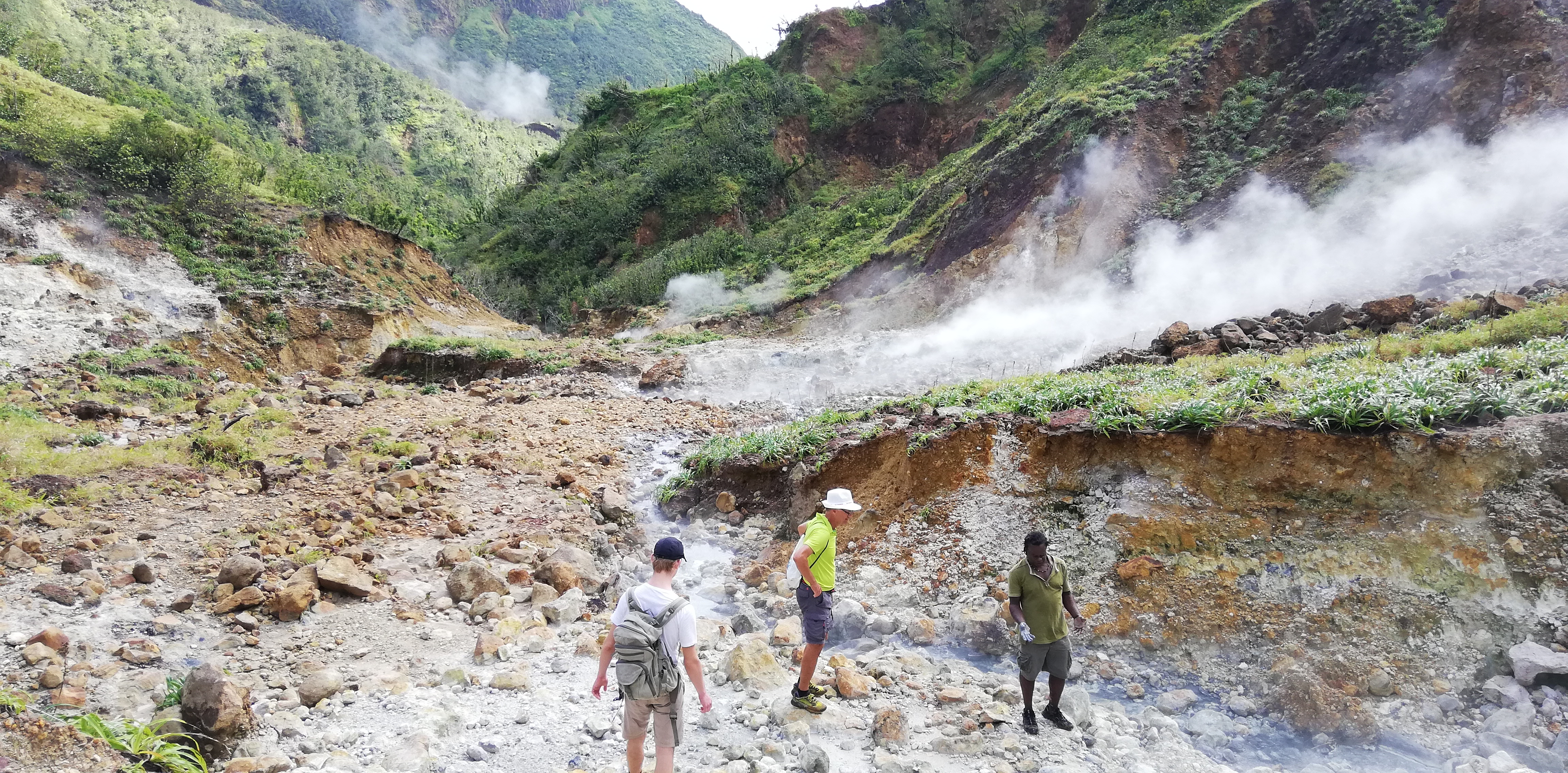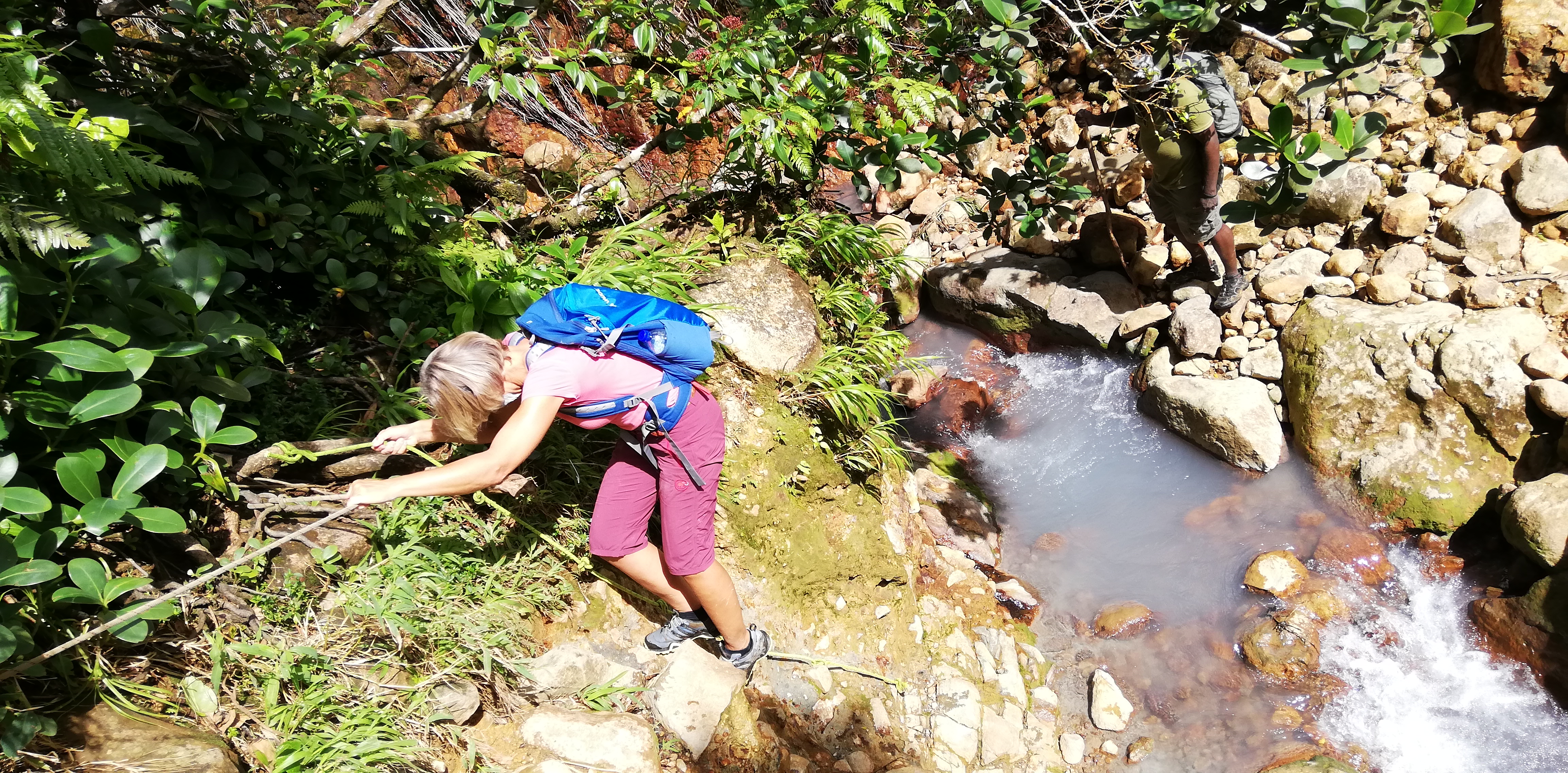 Wir könnten den Weg zwar alleine gehen, auch wenn der Trail an manchen Stellen, gerade bei den Flussüberquerungen, nicht immer leicht zu erkennen ist. Aber wir buchen SeaCat als Guide. Er arbeitet seit 20 Jahren als Tourguide und kennt Land, Natur und Leute. Auf dem Trail zeigt er uns etliches an Pflanzen und die großen Veränderungen, die der Hurrikan von 2017 geschaffen hat. Er hat ein karibisch fröhliches Gemüt, geht sehr flott und verkürzt mit seinen Hinweisen die Aufstiegsmühen. Denn immer wieder heißt es über Stufen und Felsen rauf, dann oft glitschig und teils am Seil wieder runter- und danach, genau, das Gleiche wieder. Im heißen Thermalwasser kocht er für uns Eier, reibt nicht nur uns, sondern auch sich selbst das Gesicht mit Mineralerde ein und serviert am Boiling Lake ein leckeres Mittagessen mit frisch geschnittenem Salat, Fischsalat und gebratenen Kochbananen. Gut geht es uns bei ihm.
