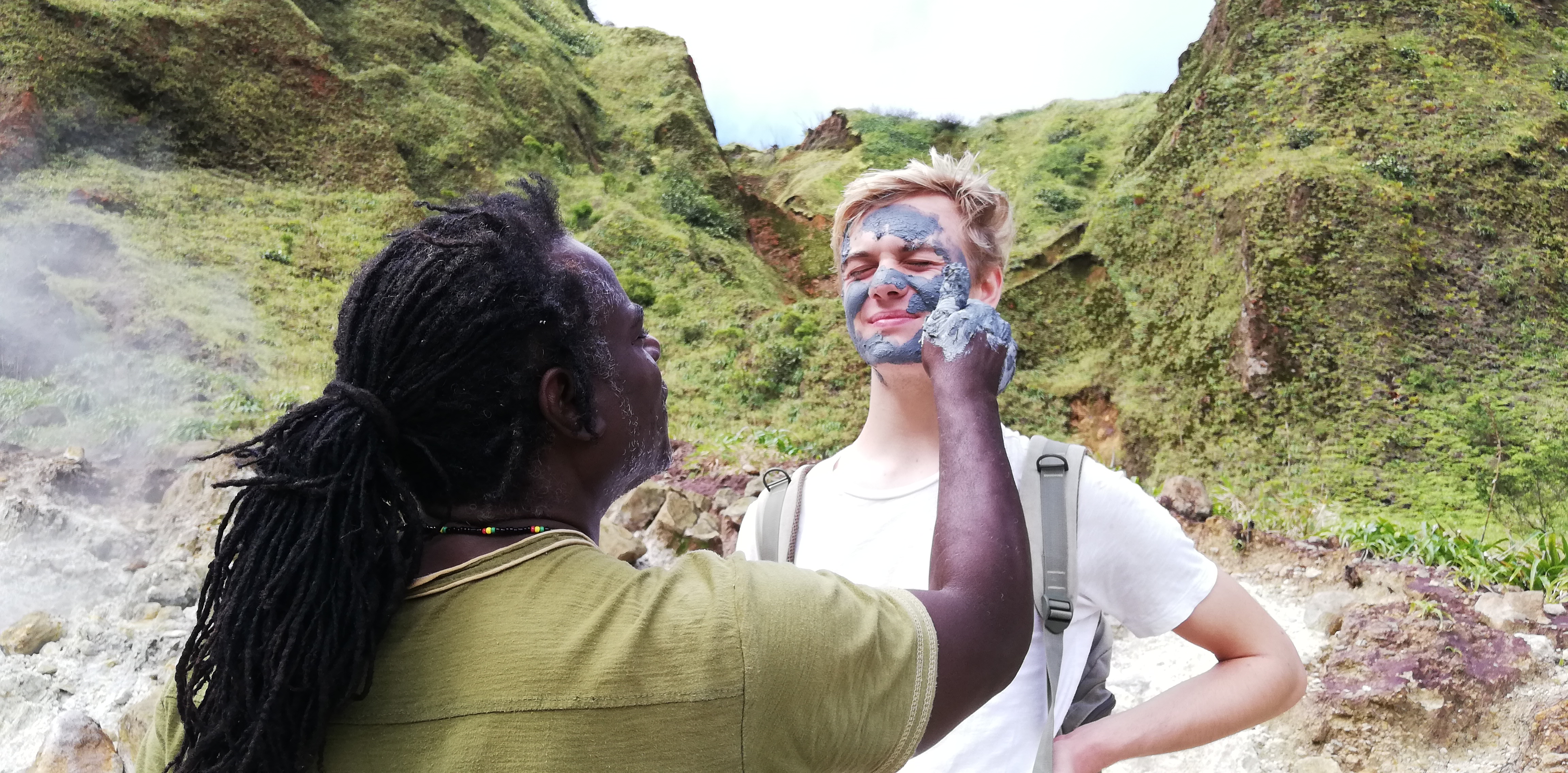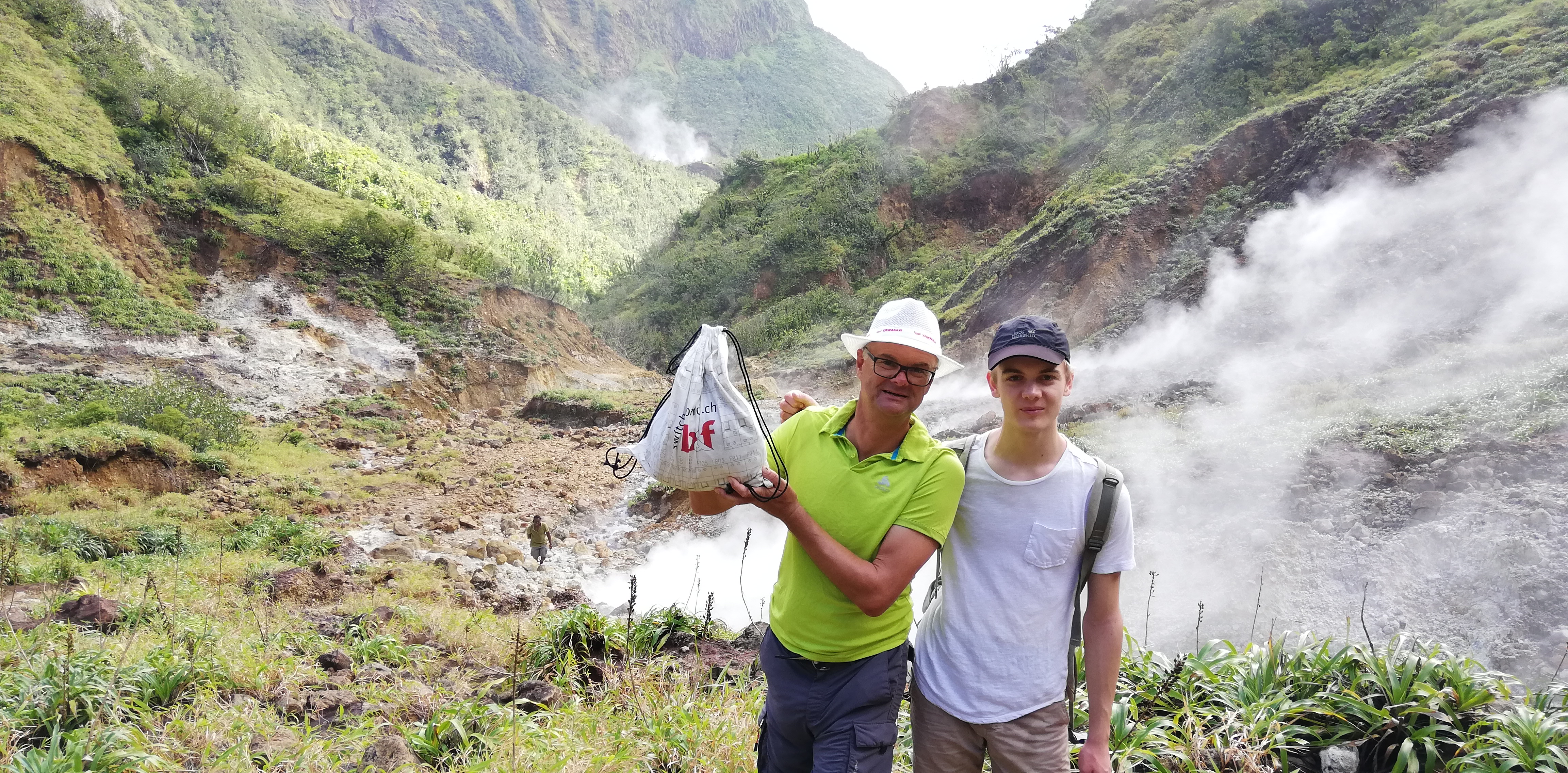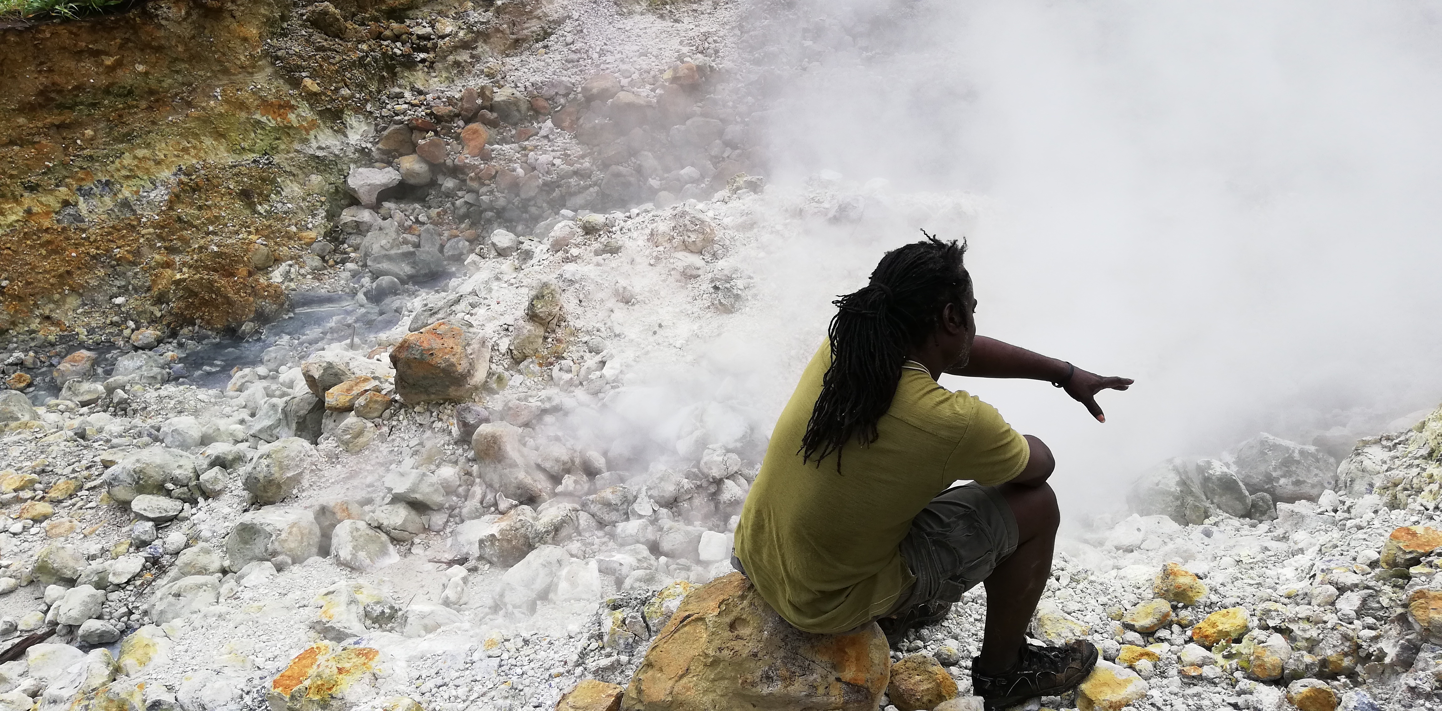 Wir könnten den Weg zwar alleine gehen, auch wenn der Trail an manchen Stellen, gerade bei den Flussüberquerungen, nicht immer leicht zu erkennen ist. Aber wir buchen SeaCat als Guide. Er arbeitet seit 20 Jahren als Tourguide und kennt Land, Natur und Leute. Auf dem Trail zeigt er uns etliches an Pflanzen und die großen Veränderungen, die der Hurrikan von 2017 geschaffen hat. Er hat ein karibisch fröhliches Gemüt, geht sehr flott und verkürzt mit seinen Hinweisen die Aufstiegsmühen. Denn immer wieder heißt es über Stufen und Felsen rauf, dann oft glitschig und teils am Seil wieder runter- und danach, genau, das Gleiche wieder. Im heißen Thermalwasser kocht er für uns Eier, reibt nicht nur uns, sondern auch sich selbst das Gesicht mit Mineralerde ein und serviert am Boiling Lake ein leckeres Mittagessen mit frisch geschnittenem Salat, Fischsalat und gebratenen Kochbananen. Gut geht es uns bei ihm.
