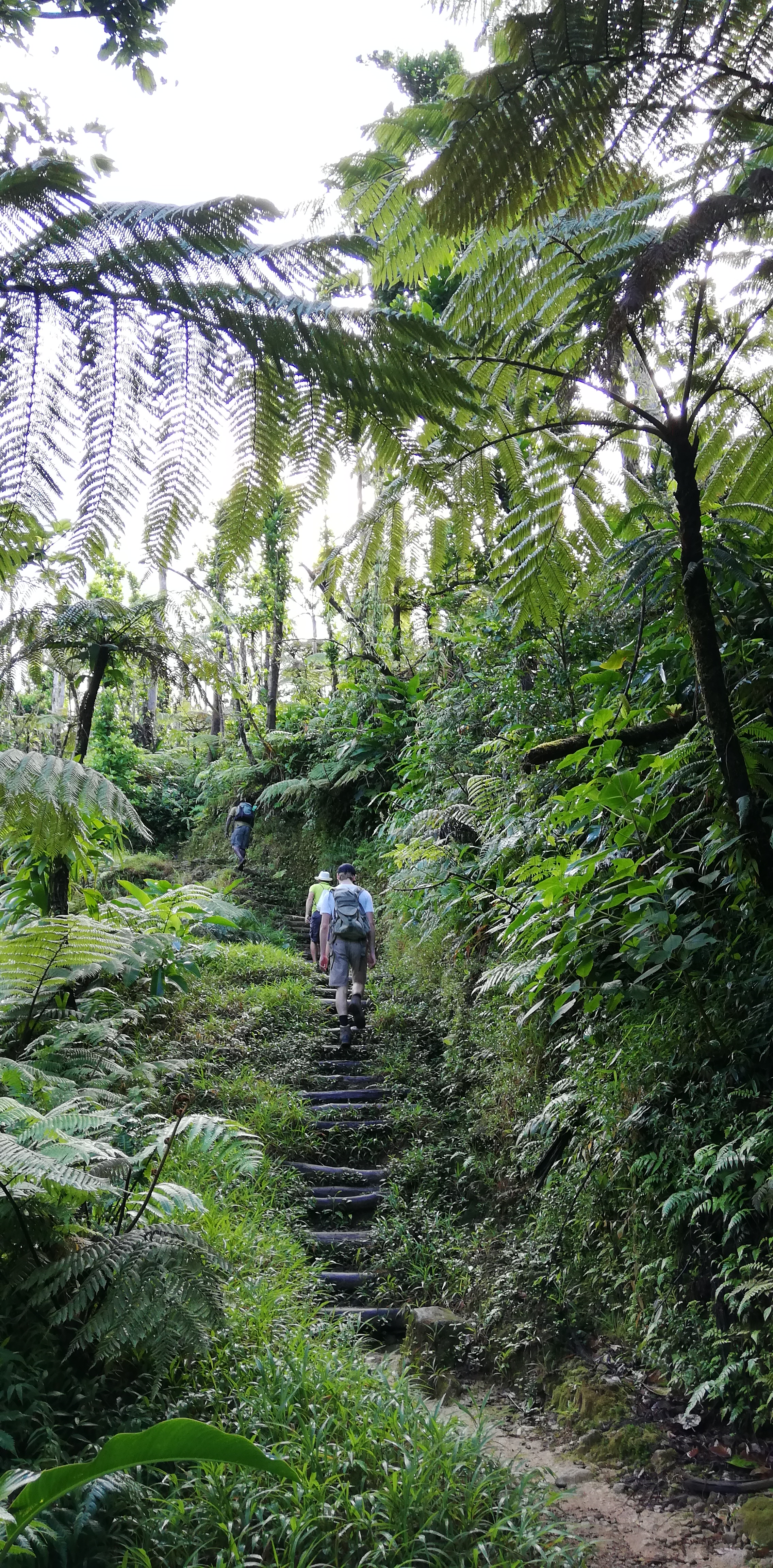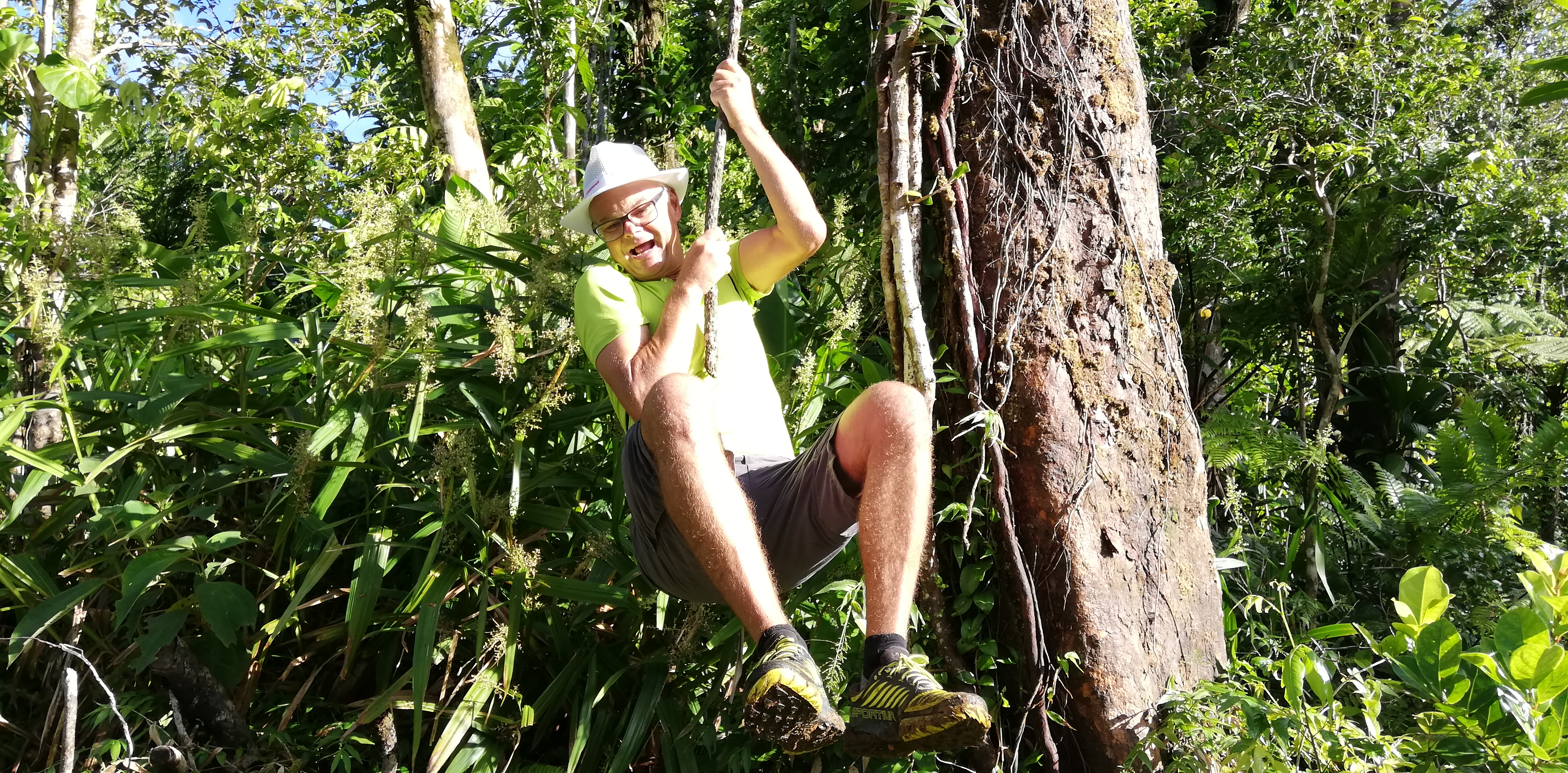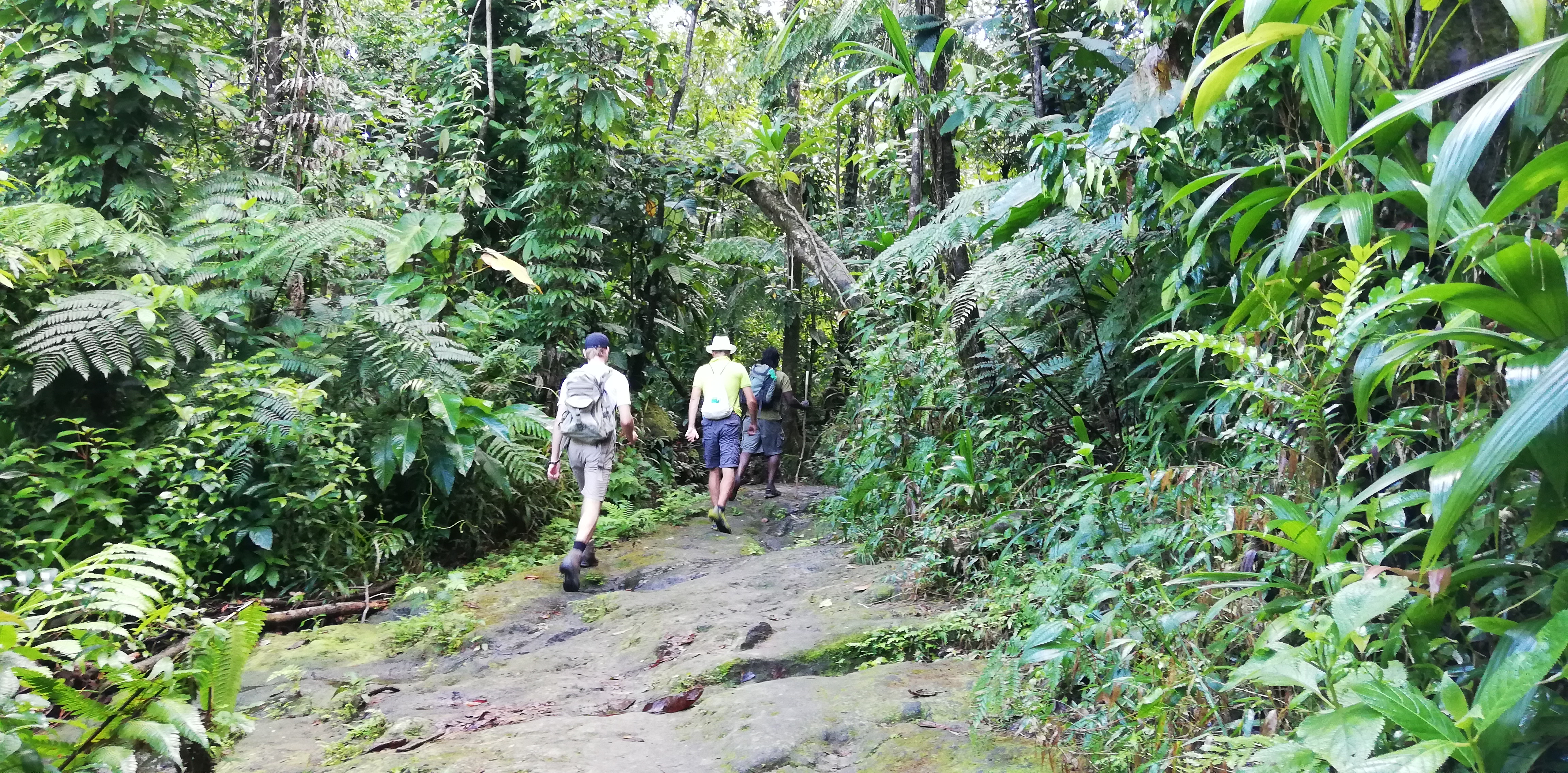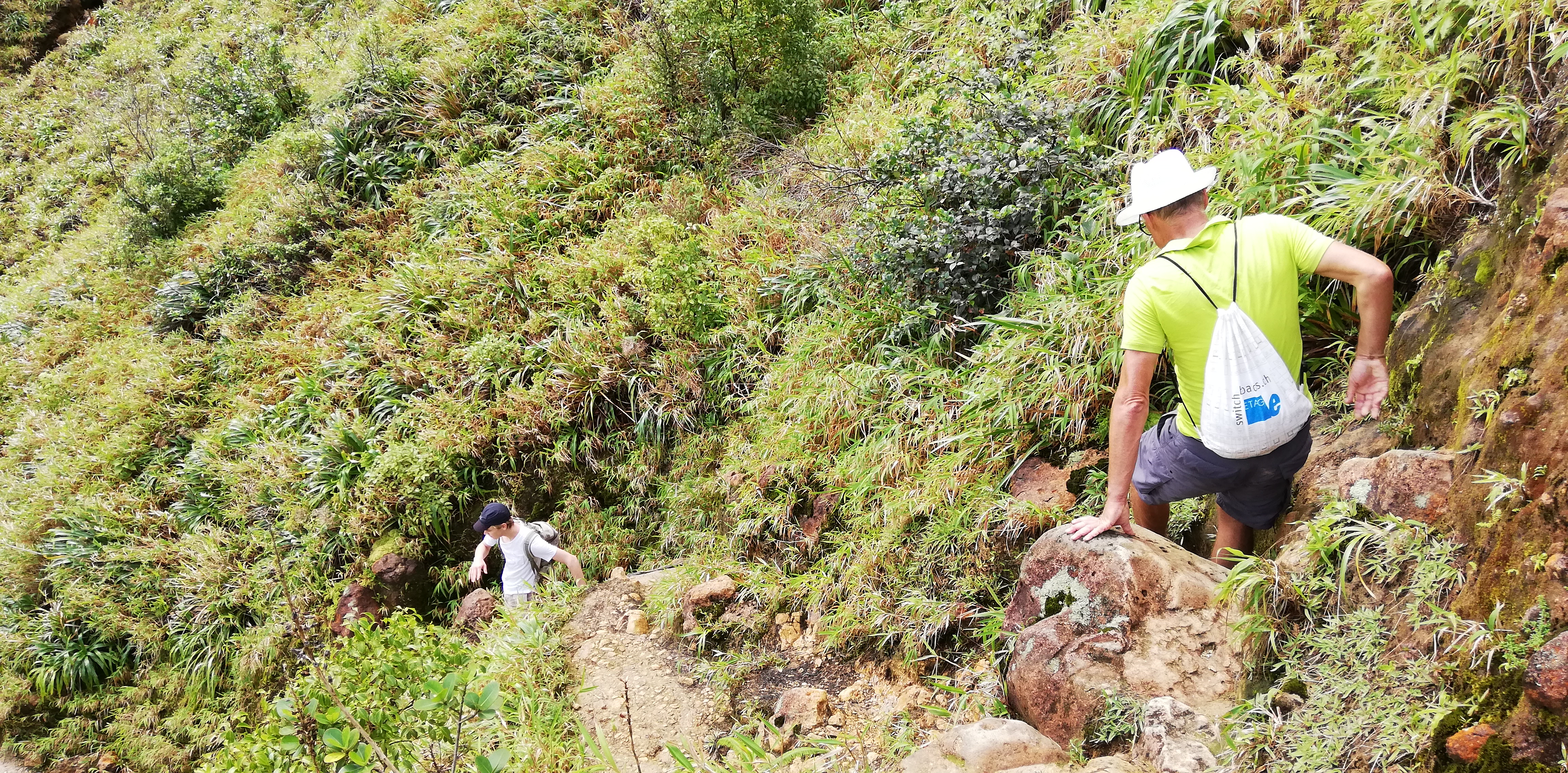 Wir könnten den Weg zwar alleine gehen, auch wenn der Trail an manchen Stellen, gerade bei den Flussüberquerungen, nicht immer leicht zu erkennen ist. Aber wir buchen SeaCat als Guide. Er arbeitet seit 20 Jahren als Tourguide und kennt Land, Natur und Leute. Auf dem Trail zeigt er uns etliches an Pflanzen und die großen Veränderungen, die der Hurrikan von 2017 geschaffen hat. Er hat ein karibisch fröhliches Gemüt, geht sehr flott und verkürzt mit seinen Hinweisen die Aufstiegsmühen. Denn immer wieder heißt es über Stufen und Felsen rauf, dann oft glitschig und teils am Seil wieder runter- und danach, genau, das Gleiche wieder. Im heißen Thermalwasser kocht er für uns Eier, reibt nicht nur uns, sondern auch sich selbst das Gesicht mit Mineralerde ein und serviert am Boiling Lake ein leckeres Mittagessen mit frisch geschnittenem Salat, Fischsalat und gebratenen Kochbananen. Gut geht es uns bei ihm.