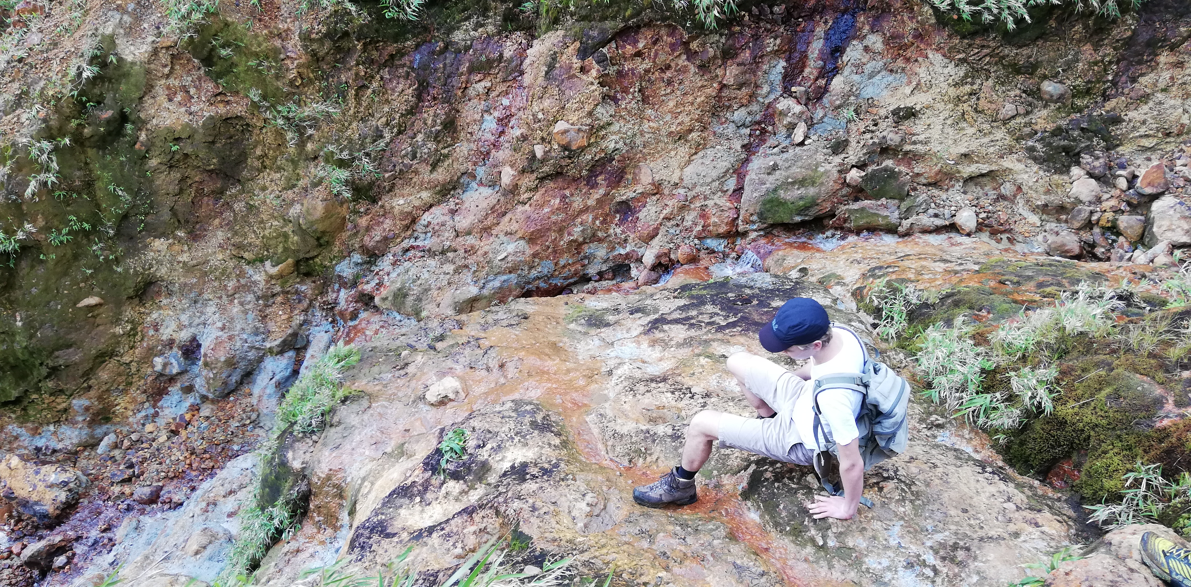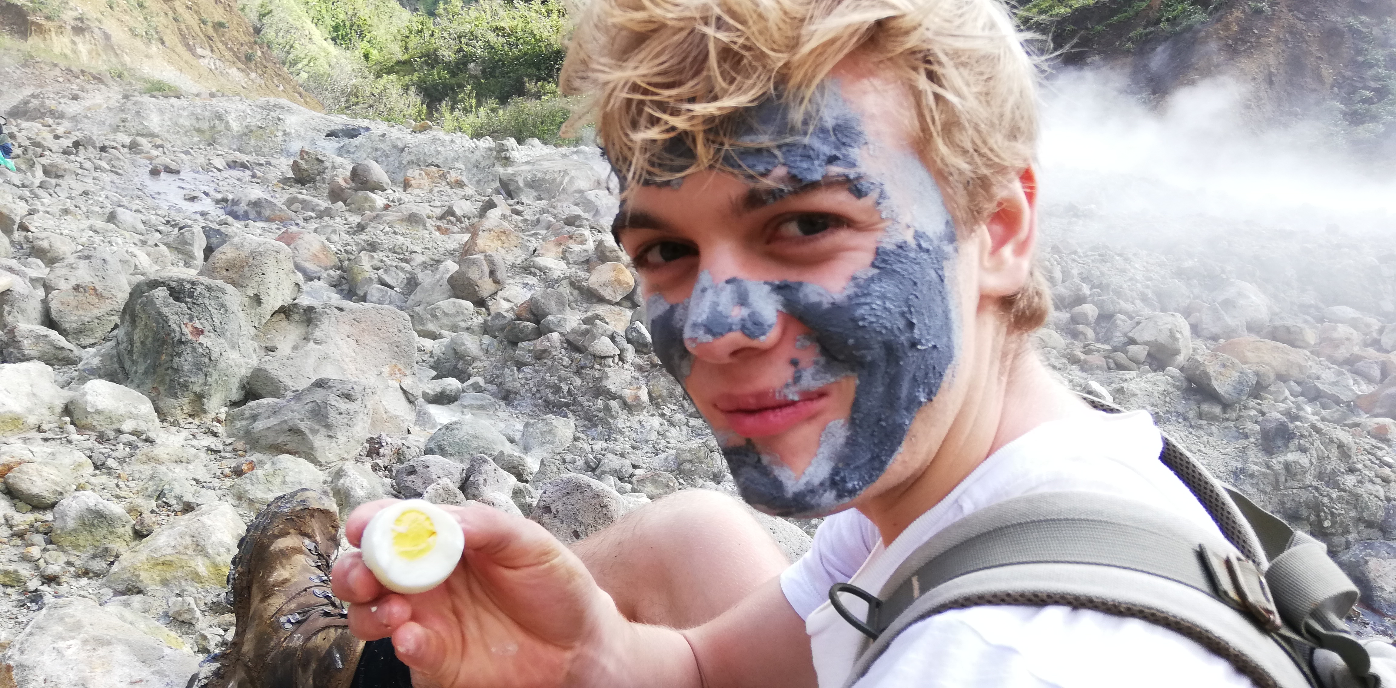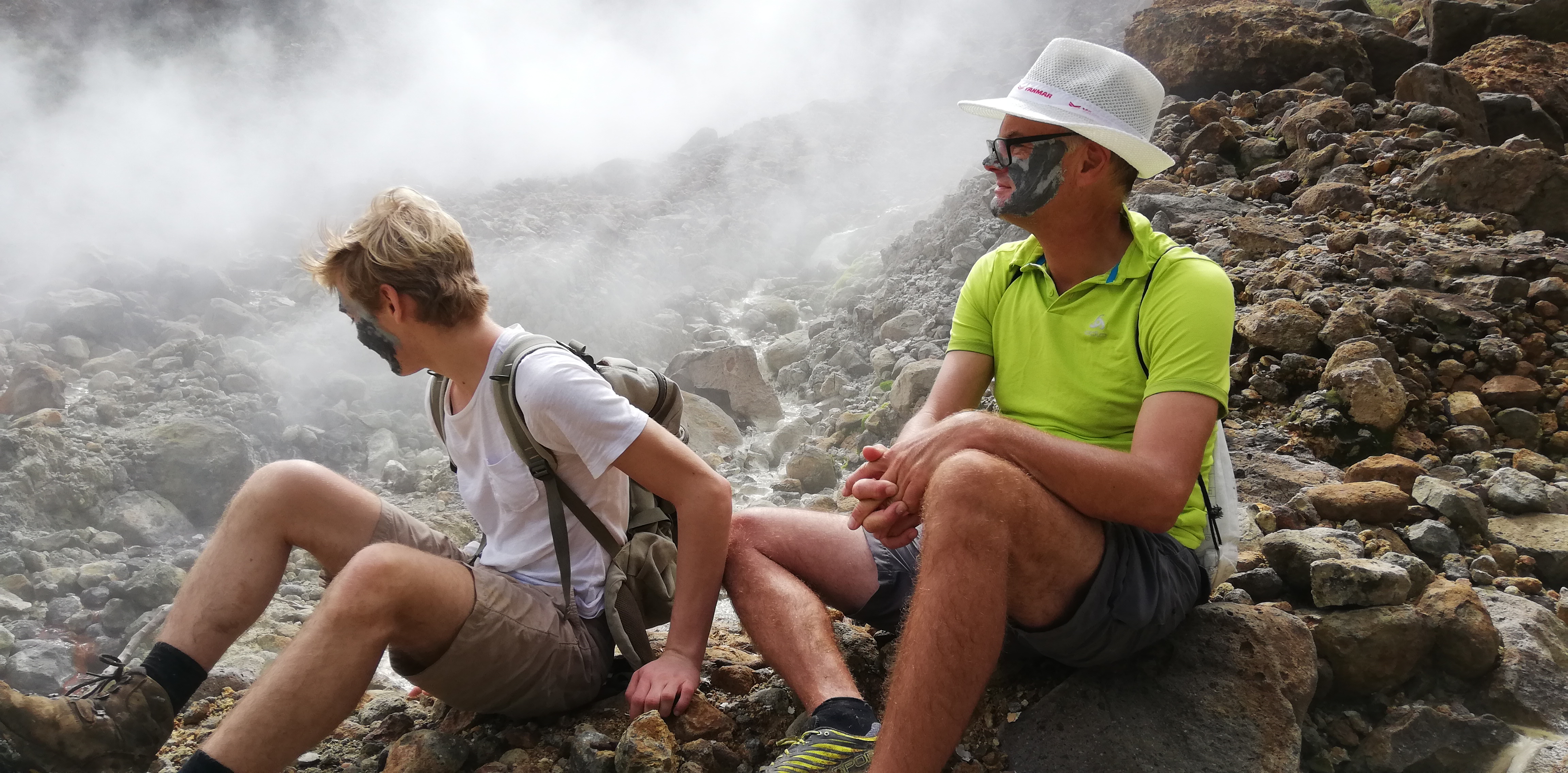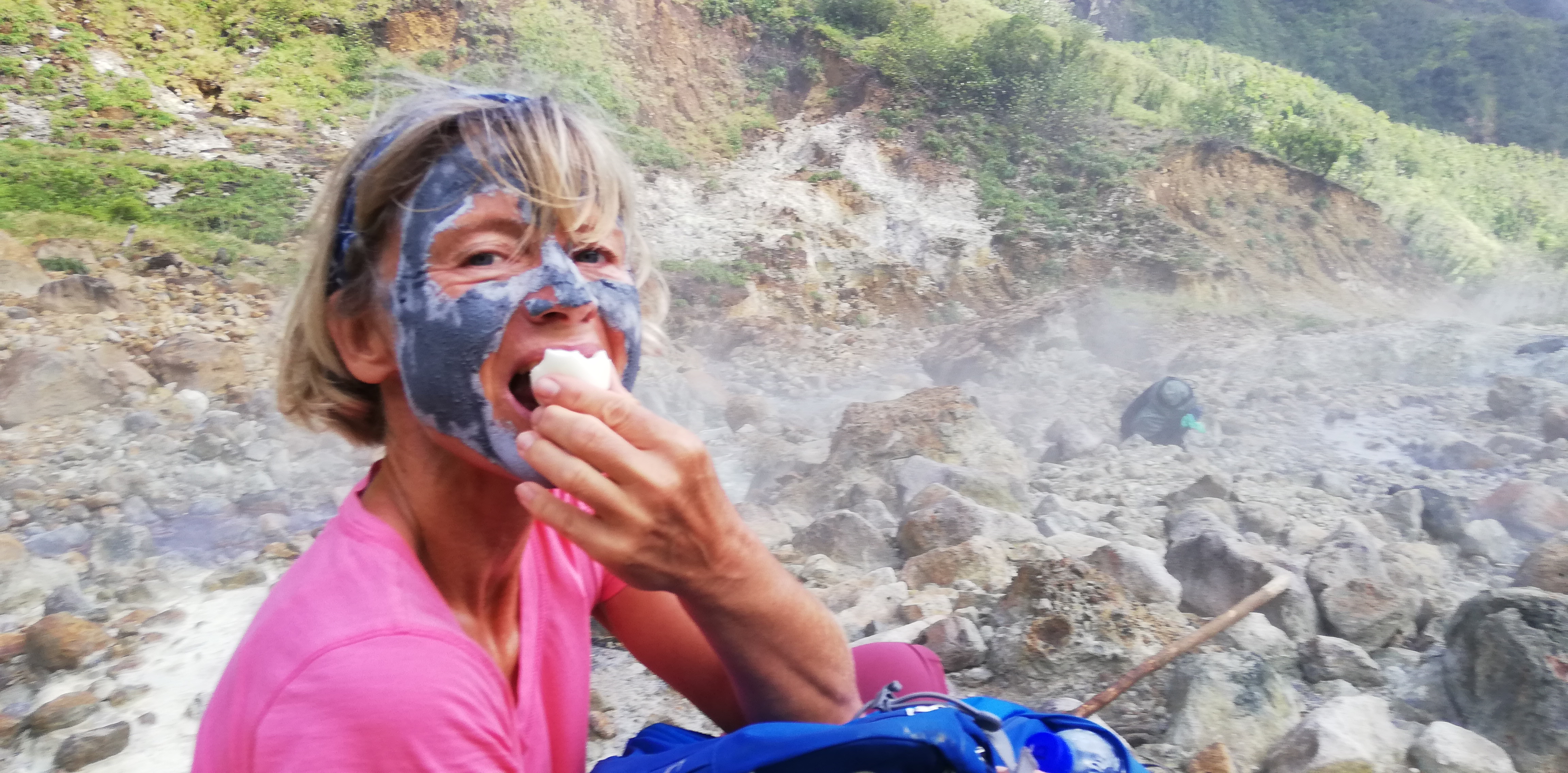 Mittagessen am boiling lakeEines der vielen Naturbäder, wahlweise heiss (wenn aus einer heissen Quelle) oder lauwarm (wenn Quellwasser vermischt mit Wasser aus einer heissen Quelle)In einem der vielen Naturbäder wird endlich die Maske abgewaschen