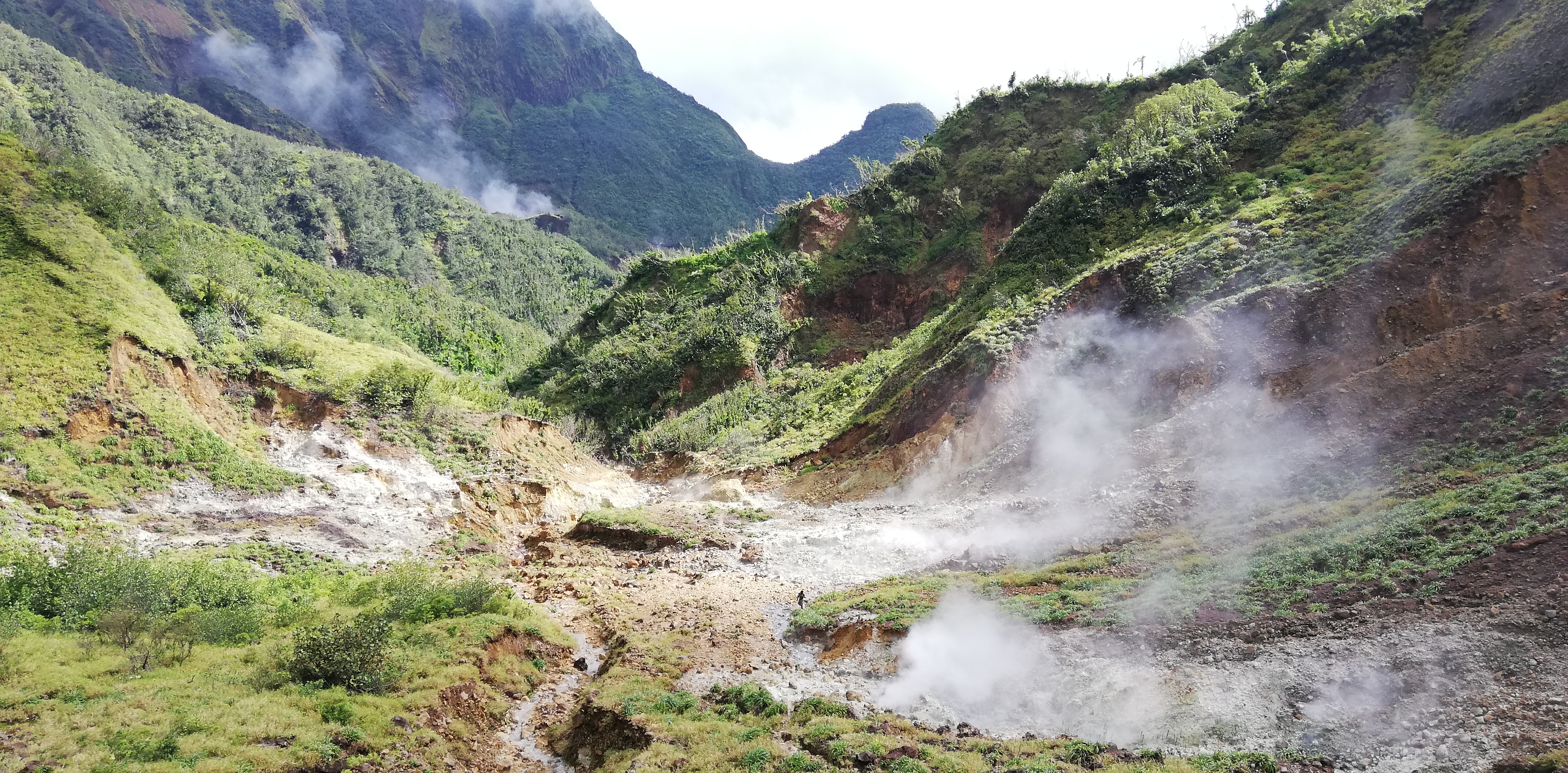 Die Dampfschwaden des boiling lake kommen in Sicht