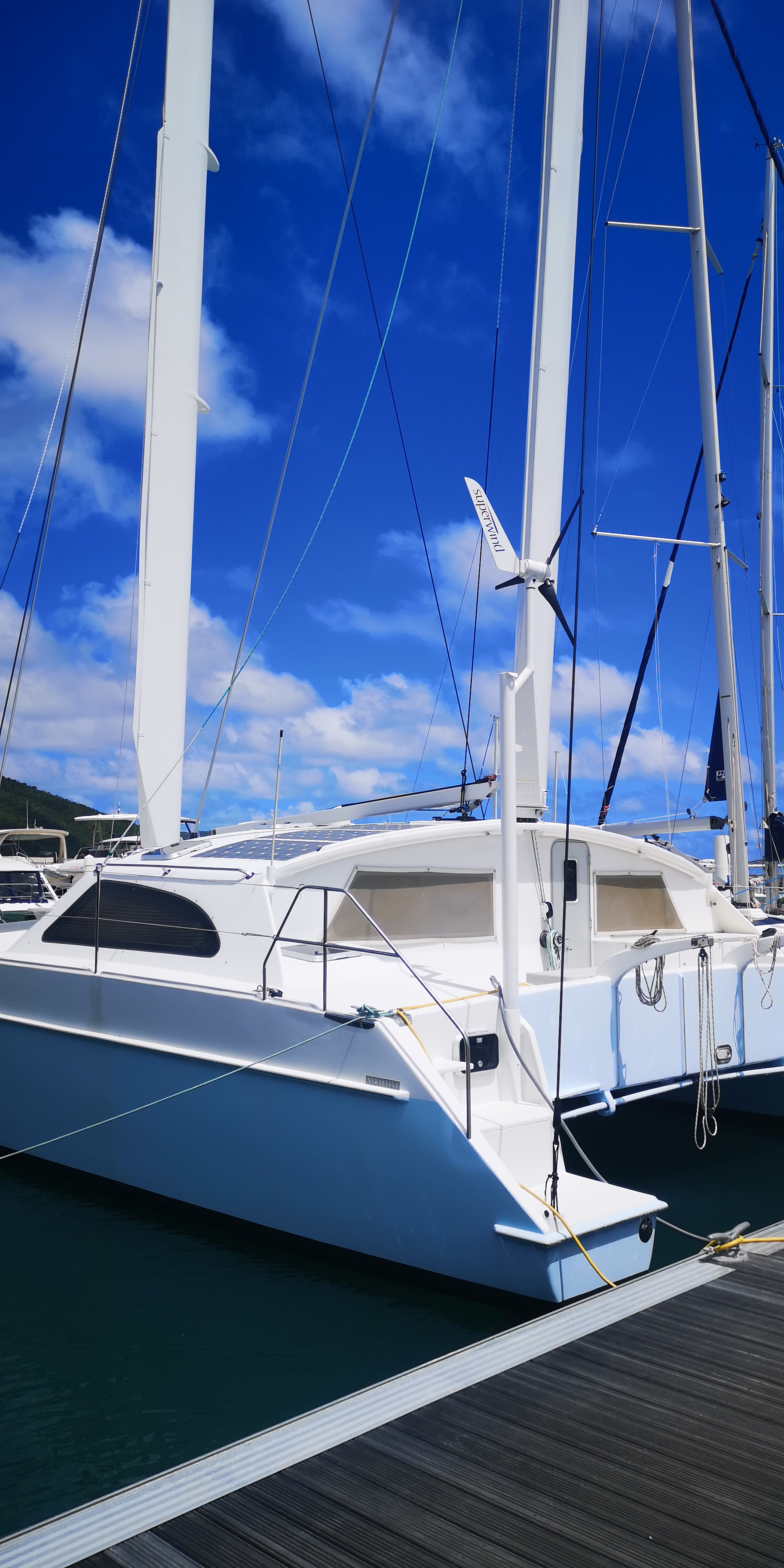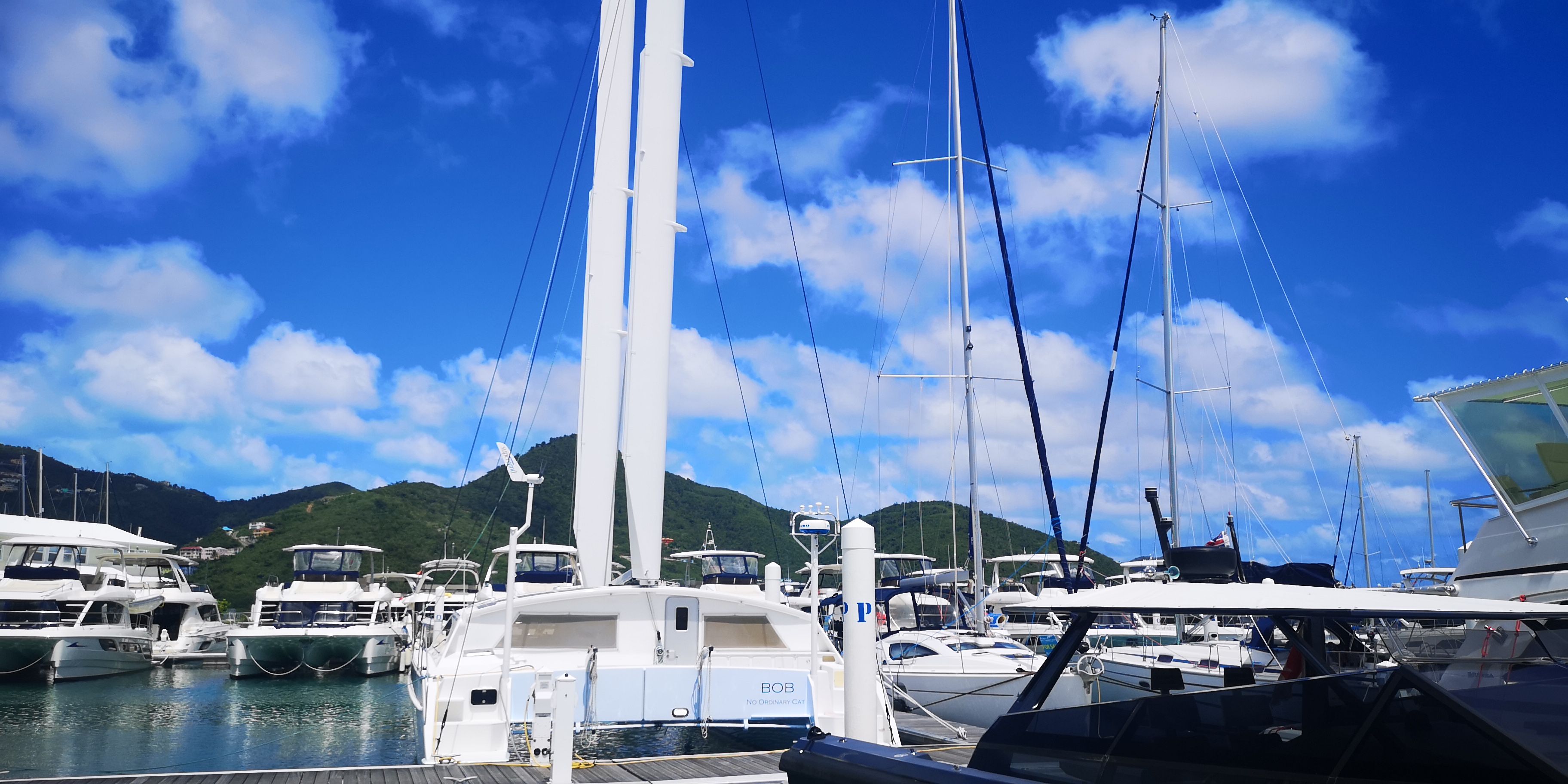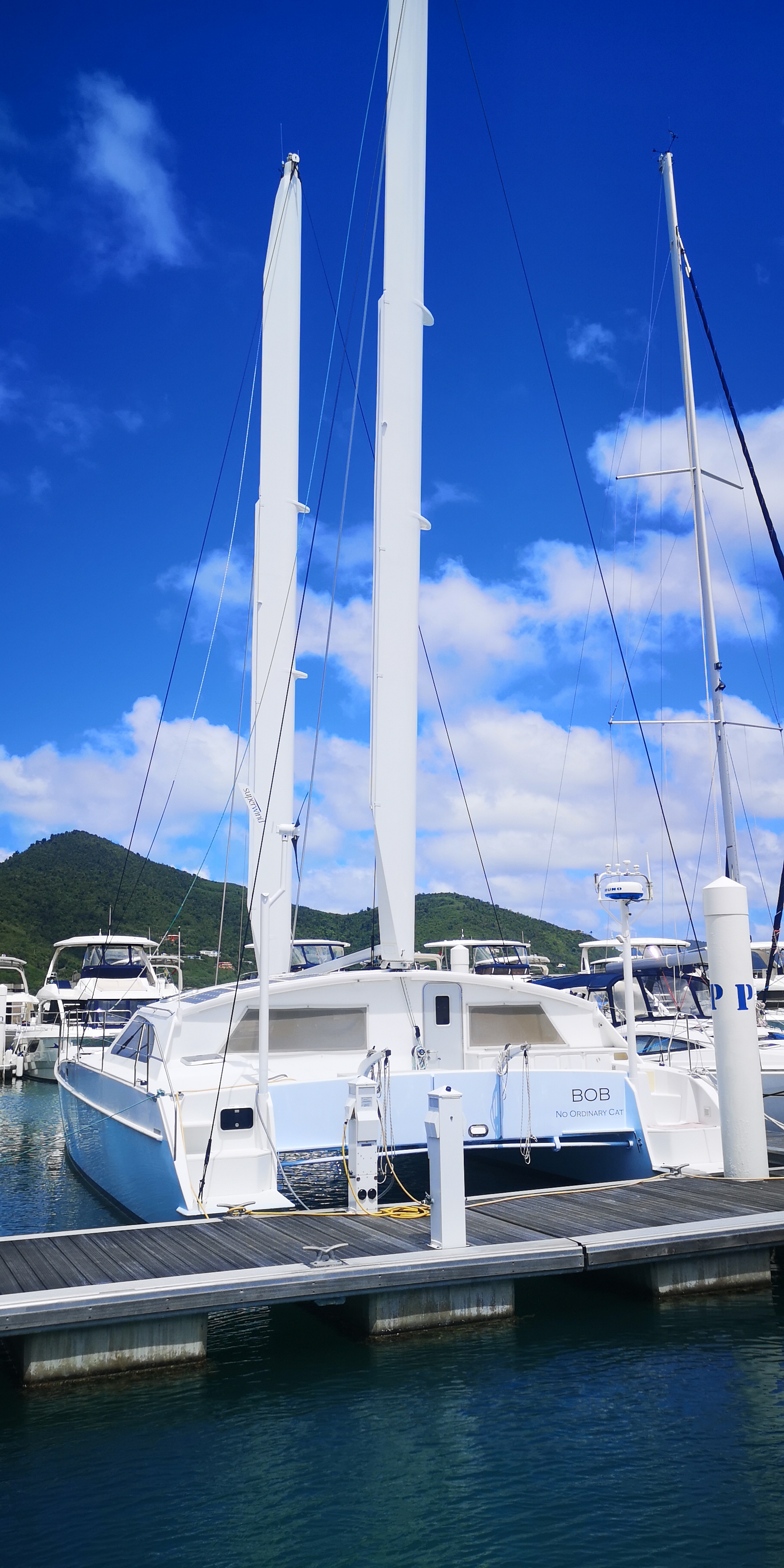 Hier noch ein paar Bilder eines Katamarans, der in der Nanny Cay Marina lag. Mit einer interessanten Segelführung: