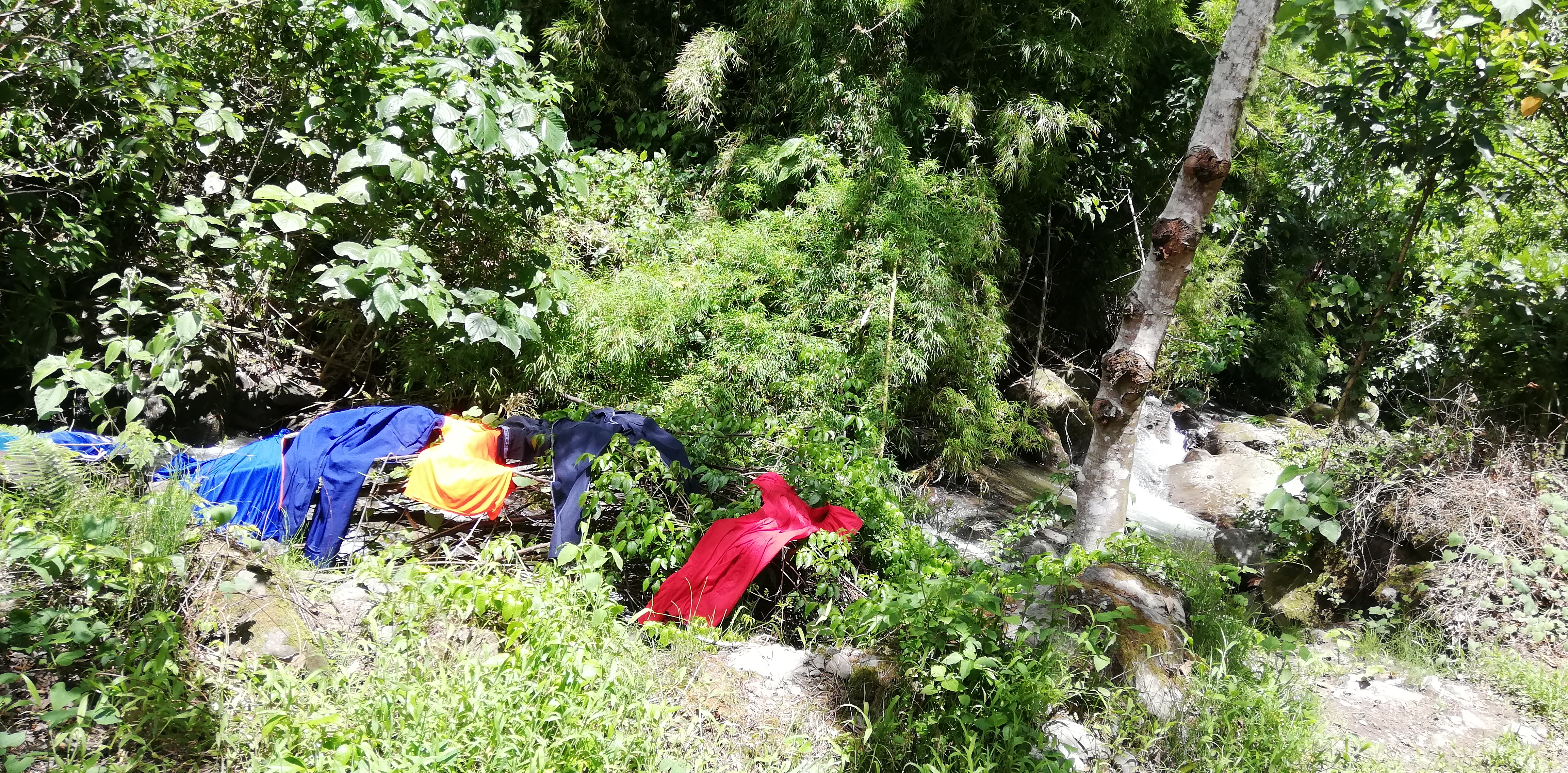 Erstaunlich ist, wie weit oberhalb es noch Wiesenlandschaften gibt. An einer Stelle finden wir nach langem Marsch durch den Wald eine Wiesenlichtung mit Hütte vor. Offenbar hatte(n) in der Hütte zumindest ein wenn nicht zwei Menschen gelebt Seite an Seite mit dem Tierstall und direkt an der Weide.