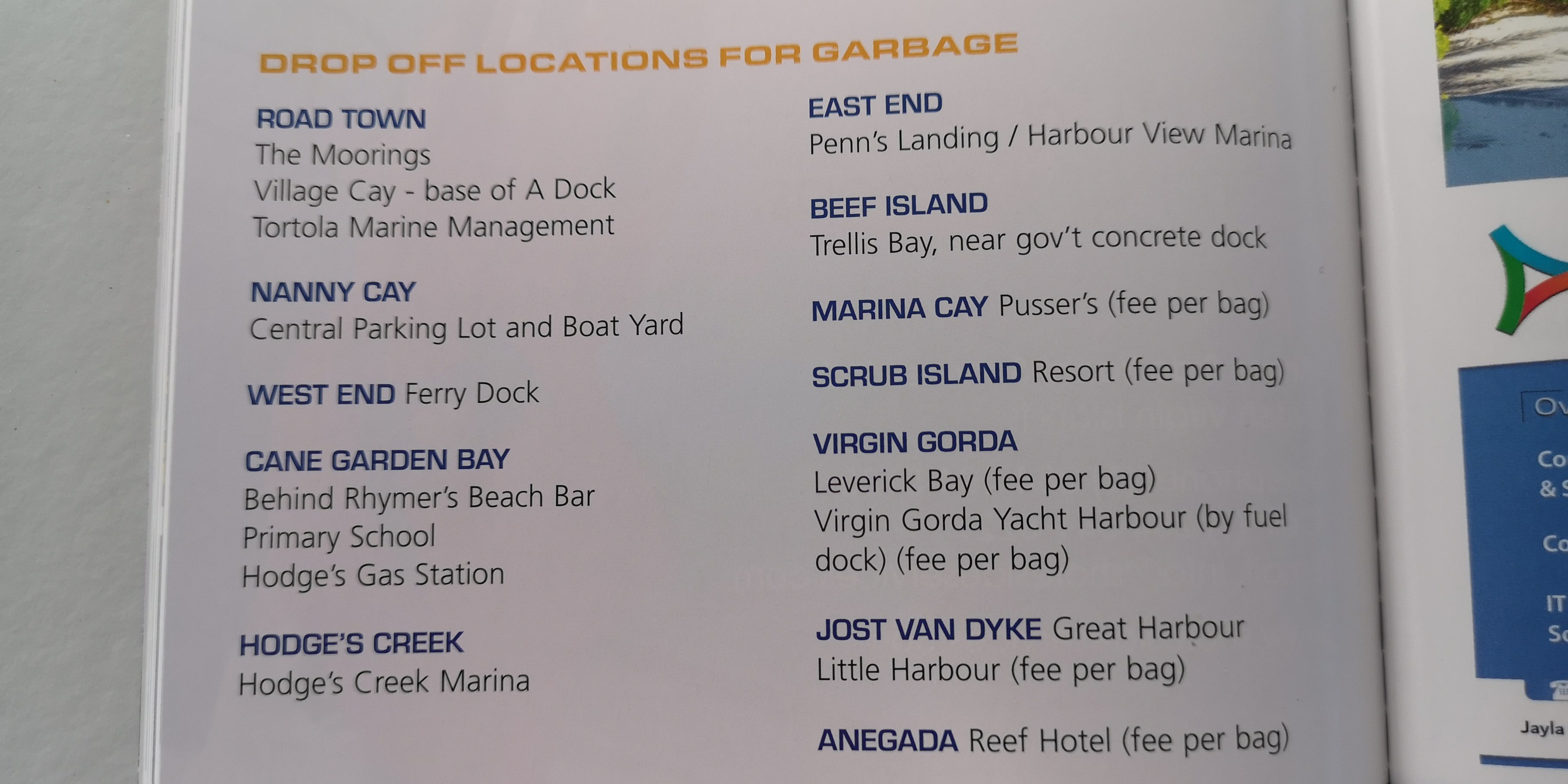 Noch ein Thema beim Segeln in den Virgins: Müllentsorgung. Es gibt offizielle Stellen, oft aber im Ort auch öffentliche Mülltonnen, die man sich suchen muss. An den offiziellen Stellen wird des öfteren ein Beitrag von 3 US Dollar verlangt, völligin Ordnung, ist ja schließlich auch Aufwand, die Entsorgung unserer Abfälle. In Tortola West End ließ der Costums-Officer Mutter und Sohn mit dem Abfall zur Tonne außerhalb des Costums Geländes passieren, um anschließend bei der Rückkehr die Papiere zu verlangen. Da wir nicht zum Ein-, sondern zum Ausklarieren dort waren, gab es keine Probleme. Wäre der Müll entsorgt worden, während der Captain im Office einklarierte, hätte es wohl Ärger gegeben. Hier die offiziellen Abfall-Entsorgeplätze: