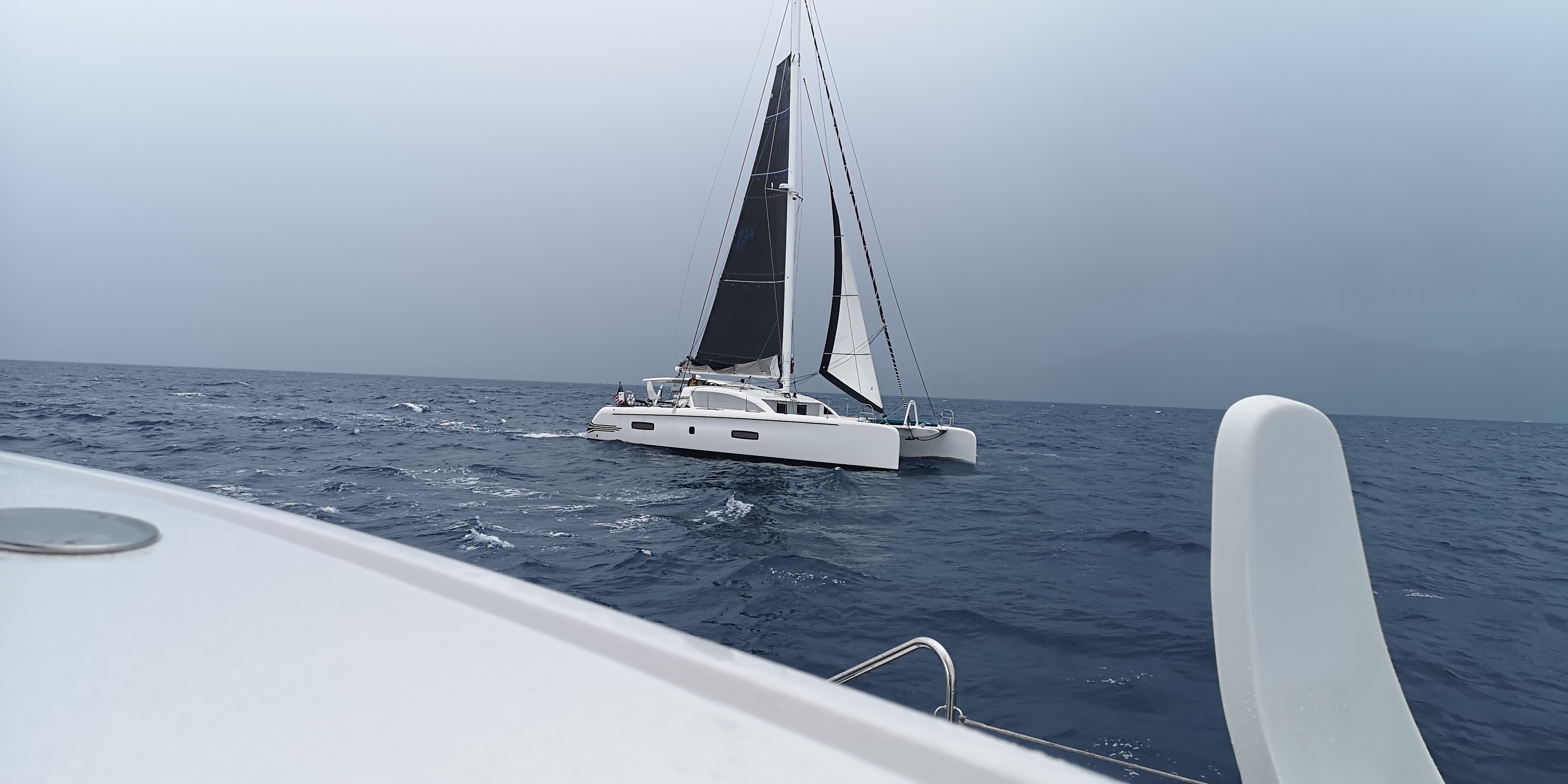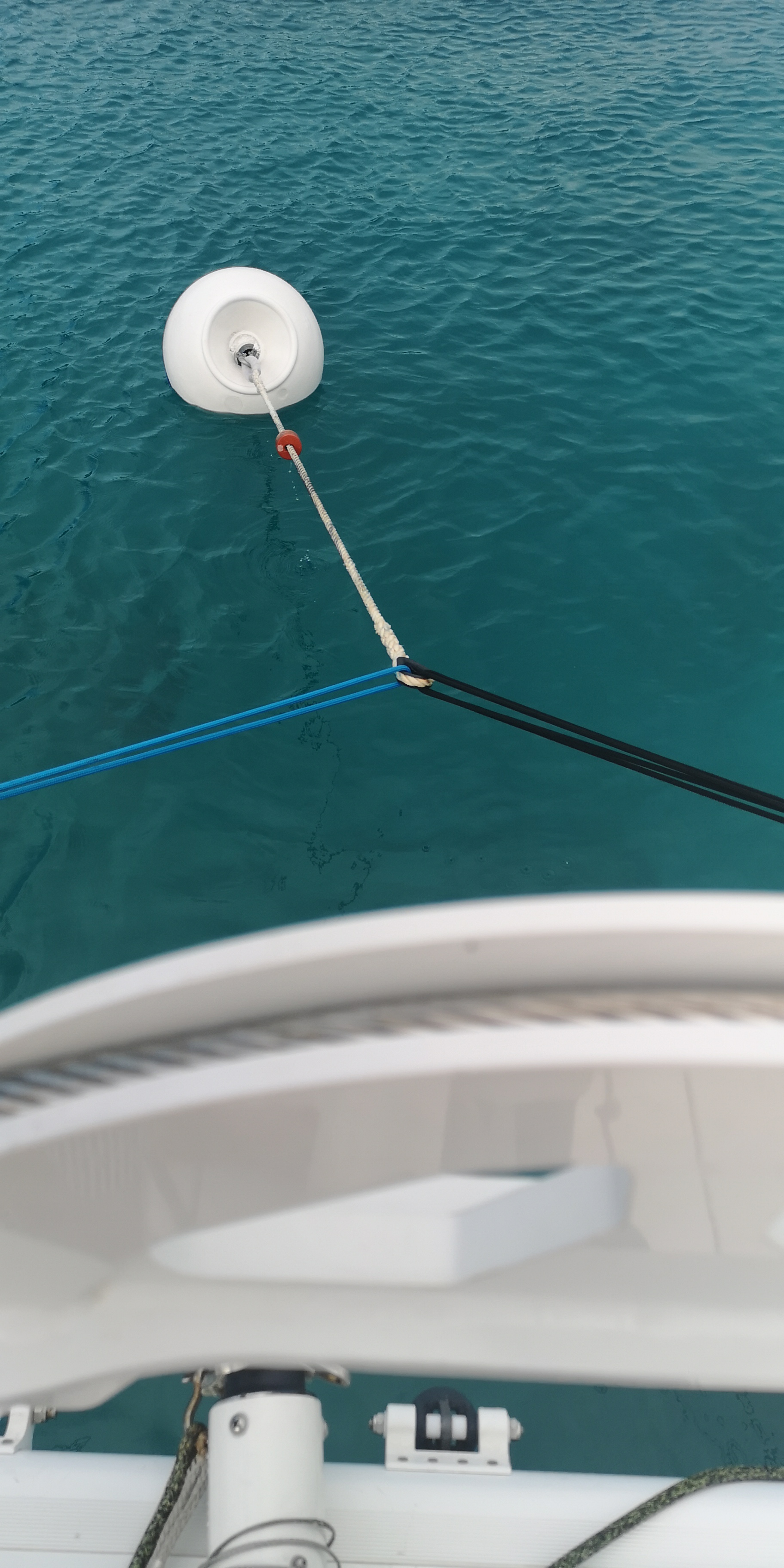 Dann dreht sich INVIA schon mal so, dass die Boje entlastet wird, INVIA sich dreht und die Boje zwischen die Rümpfe kommt. Kein Problem an sich – nur wenn dann just in diesem Moment wieder der Wind aus der ursprünglichen Richtung und mit 20-25kn einsetzt, bewegt sich INVIA nach vorne & die Boje nach hinten – bis die beiden Festmacher an der Boje an den Dynema-Leinen des Bugspriets zerren und den Bugspriet mit enormer Kraft nach unten ziehen.