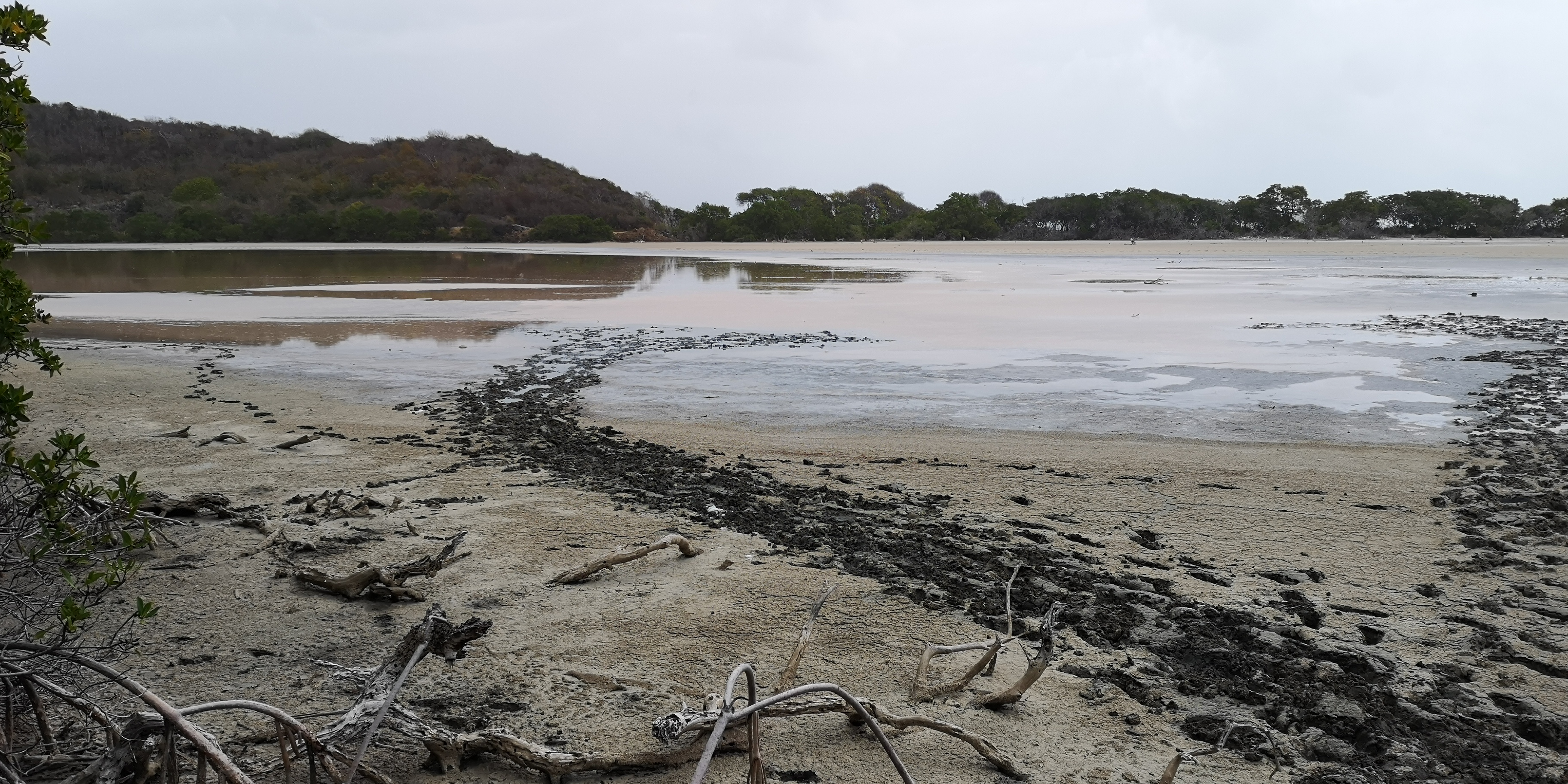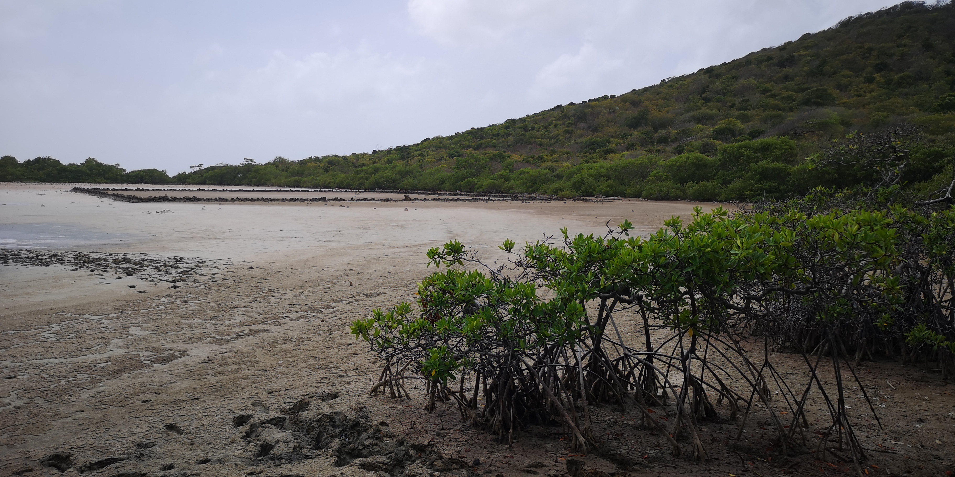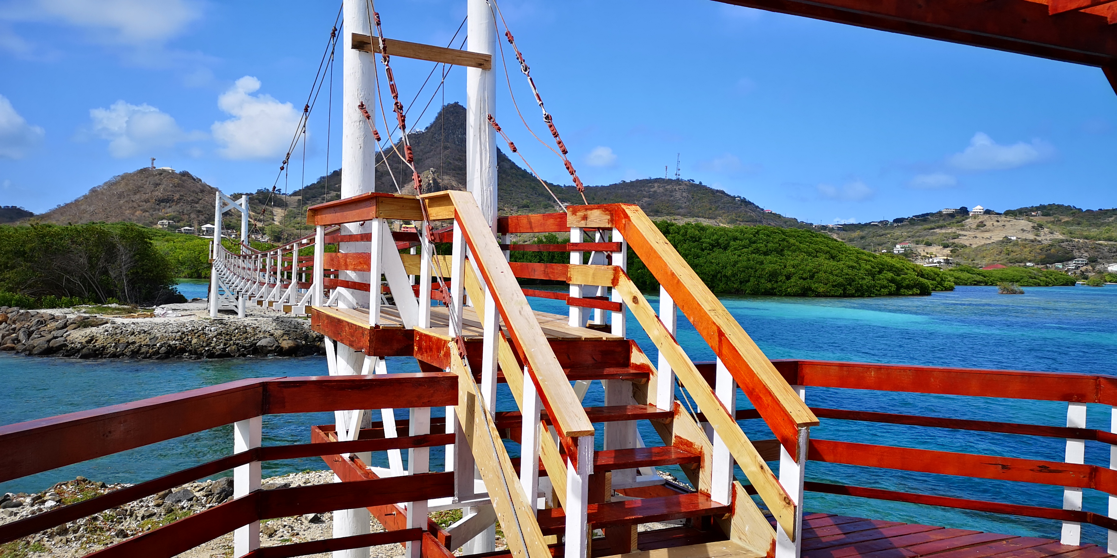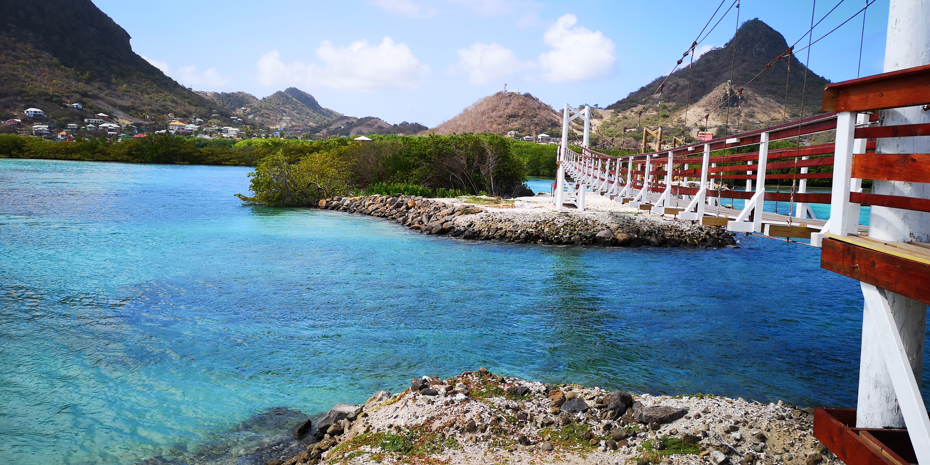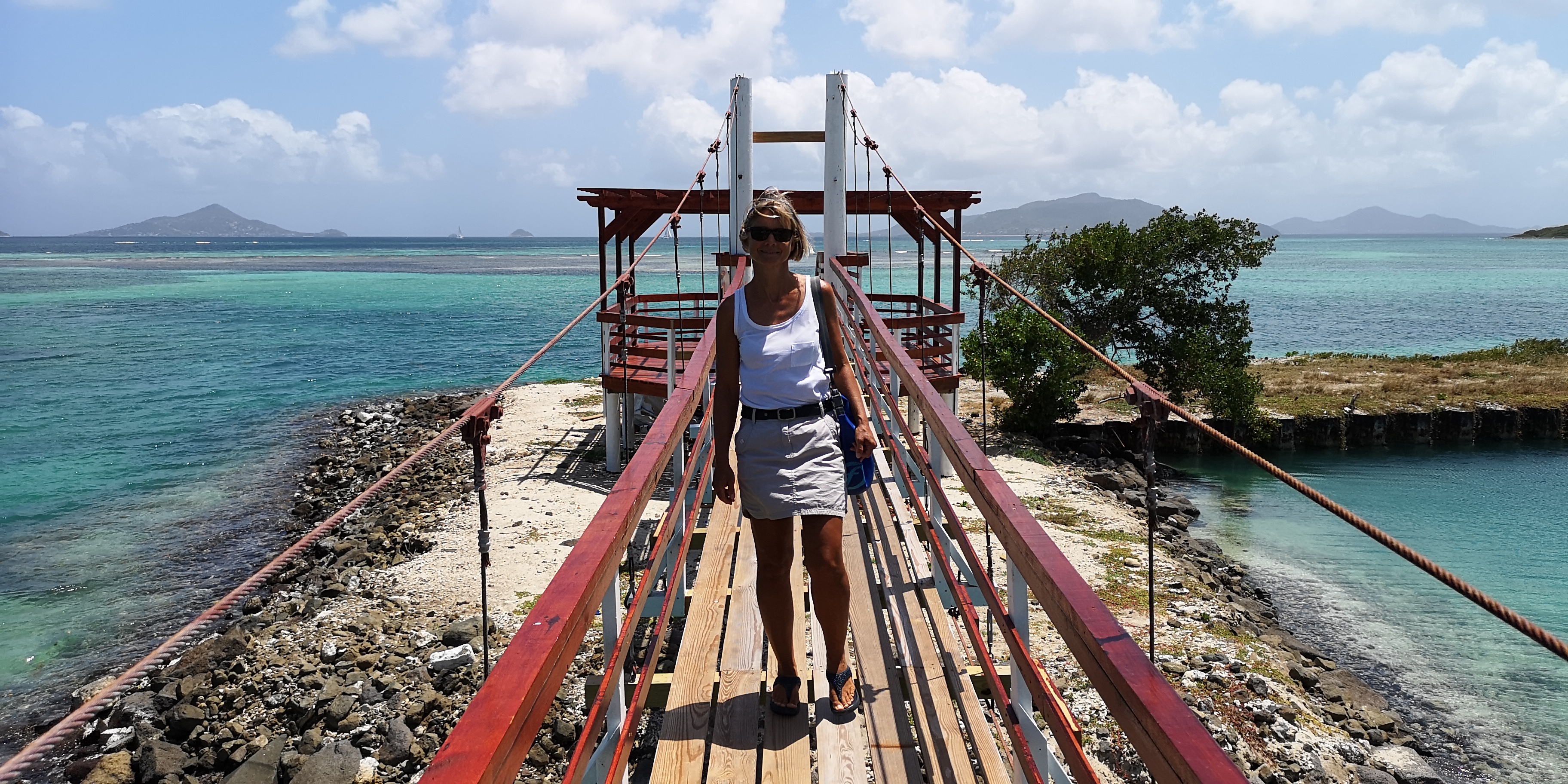 Einen Nachmittag verlegen wir uns von Clifton in die Ashton Lagoon im Süden von Union Island. Die Lagune mit dem vorgelagerten Frigate Island ist schon seit 1986 Naturschutzgebiet. Ungeachtet örtlicher Proteste erhielt 1993 ein Investor die Genehmigung zum Bau einer Marina mit 300 Plätzen samt Eigentumswohnungen. Frigate Island wurde über einen Damm mit Union Island verbunden. Die Arbeiten mussten wegen Bankrotts bereits nach einem Jahr eingestellt werden. Zurück blieb eine abgeschlossenen Lagune, deren Ökosystem mangels Frischwasserzufuhr umzukippen drohte. Die örtliche NGO SusGren ließ mit Spenden den Damm durchbrechen, um das Ökosystem zu retten (siehe www.susgren.org). Heute führen Hängebrücken über die Dammdurchbrüche und ein Fußweg mit liebevoll gestalteten Holzschildern geht durch die Mangroven bis zur Straße nach Ashton.