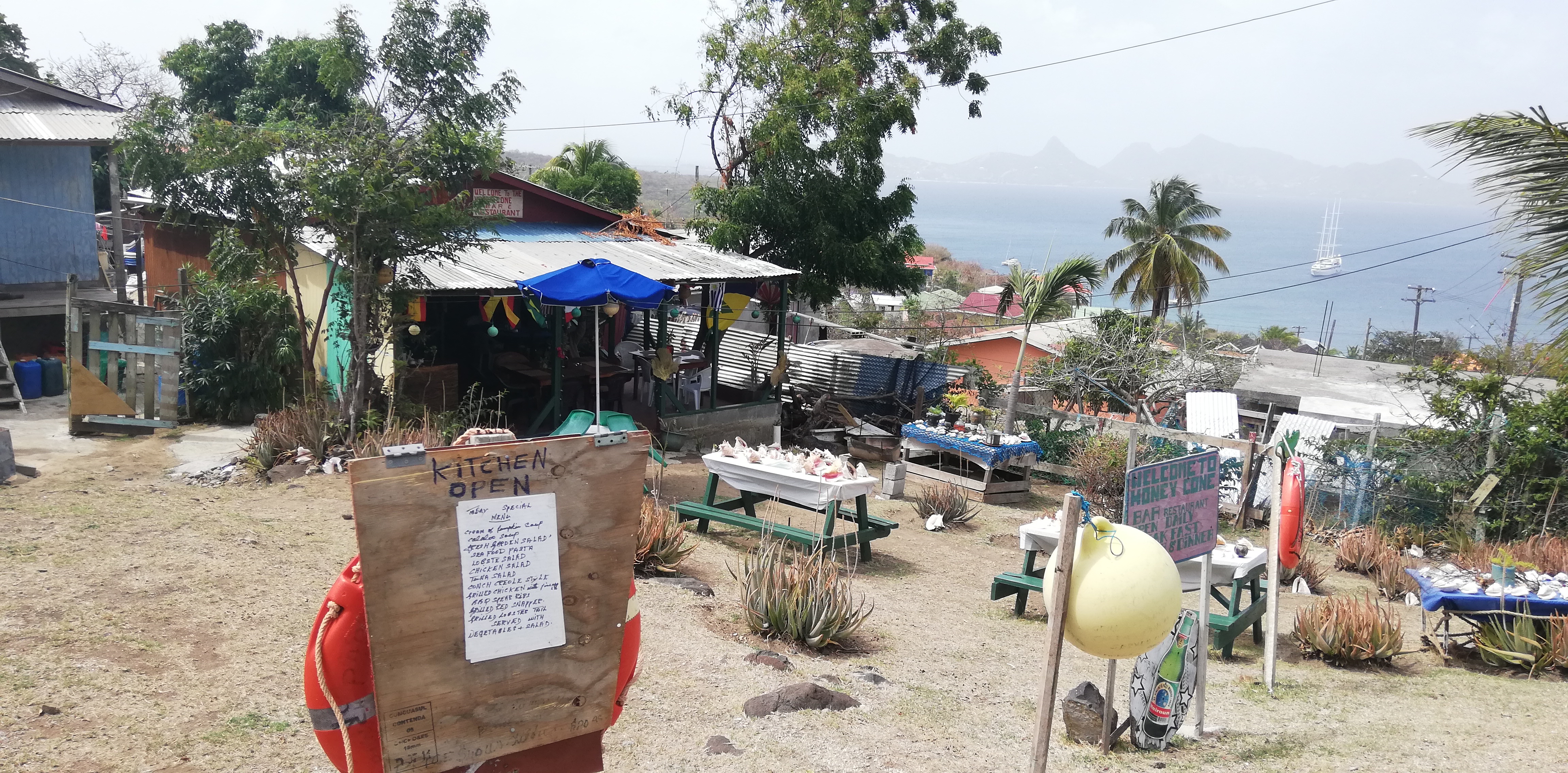 Soll aber nun keinesfalls heissen, auf Mayreau gäbs nichts zu essen! Die Saline Bucht auf der anderen Seite der Insel z.B. ist näher am Ort. Und im Ort finden sich zahlreiche Bars & Restaurants, wie z.B. dieses hier: