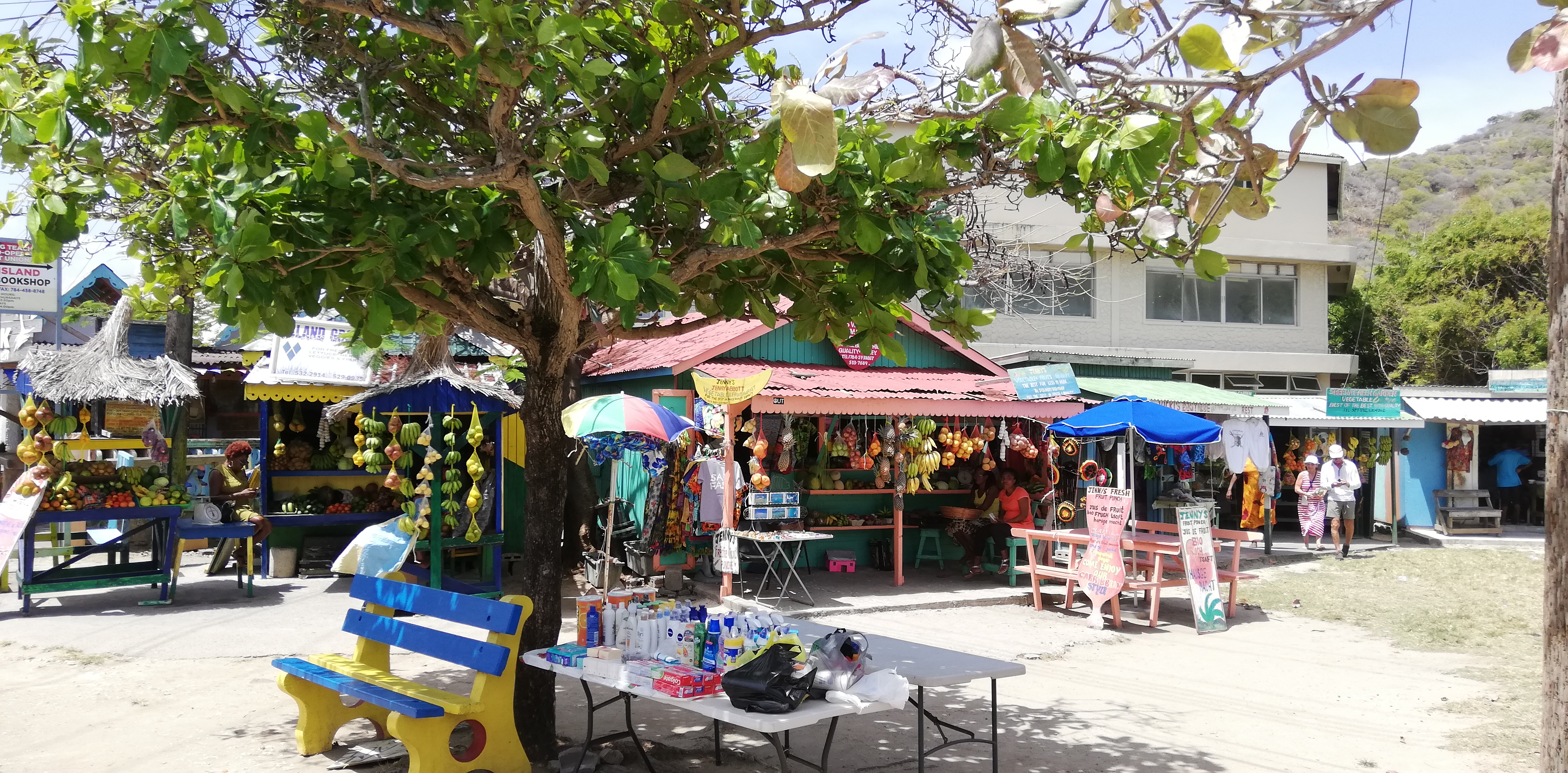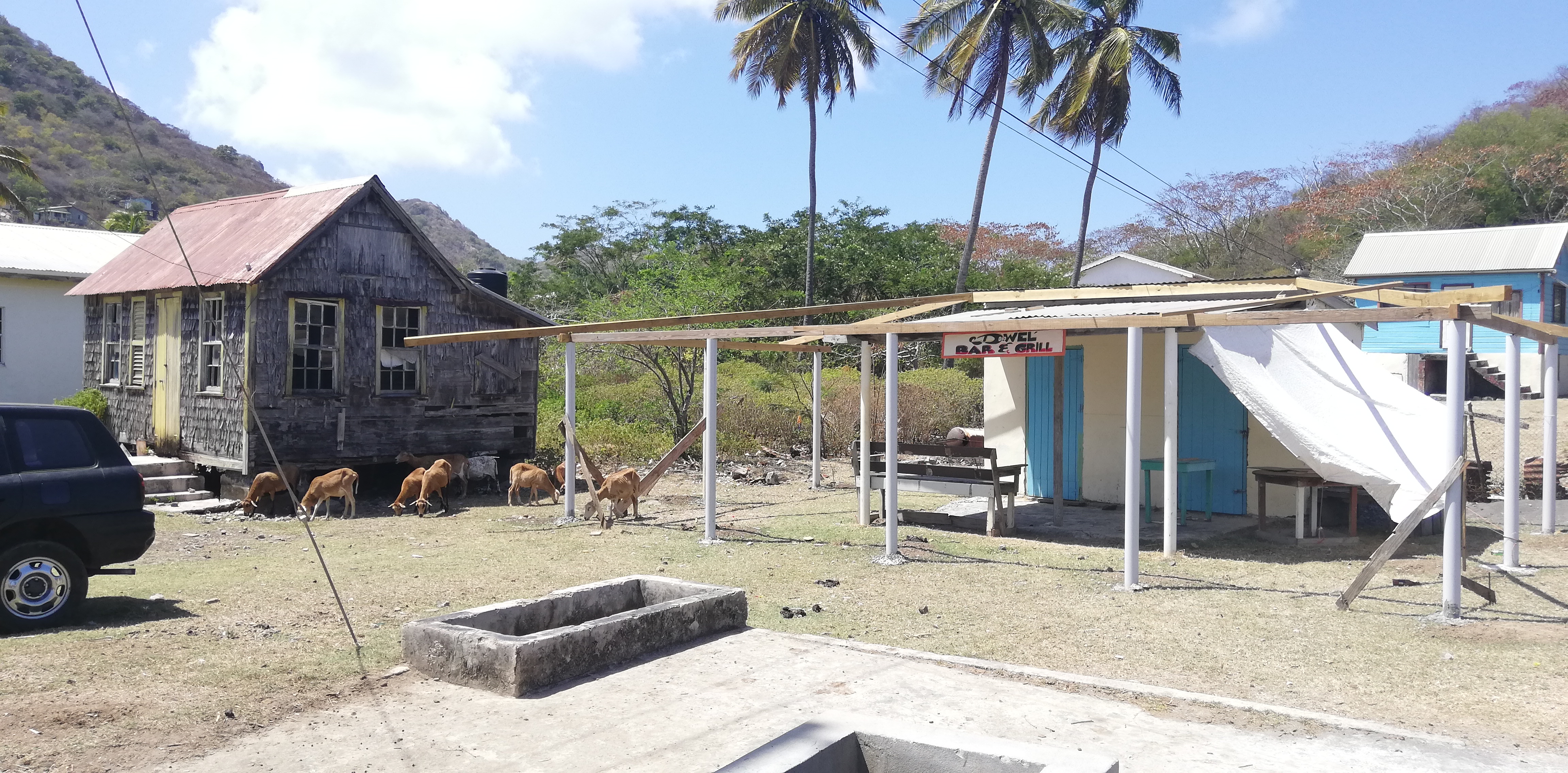 Obst und Gemüse stammen überwiegend aus St Vincent. Union Island selbst hat zu wenig Wasser für den Anbau. Wasserknappheit ist nach drei trockenen Jahren ein großes Problem auf der Insel. Auf einer Taxirundtour weist uns der Fahrer jeweils explizit auf die Stellen hin, an denen Regenwasser gesammelt und an die Bewohner abgegeben wird. Brunnen zum Wasserholen gab es früher mehr, heute sind sie entweder trocken oder versalzen. Eine Meerwasserentsalzungsanlage hat z.B. das Anchorage Hotel. Aber auch dort reicht das Wasser nur für das Essentielle. Die Wäsche z.B. wird zum Waschen nach St Vincent(!) gebracht. Und der Wäscheservice für Yachties existiert derzeit wegen Wassermangels nicht.