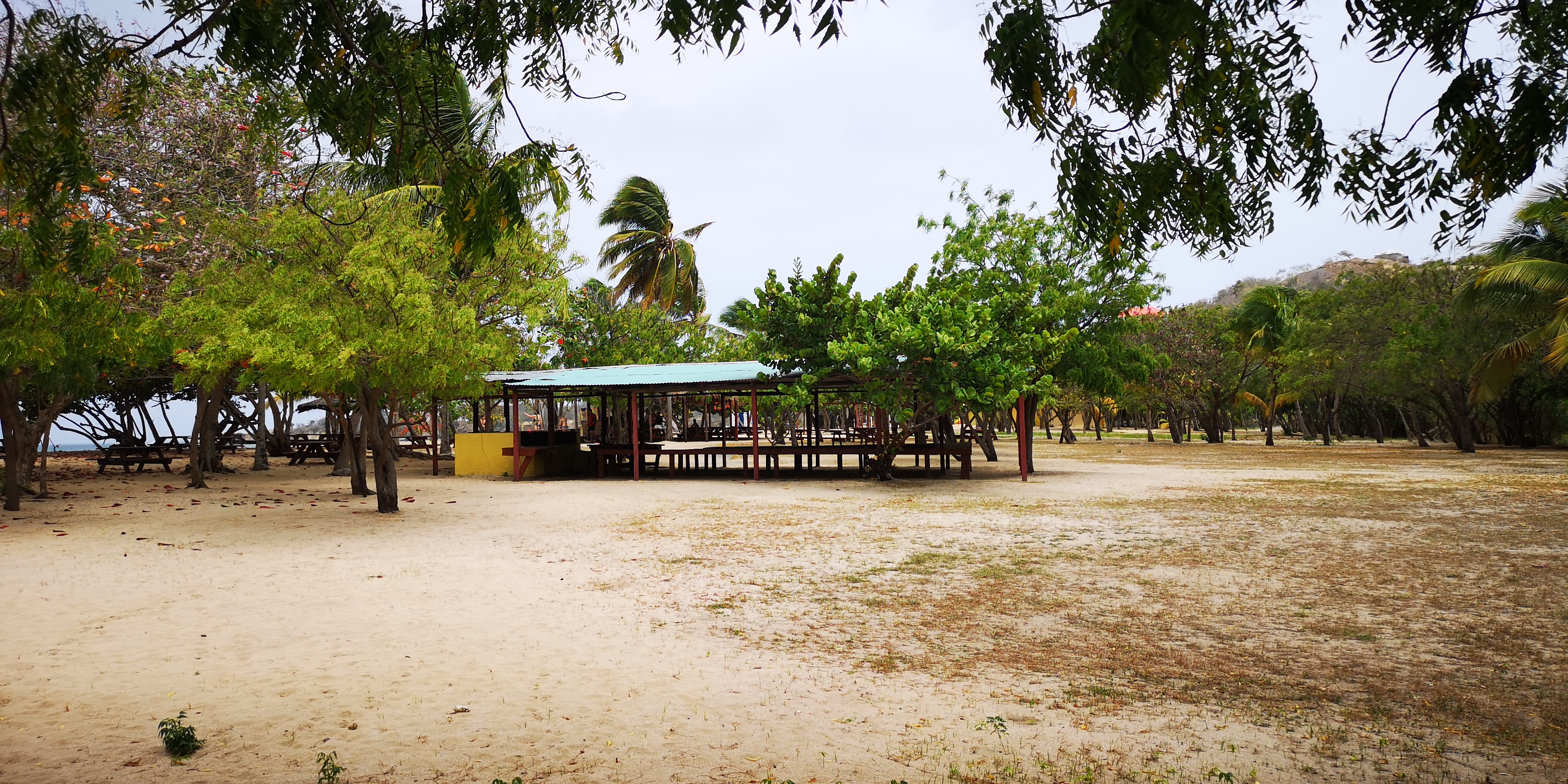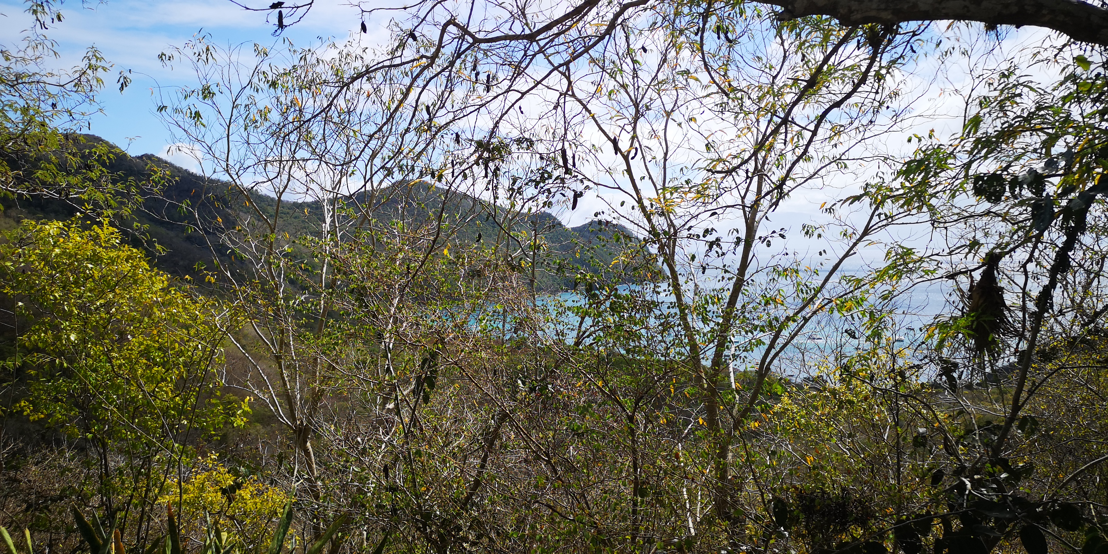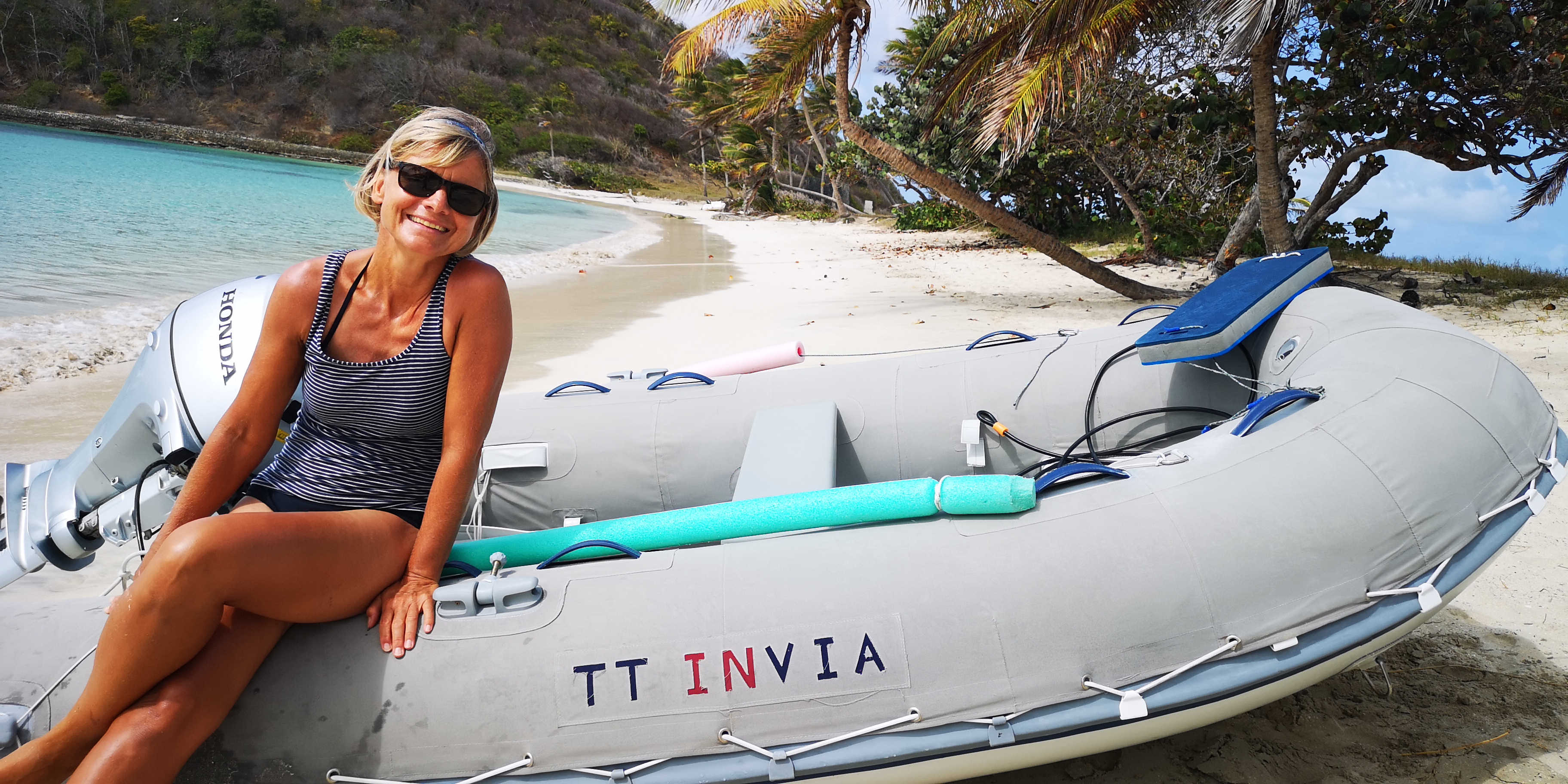 Schade ist, dass es keinen funktionierenden Dinghy-Steg mehr gibt. So muss man, will man trockenen Fußes anlanden, das Dinghy den Strand hoch ziehen. Mitsamt unserem (viel zu schweren weil 4-Takt) Aussenborder. Und dort natürlich irgendwie gegen Diebstahl sichern, denn wir wollen uns ein wenig die Insel erwandern. Die capitania biegt eine Palme zurecht, und ich lege unser Stahlseil darum, gesichert mit dem Vorhängeschloss. Passt!