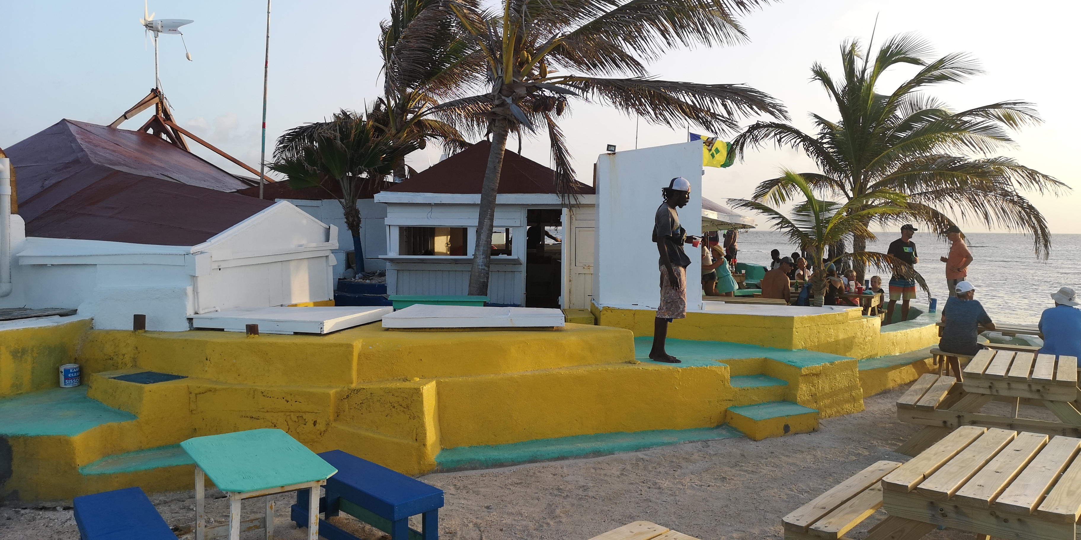 Auf dem Weg zur Einfahrt in das ringsherum von Riffen umgebene Clifton Harbour nehmen wir zunächst Kurs auf Happy Island. Ein findiger lokaler Unternehmer hat die Insel – angeblich größtenteils aus Schalen der Conch-Muscheln – aufs flache Riff gebaut. Und eine Bar obendrauf. Schon aus der Ferne sieht diese Insel einladend aus!