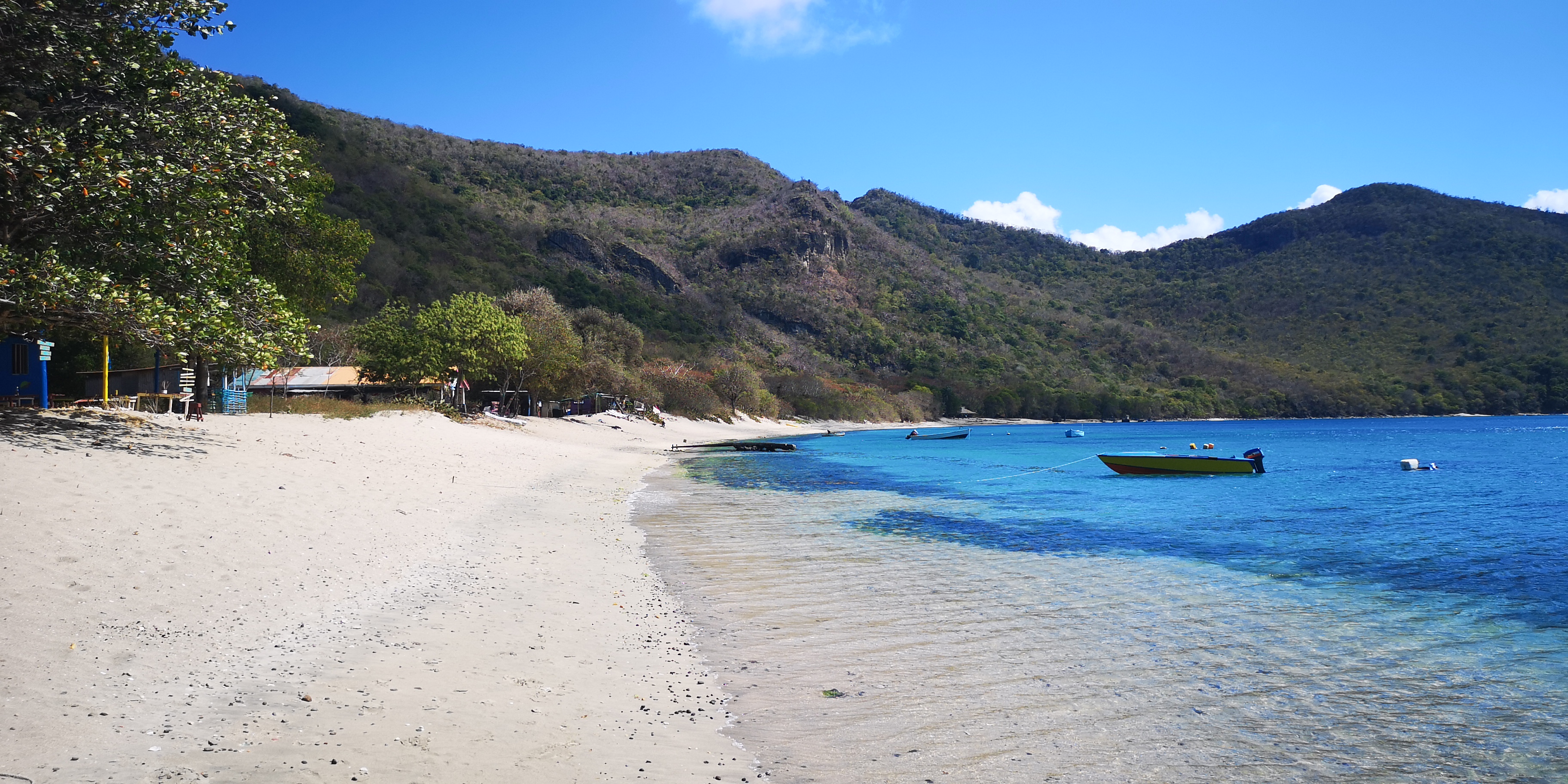 Wenn wir den Strand mit seinen wenigen kleinen und noch kleineren Bars erstmal besichtigen konnten. Gegen 16:00, als wir zurück auf der INVIA sind, kommt er dann auch wieder, mit seiner Freundin Nathalie an Bord. Wollte wohl nachfragen, ob wir in ihr Restaurant kommen. Anstatt dann rechtzeitig einzulenken um längsseits zu gehen, knallt er mit dem Bug in die Backbordseite. Unterhalb des Fensters, zum Glück nicht ins Fenster. Ja, was soll man da nun machen? Wärs einem anderen Segler passiert, würde ich die Versicherungsdaten austauschen oder mich sonstwie einigen. Aber eine Versicherung haben die Boatboys hier wohl kaum und Geld erst recht nicht. Immerhin wartet er ab, bis ich mir alles ansehen kann. Die ebenfalls genervte capitania gibt ihm zu verstehen, er solle auf keinen Fall wieder kommen, und so zieht er ab.