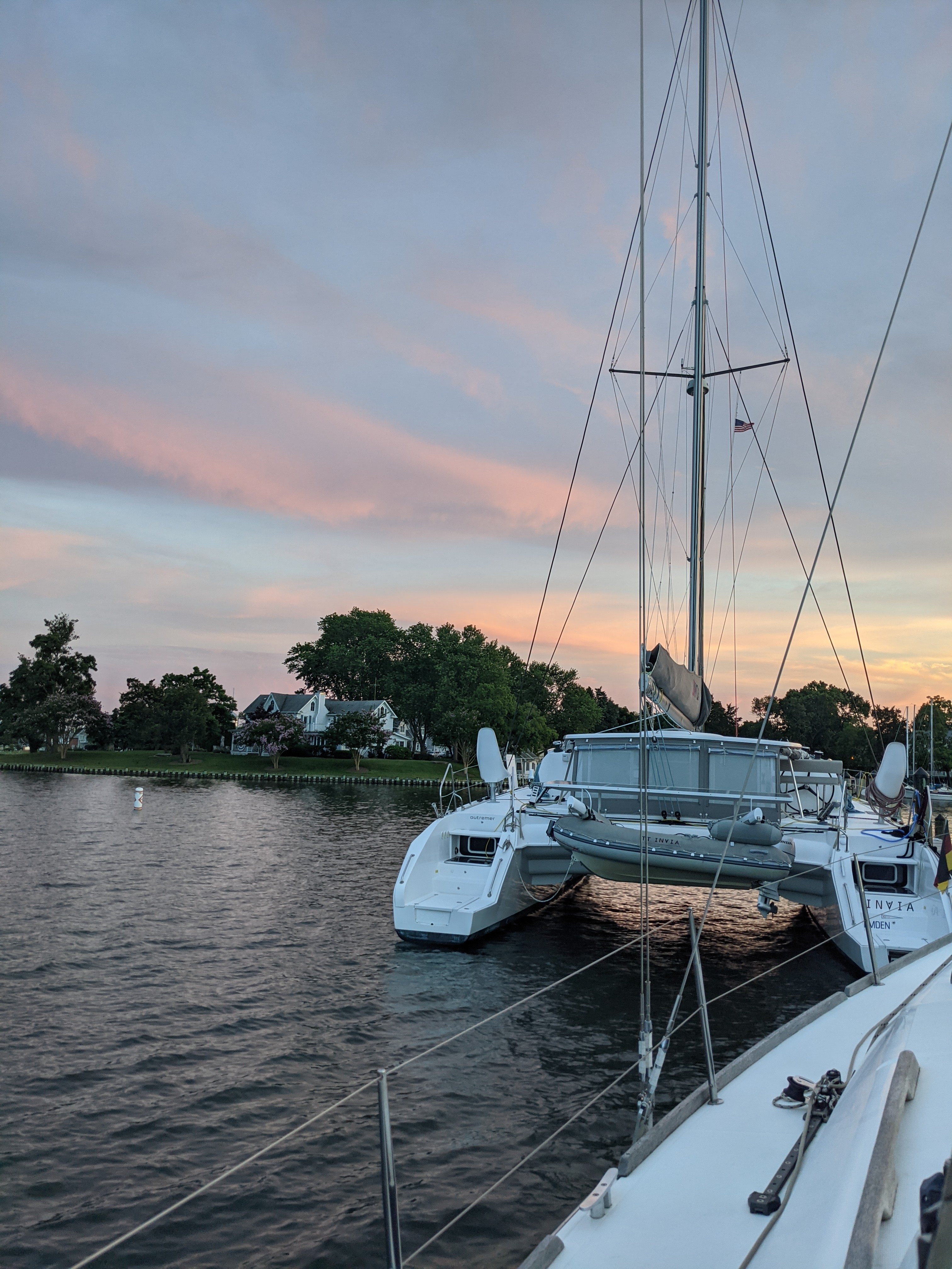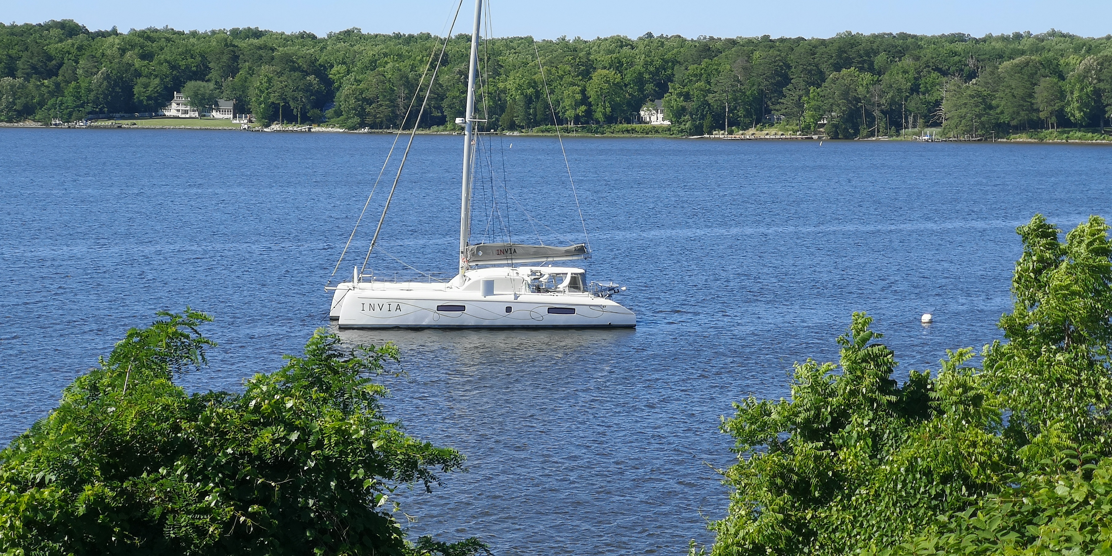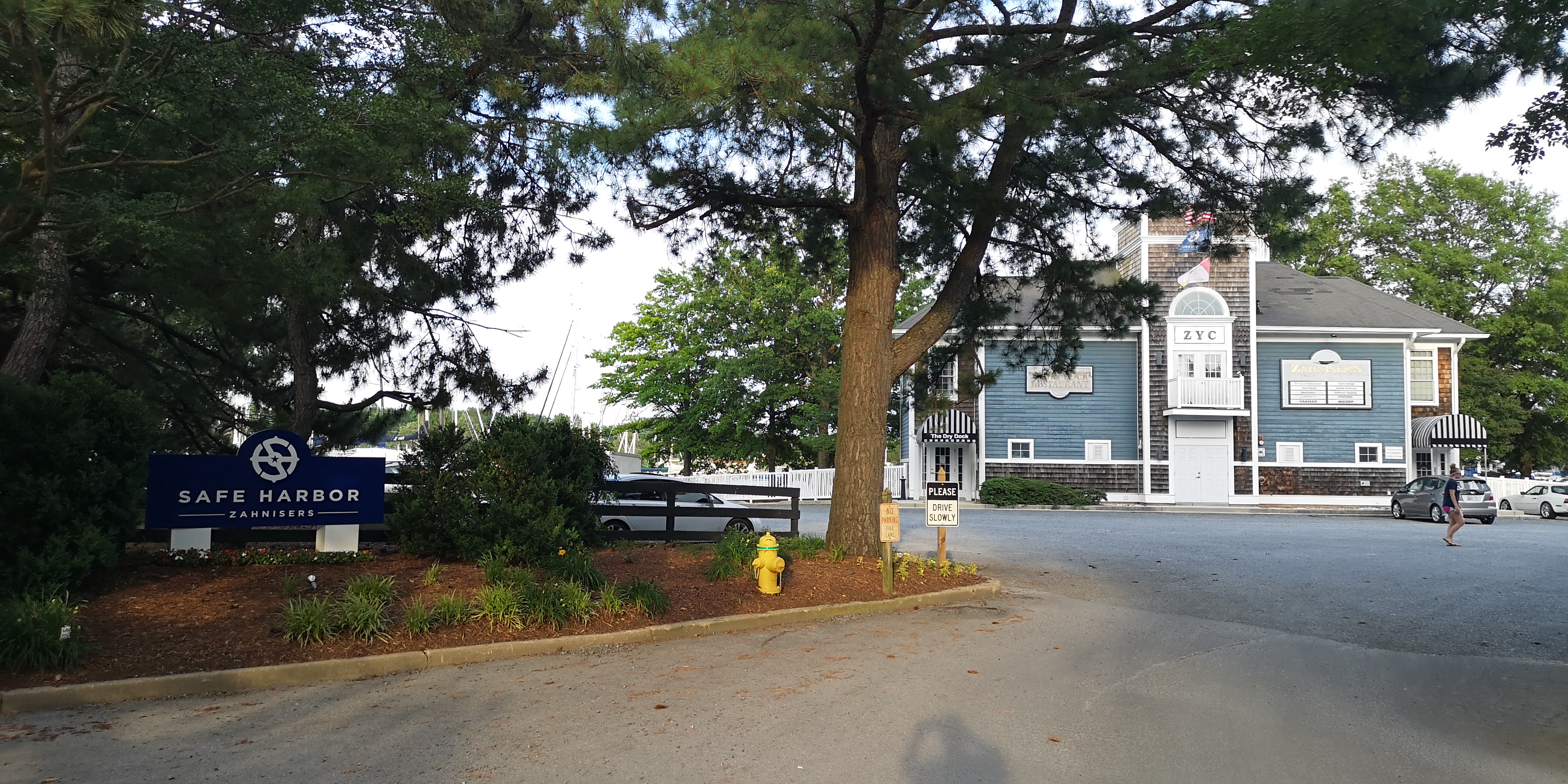 Aber ich möchte zum Impftermin nicht vor Anker, sondern in einer Marina liegen. Falls einer von uns stärkere Nebenwirkungen verspürt sollte medizinische Hilfe unkompliziert an Bord kommen können. Auch wenn sich nur einer von uns krank fühlen sollte, ist es mit direktem Landanschluss und einer Marina-Infrastruktur angenehmer: Mit Landstrom können wir die Klimaanlage laufen lassen, jederzeit von Bord, haben genug Wasser usw. Die Chesapeake Bay hat viele Marinas und zig Tausende, eher wohl Hunderttausende, von Liegeplätzen. Nur sind die meisten für kleinere Schiffe, meist Motorboote, ausgelegt. Ein 51 Fuss langer Katamaran wie INVIA sprengt vielfach die Grenzen. Deswegen müssen wir rechtzeitig im Voraus reservieren – und sind daher weniger flexibel. Für unseren Impftermin habe ich uns 4 Nächte in der Safe Harbor Marina Zahnisers gebucht. Den Termin wollen wir einhalten. Solomons Islands liegt nur etwa 8 Meilen von Leonhardtown entfernt – wenn man den Landweg nimmt. Übers Wasser hingegen ist es erheblich länger.