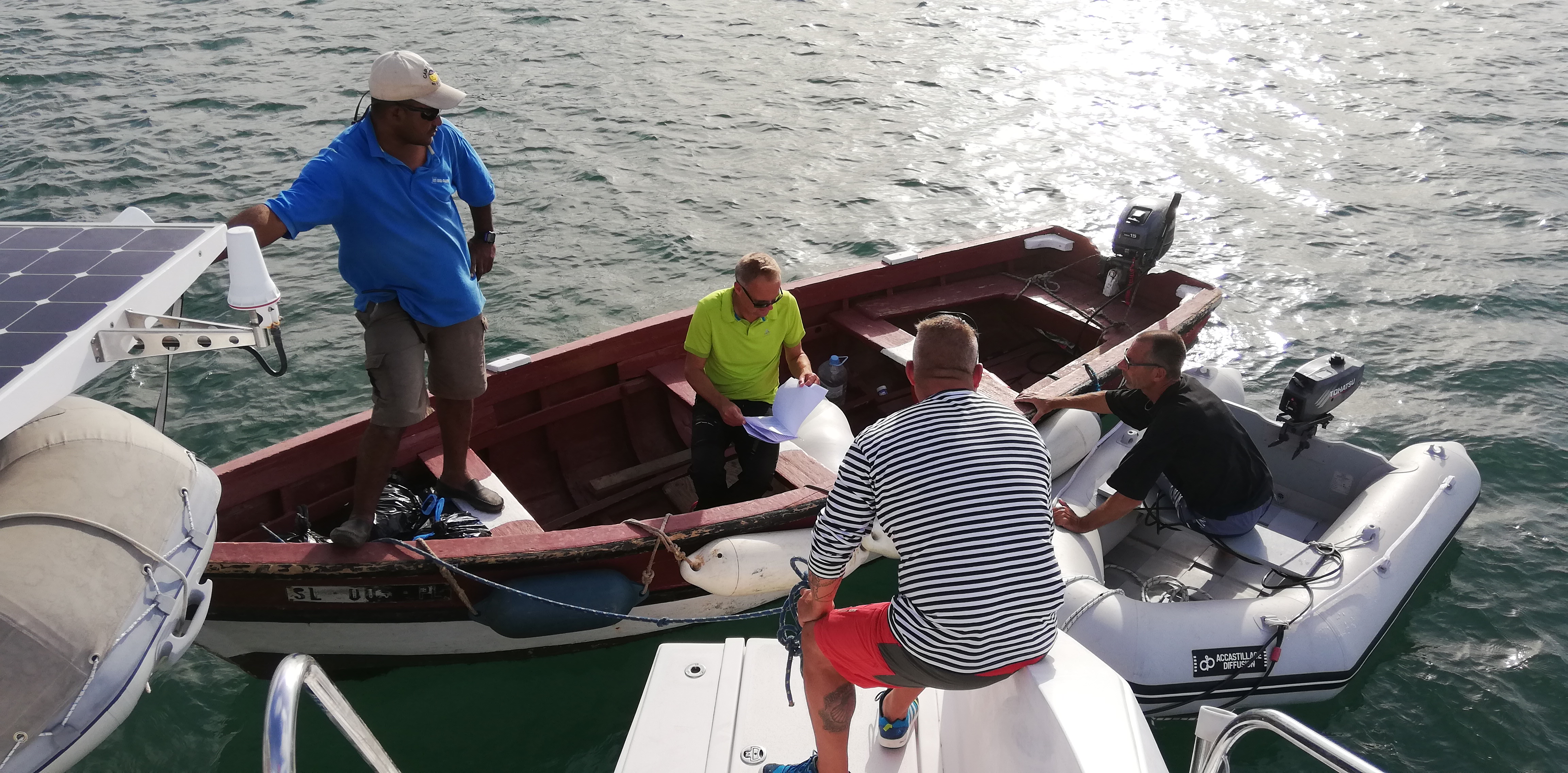 Einhandsegler Martin von der SY HEIN und „DJ“. DJ betreibt einen Taxi- und Yachtservice. Er koordiniert das Ankerfeld, entsorgt Müll, organisiert gemeinsame Abendessen und Ausflüge etc.