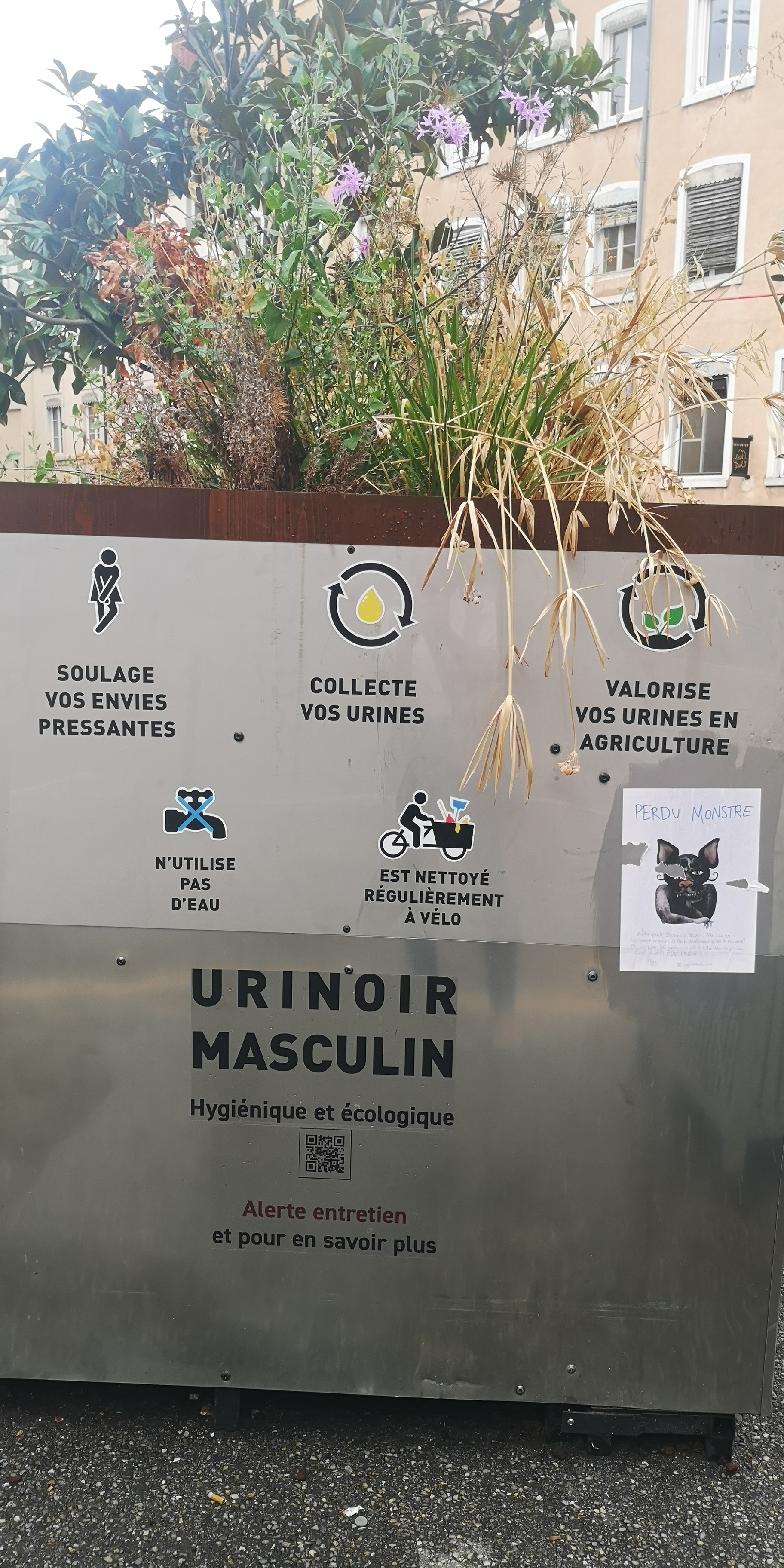 Unter anderem machen wir eine Zwischenstopp in Lyon. Im Bild eine der „geheimen“ Häusereingänge in der Altstadt. Damit sind 2 Strassen miteinander verbunden – man muss nur wissen, welche Tür man öffnen kann umd dann durch das Haus hindurch zur anderen Seite zu gelangen. Und eine interessante Idee für ein öffentliches WC: Der Urin wird gesammelt und als Dünger verwendet.