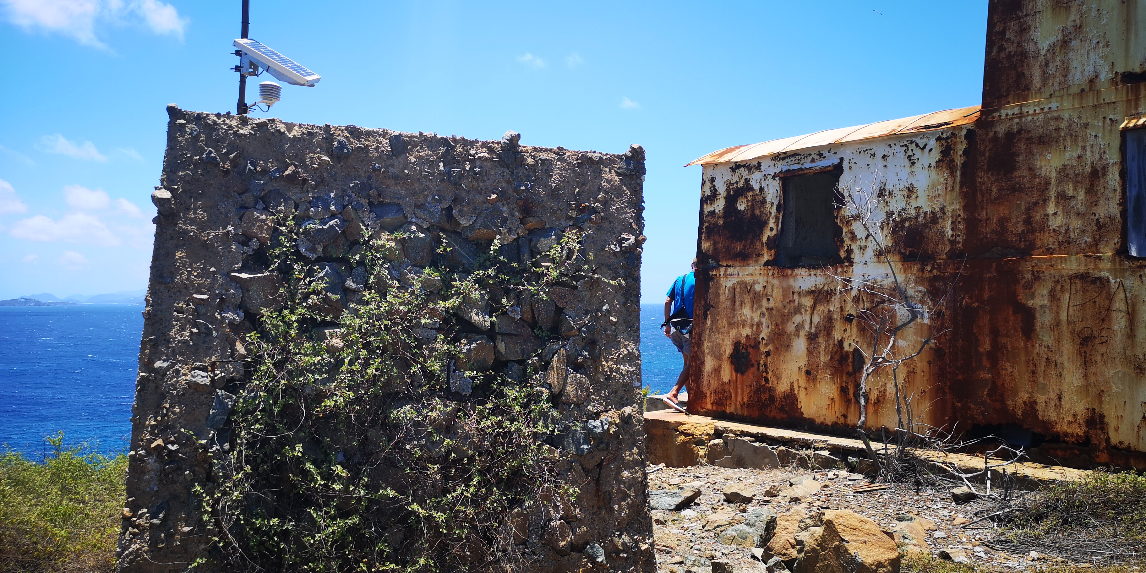 Alter dänischer Leuchtturm auf Buck Island (St. Thomas). Links davon der vermutlich vom Hurricane umgeworfene Funkturm.