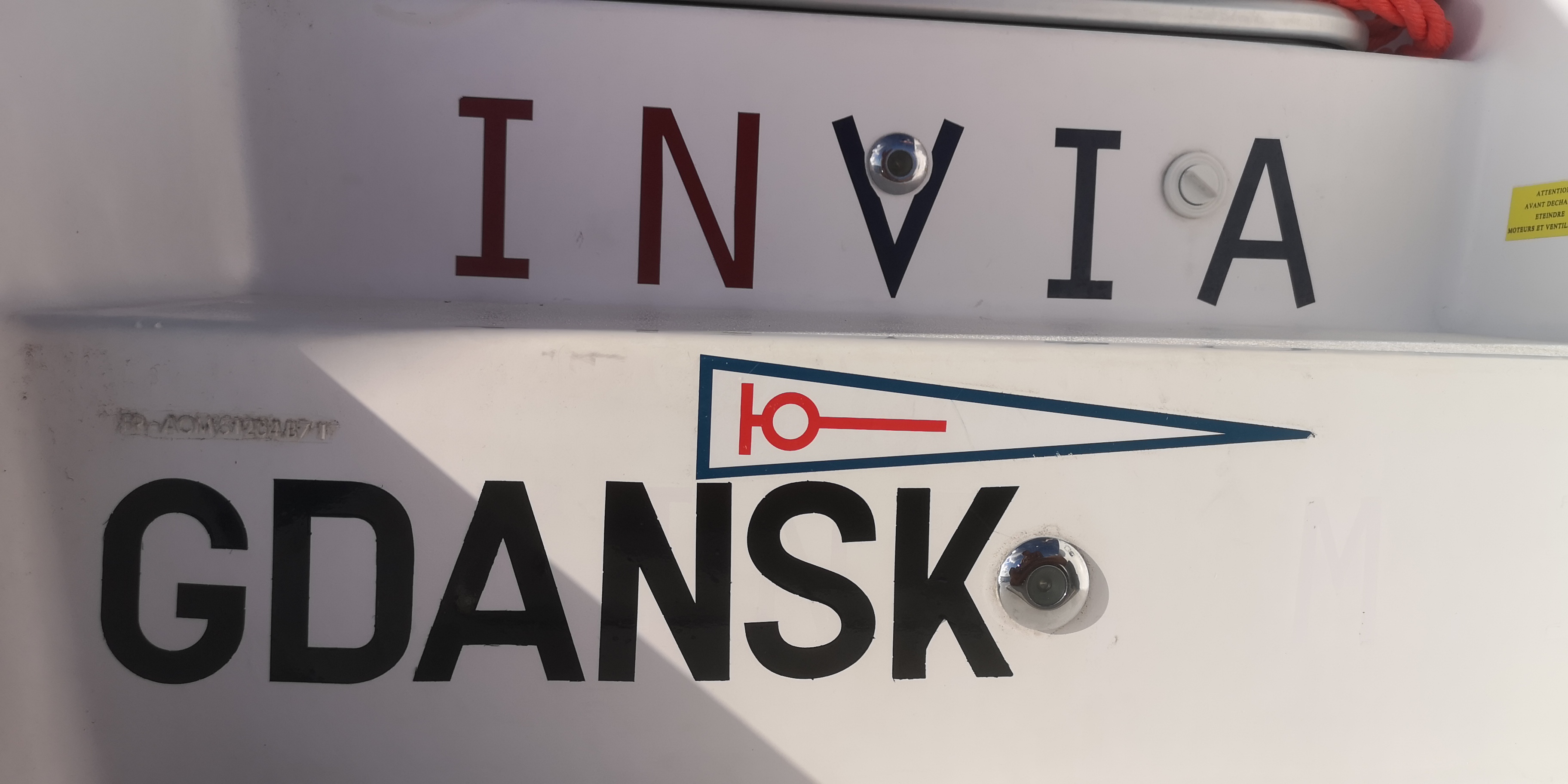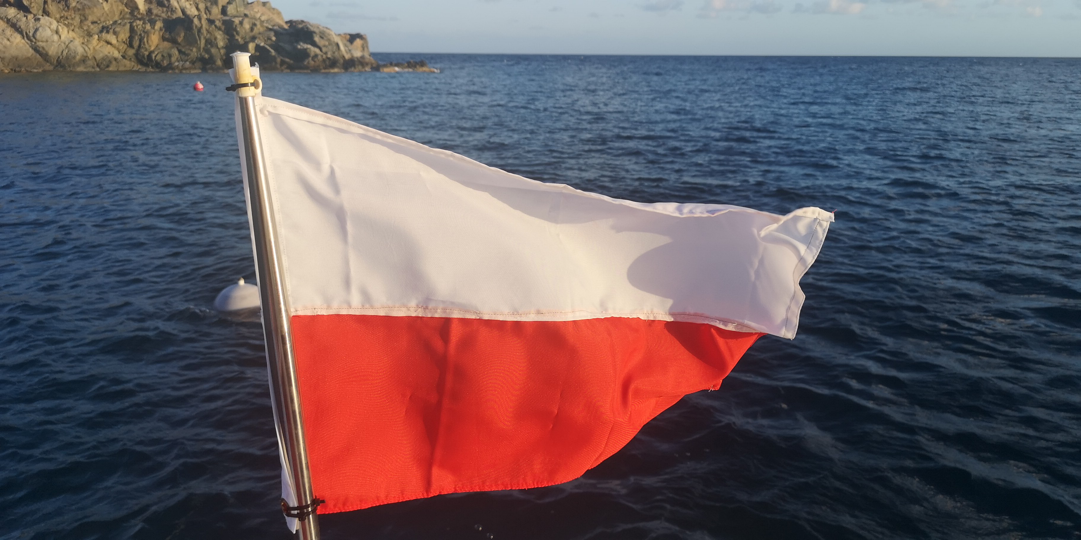 Die selbst genähte polnische Flagge weht nun am Heck der INVIA