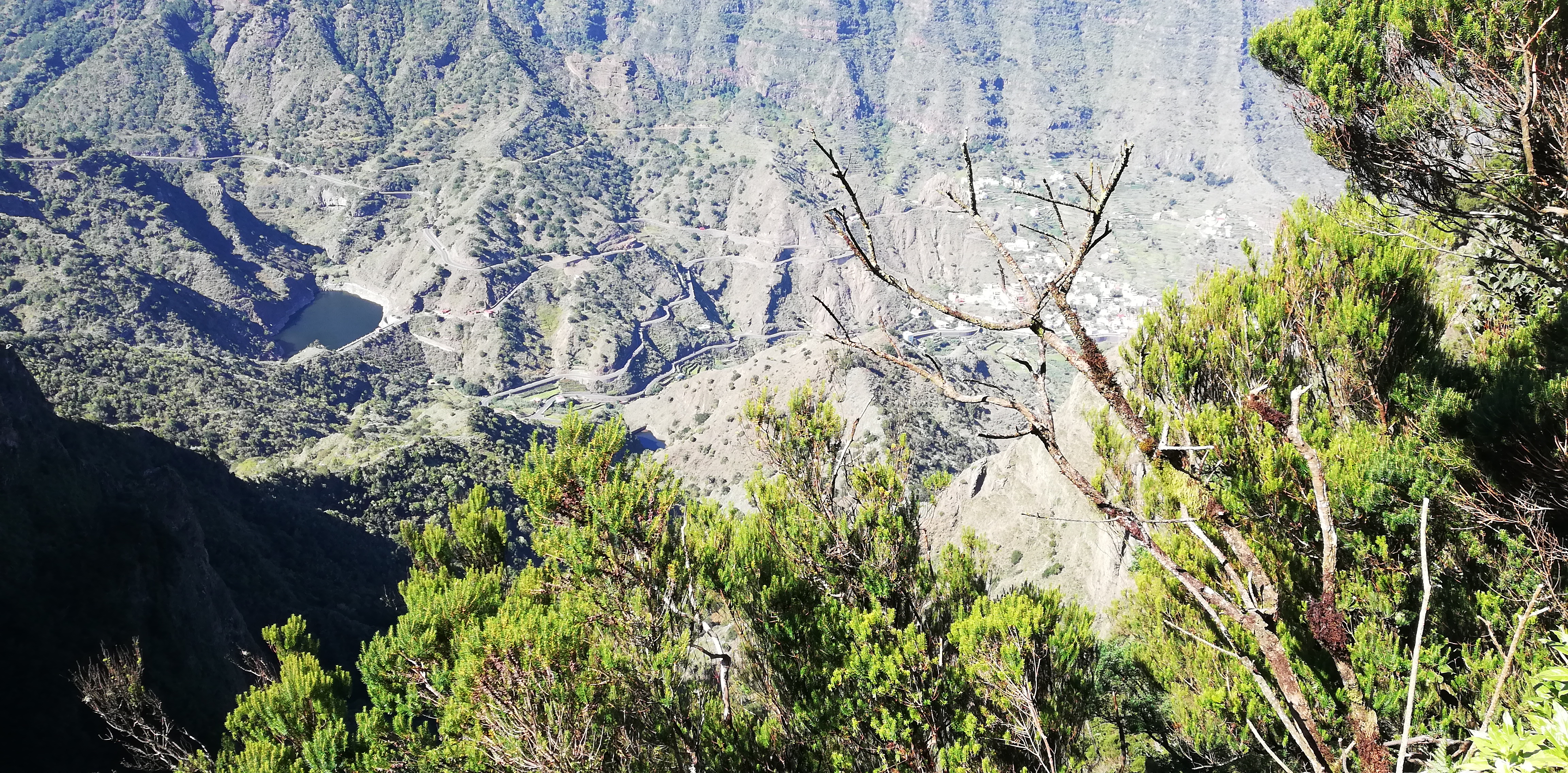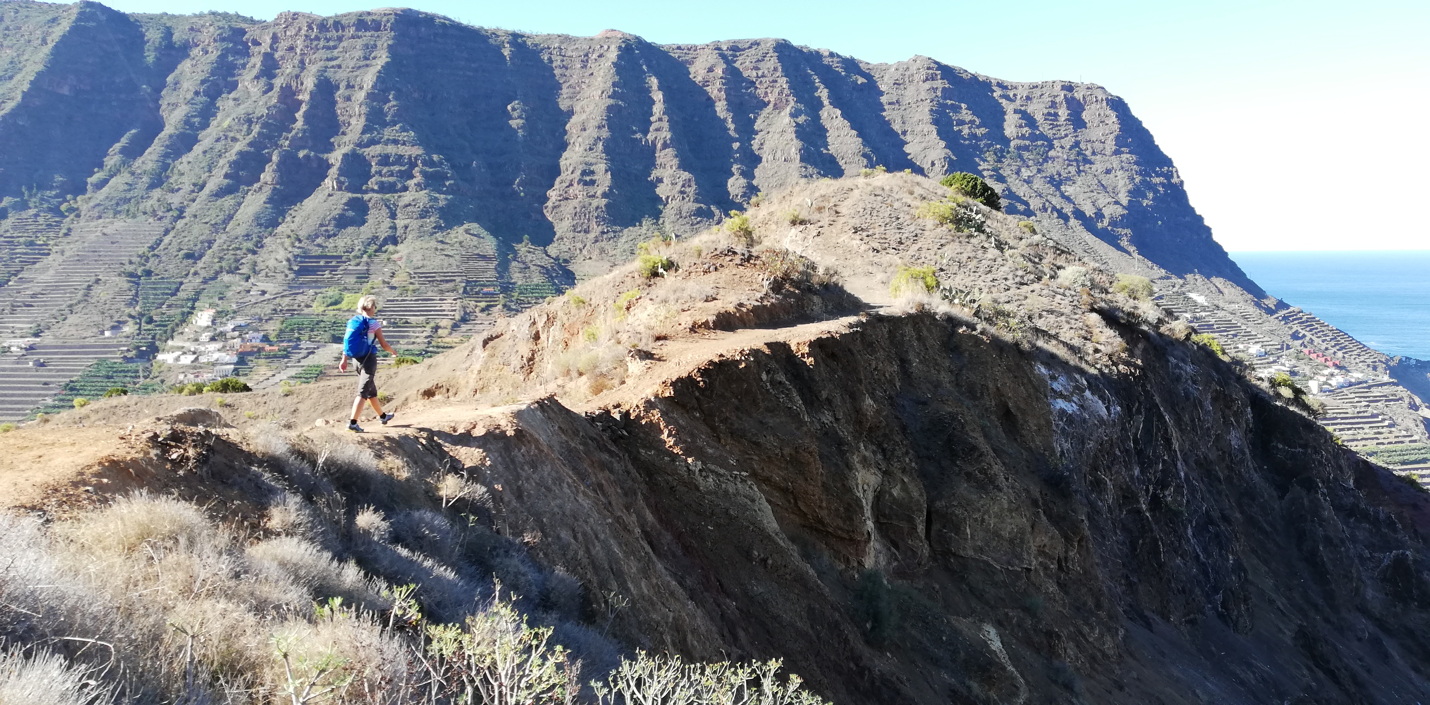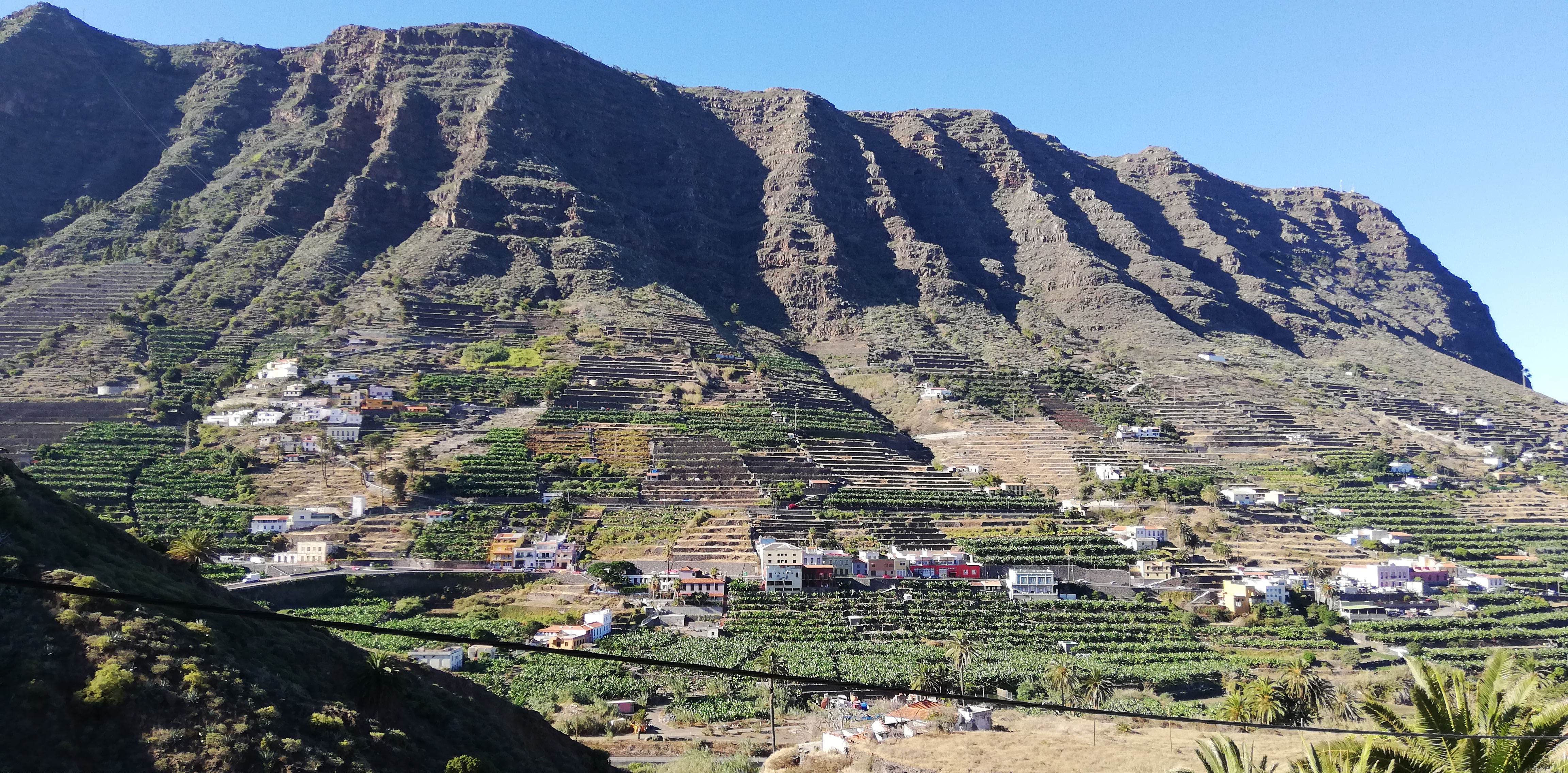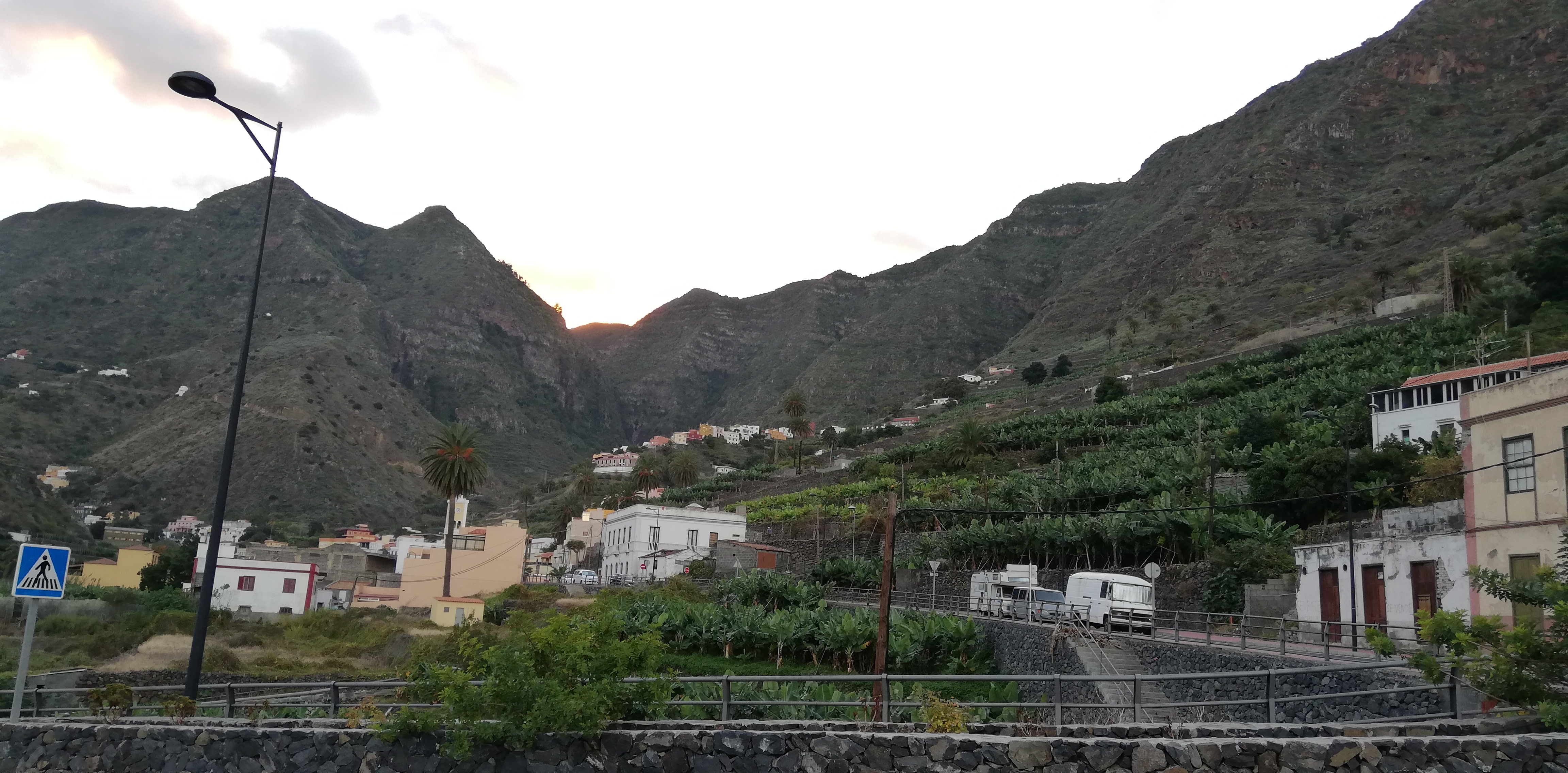 Der captain sehnt sich zusehends nach einem kühlen Bier und wird langsam ungeduldig. Dummerweise endet genau dann, als das Ziel Hermigua in Sicht kommt und die ersten Hütten erreicht sind, die Beschilderung des Wegs. Um Hermigua zu erreichen müssen wir noch über eine kleine Schlucht – und den Weg zu finden ist mühsamer als es den Anschein hat.