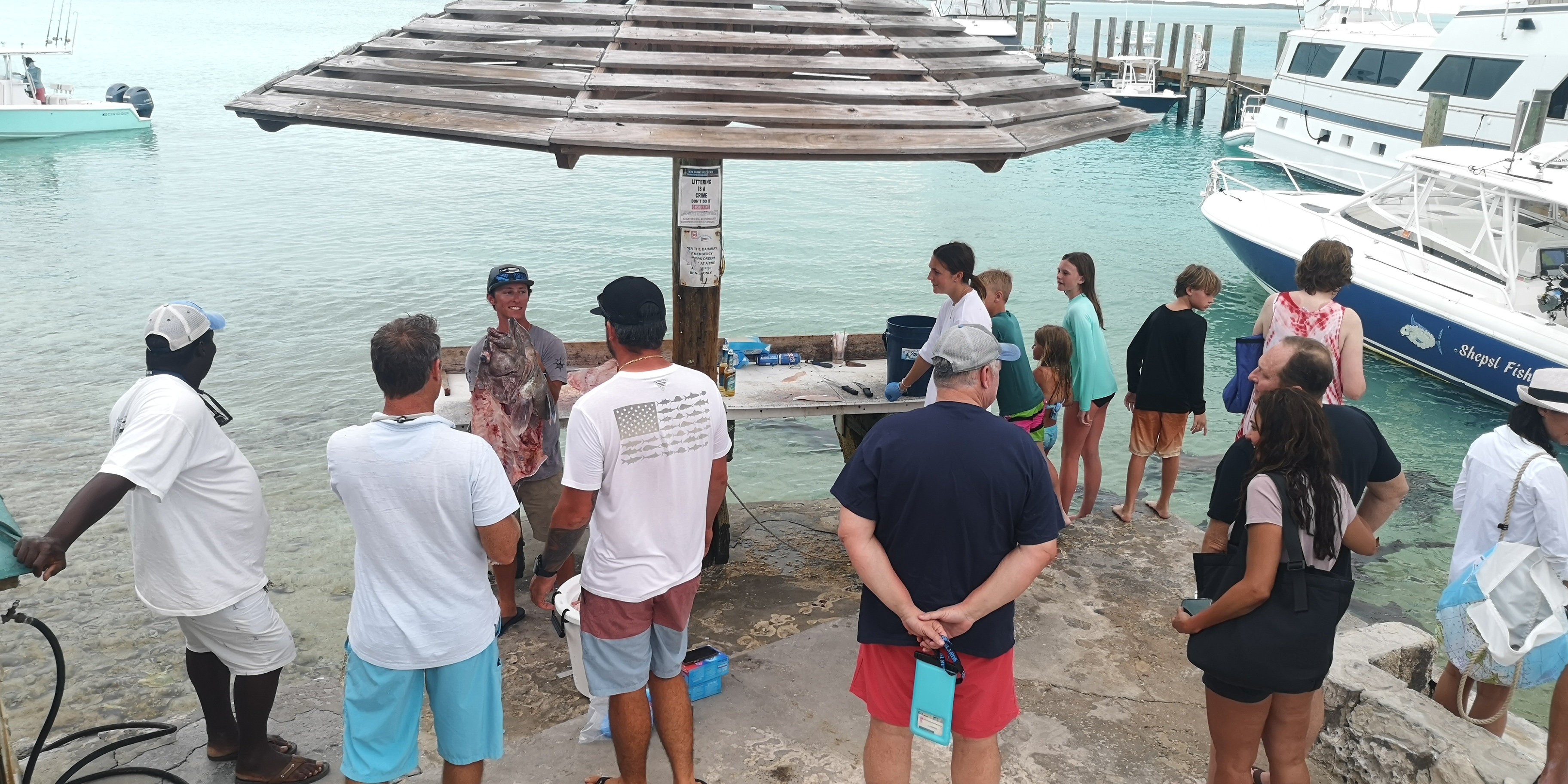 Als wir uns im Staniel Cay Yacht Club einen Drink genehmigen, kommt eines der zahlreichen Sportfischerboote von seinem Jagdausflug zurück. Der Fang – u.a. ein großer Nassau Grouper – wird ausgenommen und die Reste werden an die bereits wartenden Haie verfüttert. Bejubelt von den zahlreichenden anwesenden Touristen. Haie stehen in den Bahamas stehen unter strengem Naturschutz. Es sind faszinierende, majestätische Tiere – aber dieses Schauspiel finde ich widerlich. Trotzdem habe ich es mir angeschaut und gefilmt: